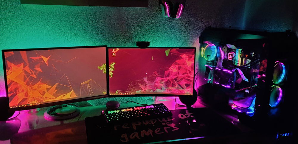 For all the outside components, I have two 27 inch monitors, which is so useful. On the pictures you can also see a wireless charging station and a google home mini.