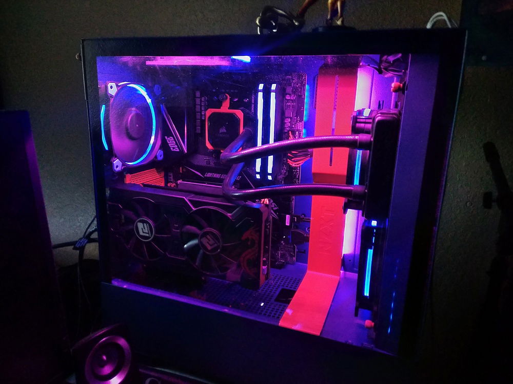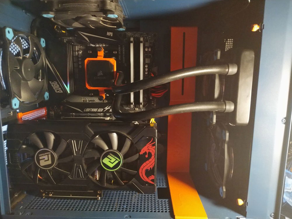 An upgrade to my previous build. I realize the processor is a little fast for my gpu, but i plan on upgrading the aging RX 570 in the future, but for now it's still performing above expectations for the games I play. The case is painted in satin navy with gloss orange accents. I was going for a sort of cyberpunk/vaporwave theme with the colors, either way I'm happy with how it came out. (The ssd is low capacity but it's enough for me)
