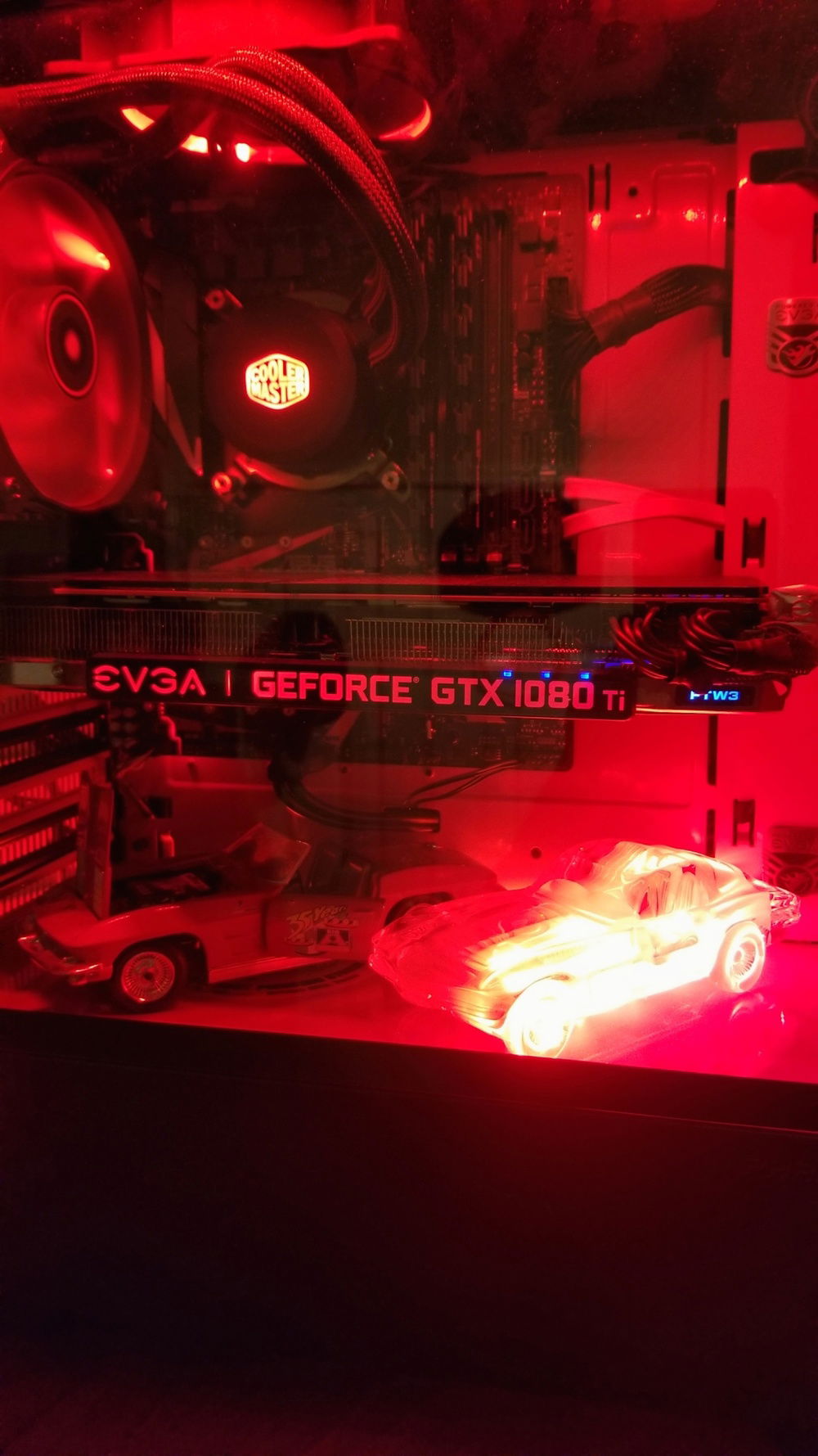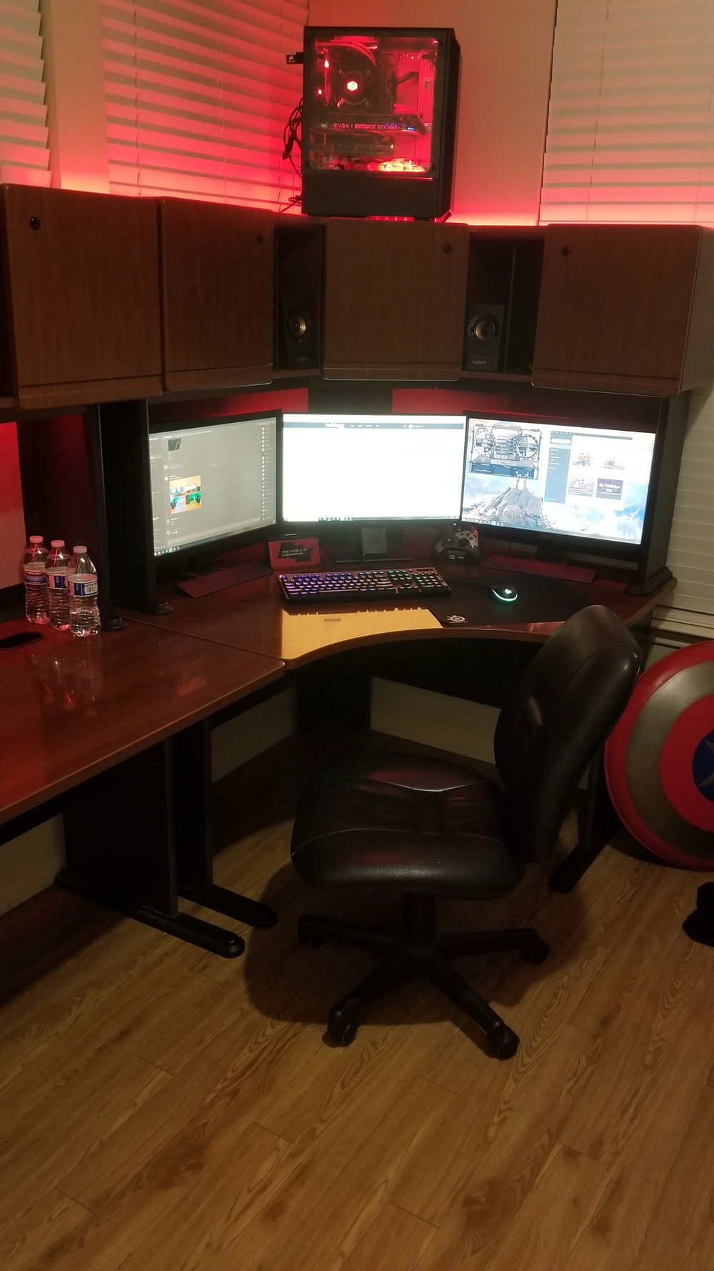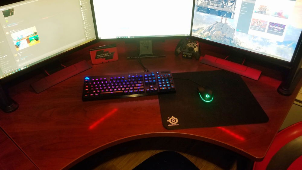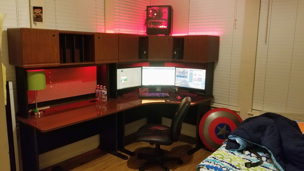 The story behined this build is long but the hook for this: The enitre setup cost me less than 1000 dollars. That includes the desk, the computer and all it's components, all the peripherals, the LEDs, everything. The name, Velocity Micro, is the name from my first build where I had a Lian Li case with the acryllic side panel had Velocity Micro milled into it, and I decided that the mATX mobo in my current build would be reason enough to carry on the name. When I started this build, I was... 16, I think? At the time I was working at a paintball field, and believe it or not it wasnt the most profitable job. After heavy penny pinching for months, I began to buy parts little by little. Now here is where my first example of some serious savings. I bought an Intel Core i5-7500 and an mATX Asus ROG B-350M motherboard for exactly 222.14 USD from Micro Center. This was several years ago, before the 8th gen CPUs came out, so buying current gen parts were something I did not think would be in the budget. Then I bought a Hyper 212 EVO with dual LED fans and red heat sink cover for 19.99 USD. One awesome find was Muskin Blackline DDR4 2400 MHz 16GB kit for 99.99 USD. Newegg also had a EVGA NEX650G PSU for 49.99 with a 3-year warranty. Then I bought a Sandisk Ultra III SSD 500GB for 109.99 USD. The final cherry on top was the EVGA 1060 SC 3GB that I managed to snag in a flash sale off Amazon (same place for the SSD) for 169.99 USD. My build was coming together pretty well, and after seeing how much I spent I figured I would just gut my current build and take the case, power supply, etc. and keep using it for the being. After a while, I found my golden goose. One of my friends was graduating high school, and he was going into the military for several years. One of the things he was getting rid of before he left was his rig. After talking for a little bit, I asked him if he'd let me see it. I came over, and after looking at specs, he was sitting on an absolute beast. Core i7-7700K, 16GB of RAM, GTX 1080, the whole enchilada. I asked him how much he wanted for all of it, his three monitors, keyboard, mouse, pc, and the headset. He didn't really know what he had, and he told me he hadnt even turned it on in months and would happily let it go for 600. I gathered all my savings but most of it was already in my PC. I knew I couldn't let the deal slip out of my fingers, so after some hard bargaining, I basically sold my soul in order to get my dad to loan me the rest of the money. I bought it all and immediatley cleaned it out and took pictures. This was right at the height of the mining craze, and that 1080 was worth its weight in gold. I sold it and shipped it off, making 600 bucks back just off the graphics card. I paid my dad back, then sold the rest of the PC for 400. Bam, Just made my money back plus some! Now comes the rest. Just recently I bought a EVGA 1080 ti SC2 on ebay for 450, not a bad price at all. I got the product, and once I got it, it didnt work. I contacted the seller and ebay, and after a week long headache, I managed to get my money back from ebay, and the seller still refused to give me a return address. I told him he sent a defective product even with the proof I had with the multiple videos I took, going so far as uploading a raw uncut half hour demonstration with an altimeter and other graphics card working in the system. Then the seller told me it was even still in warranty and if I was that sure that it was defective, send it to EVGA and they would prove him right. I called EVGA and they gave me all the info in order for me to send it to them (it was still in warranty). EVGA customer service is awesome by the way, super fast and no redirects. I sent them the card and they called back in about three days telling me I could get a new one. Once it got to me, it pot got even sweeter as I opened the box to find a brand new EVGA 1080 TI FTW3 (I called and asked for the history for the serial number of the card and had been sitting there since the manufactured date.) Lastly, I got the desk for 100 bucks on craigslist, its a Bush Hensen Cherry desk, brand new it's 2000 dollars, link because I know you wont believe me: https://www.bushfurniture.com/ProductFamily.aspx?pf=139&ProductSKU=SRA061HCSU&Finish=HansenCherry . I got both the speakers (Logitech Z533) and headset (Corsair Void Pro) for 100 bucks from online as well. The surge protecter and LED lights are from work, got it all for 20 bucks. The monitors (Main one Dell 24" G SYNC S2417DG sandwiched between two BenQ 24" RL2455S), keyboard (Logitech 810 Orion), and mouse (Logitech G203) were all free once the graphics card I sold paid for the entire setup. Once I had the 1080 I sold the 1060 for 120 bucks to a friend. Once you do the math, and add in the profits i made from selling the other pc parts, I come in well under a thousand for a fantastic rig imo.