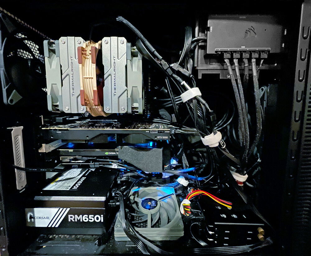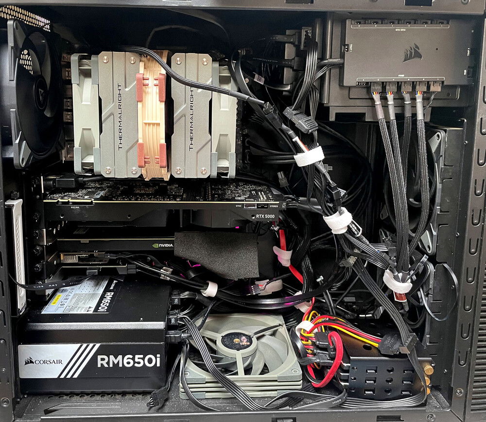 This is my vGPU server powered by Proxmox. Basically multiple private cloud gaming PCs in one machine. Powered by a AMD Ryzen 9 3950X that I got "for parts with bent pins" on eBay for a great price ($135USD) in an Asrock X570S PG mobo. When I ordered the mobo I initially got it for it's fanless chipset cooling but it ended up having the perfect PCIe slot layout for my needs. All in a Fractal Define R3, as I have multiple R3-R6 cases to chose from & the R3 I feel has the best sound dampening. Using a Corsair RM650i as it's all the power I need & it gives enterprise server like features as the Corsair PSUs are natively supported in Linux. Using a software package called "CoolerControl" which let's me control fan speeds based upon custom fan profiles/settings. So the passively cooled Tesla P4 can be cooled with a 40mm (15K max RPM) fan & have it fully controlled based upon that card's GPU temp. The Quadro RTX 5000 I got for a great price & let's the system support Ray Tracing based titles. The Tesla P4 is split into 775MB based VMs as the profile's resolution is limited to 1280x1024 & used to play early-mid 2000s based games so plenty of VRAM for those titles. I'm using mostly Parsec to remote in but I also run Sunshine/Moonlight as a backup method along with AnyDesk. I wanted a "NAS" that's always available to these VMs so I put in an Icydock 3x 3.5" Hotswap cage & use Samsung 860 Evo 1TB drives in a RAID5 so about 1.8TB of usable space. Went with Samsung drives as they show the remaining life directly in the Proxmox UI so I don't have to login via SSH & manually check them regularly. Even under a load of 6x concurrent users the system stays pretty quiet which is pretty nice for what's it doing.