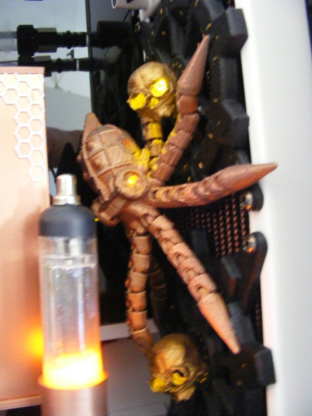 Many of the pieces used for the decoration were printed in 3d and the colors characteristic of steampunk. For the lighting I used rgb led which was the challenging part of the project because it consisted of creating the lighting and based on arduino creating the controller to be able to change the colors and the part of turning on and off everything via software. I hope you like it. Thank you very much.