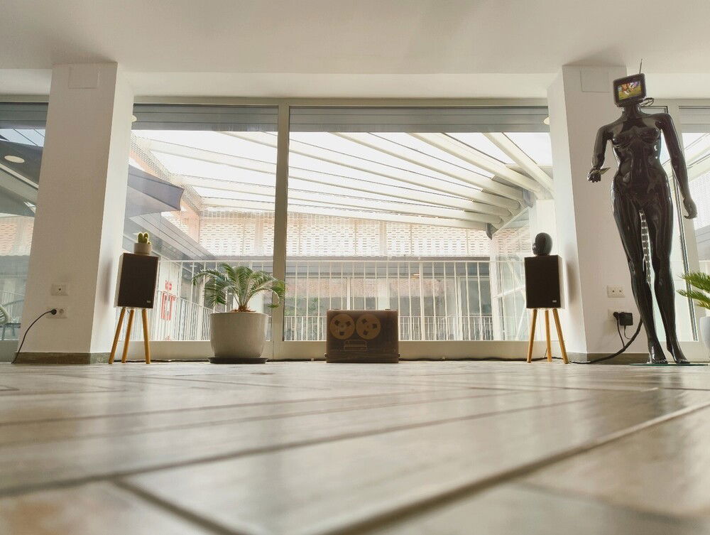 The reel-to-reel player and speakers in the first photo are the audio output for the PC, with the reel to reel being used as an amp for the speakers. VU meters and everything else works on PC audio input