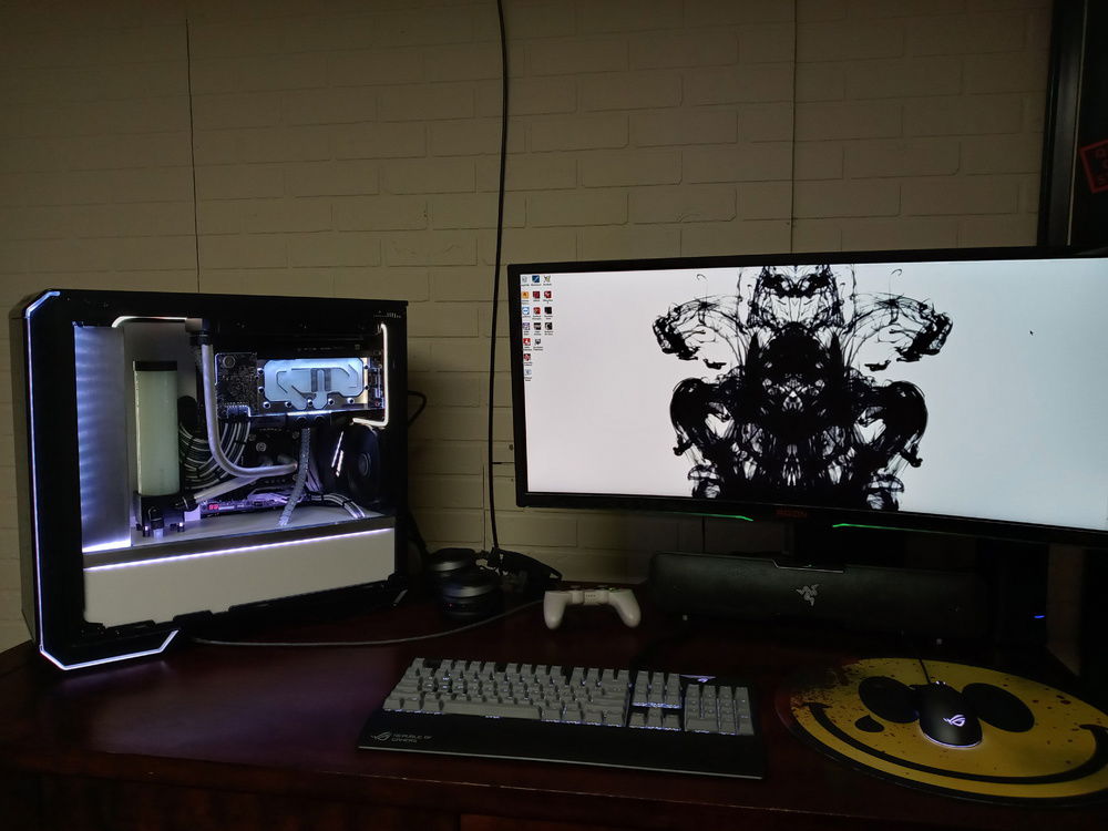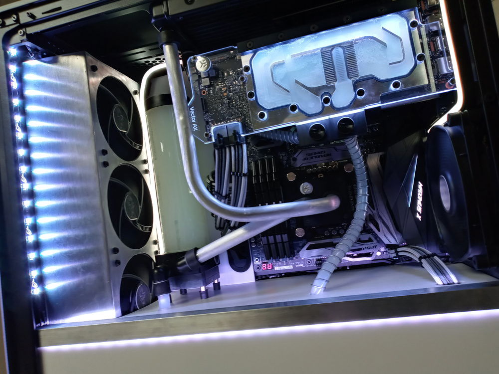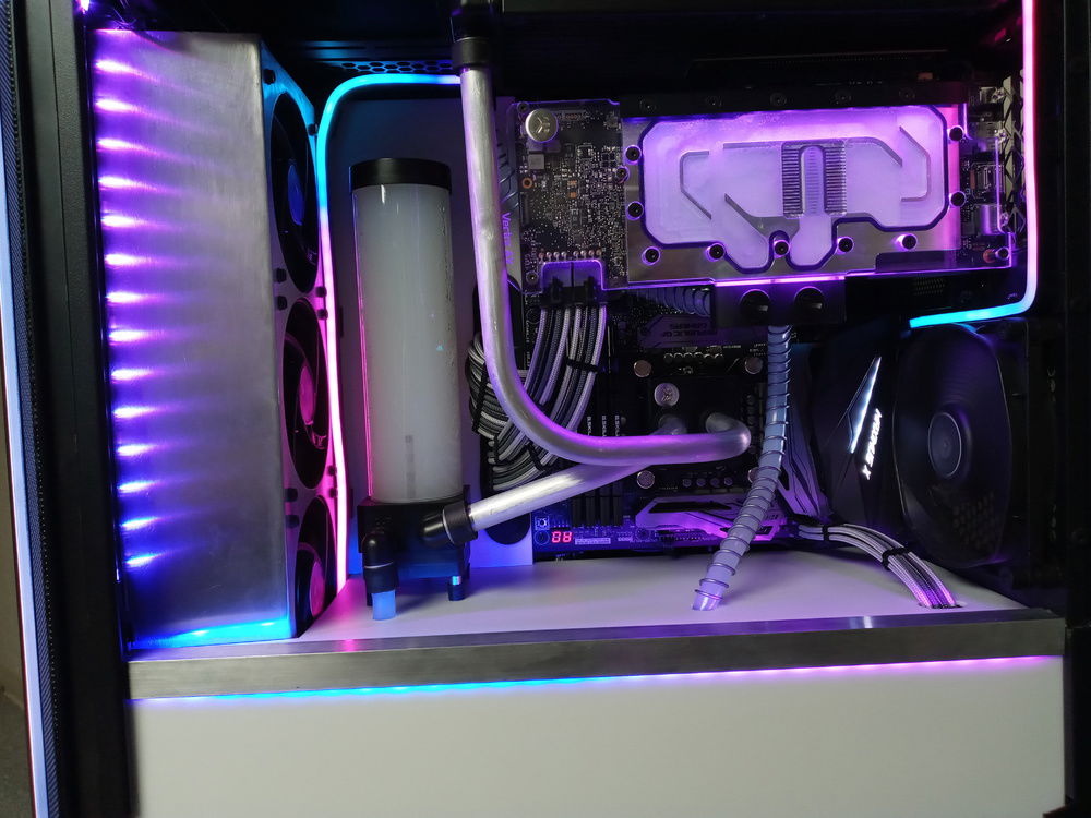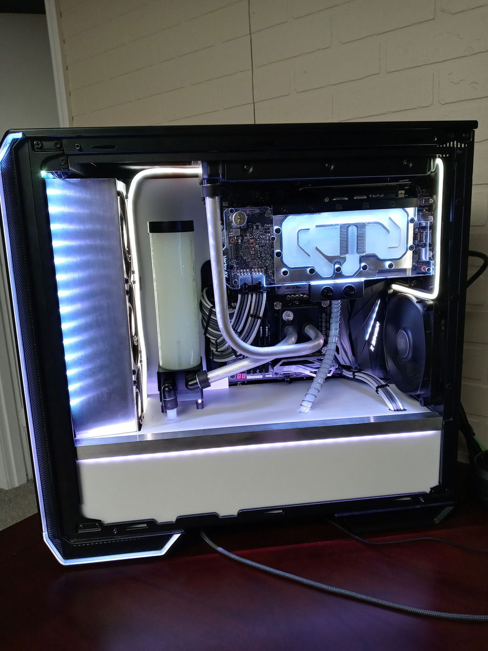 Volt is the final form of nAVI and is quite different aesthetically. I inverted the dark base 700 and replaced the pained black panels with satin white panels. I swapped the EK Vardar fans with be quiet silent wings 3 fans. I added 3 more fans to the front 360 rad making it push/pull. I also made a fan shroud out of aluminum for the front fans and rad. I swapped the gtx 1080 for a rtx 2080ti and used a much nicer looking acrylic block. Swapped the trident z 2x8g 2400 kit for a ripjaws v 4x8g 3200 kit. The lighting was upgraded wit two phanteks neon strips and a custom light bar on the psu shroud. I chose to keep some soft tubing and added to prices of 13mm aluminum pipe to give the build a lot industrial look. I kept the custom cable mod cables but ordered another pcie cable for the rtx 2080 to.
