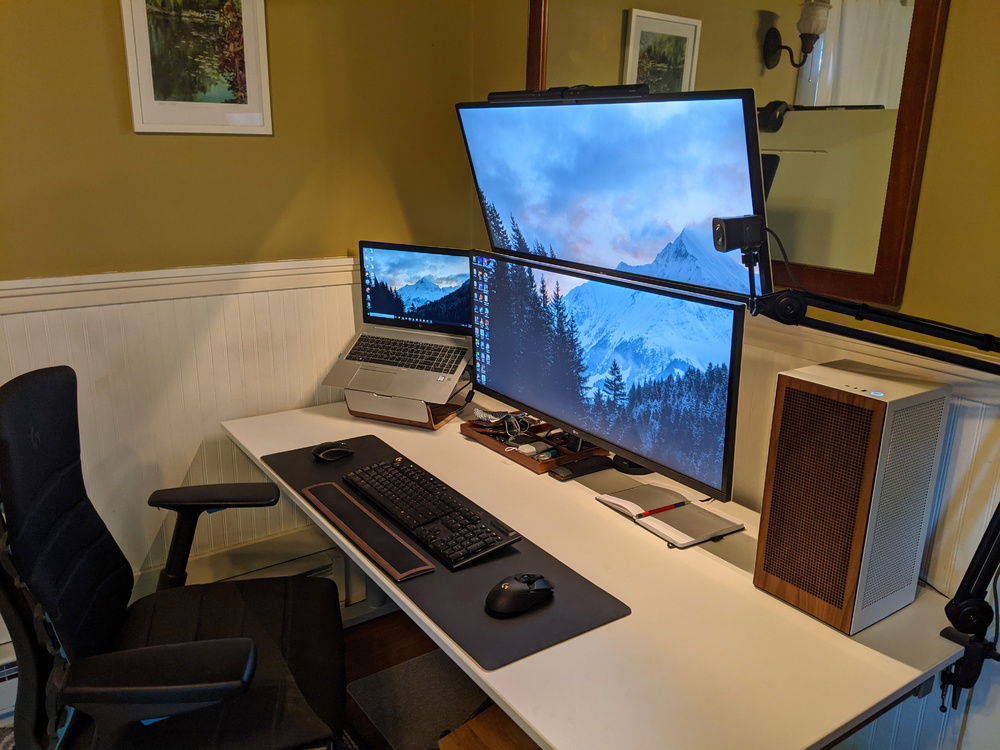 First SFF build! Used a Linkup PCI4 riser cable to avoid the H1 fire issue and did several of the more popular case mods including: 3x 40mm Noctua rear fans for the GPU, stock 140mm AIO fan for a more quiet Noctua, stock 650w PSU with a Corsair SF 750, and replaced the panels with Artesianbuilds walnut panels. Gaming temps max in the low 70s and idle 40-50. Considering changing to all liquid cooling in the future.
