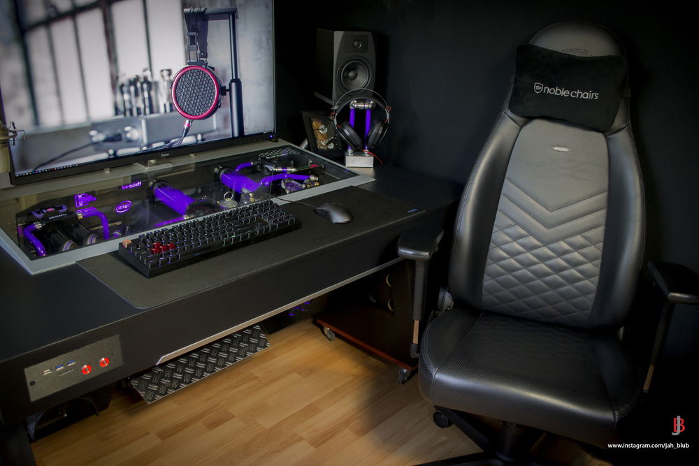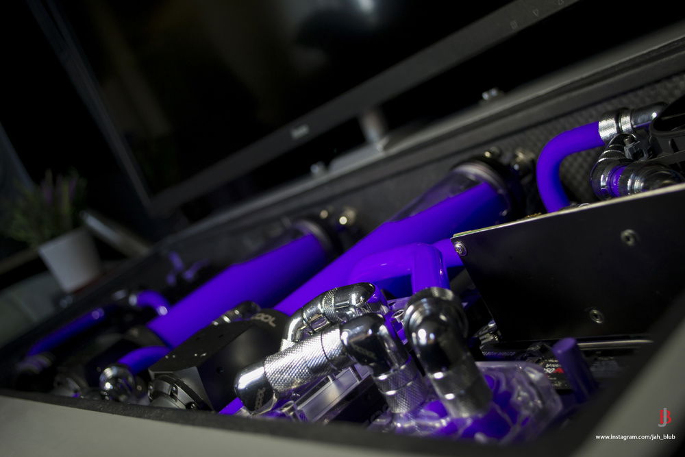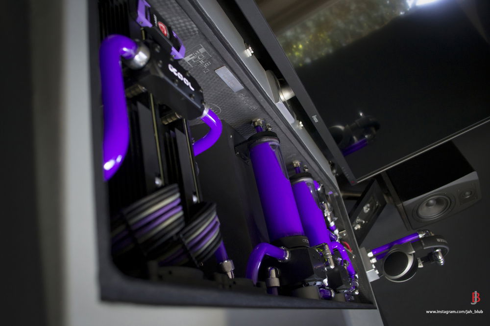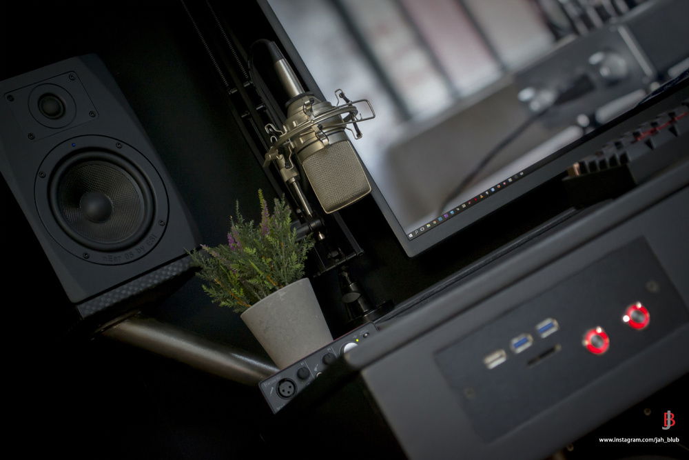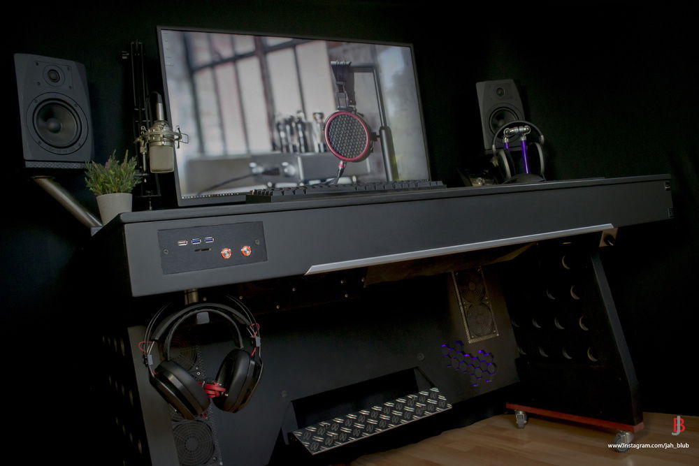 Custom parts : Custom painted - Desk - HDD Clock - Desk from MDF and from aluminium and steel - Backplate RAID controller from aluminium painted black - Reservoir mount from aluminium - Cables and custom sleeving - Temperature screen powered by Arduino Uno - Steel Stands for Studio Monitors - Monitor stand - Headset stand from aluminium and liquid cooling parts - Fan grill from aluminium - Footrest from aluminium Checkered plate - lighted Logos