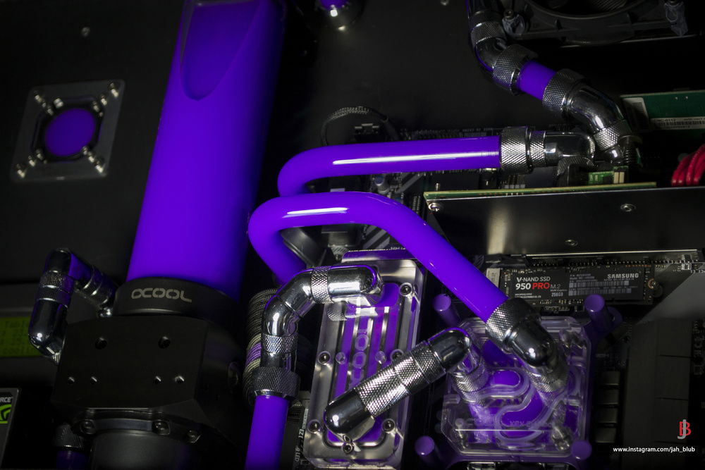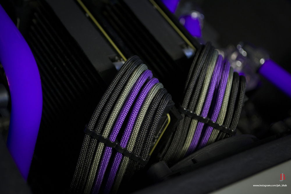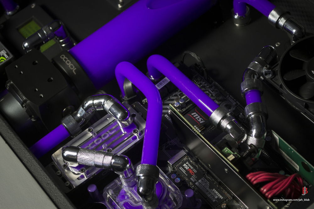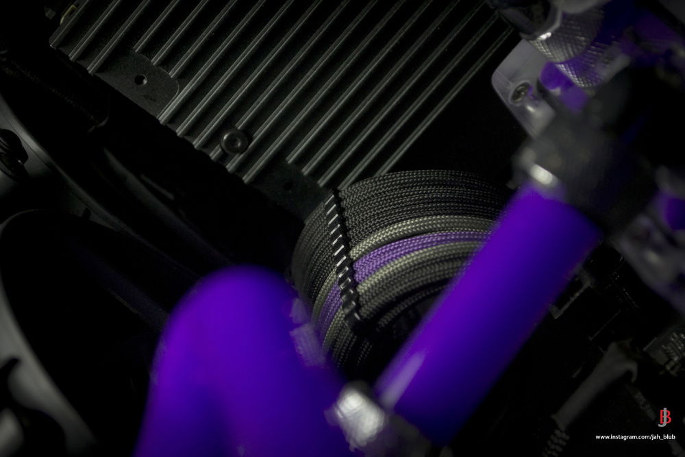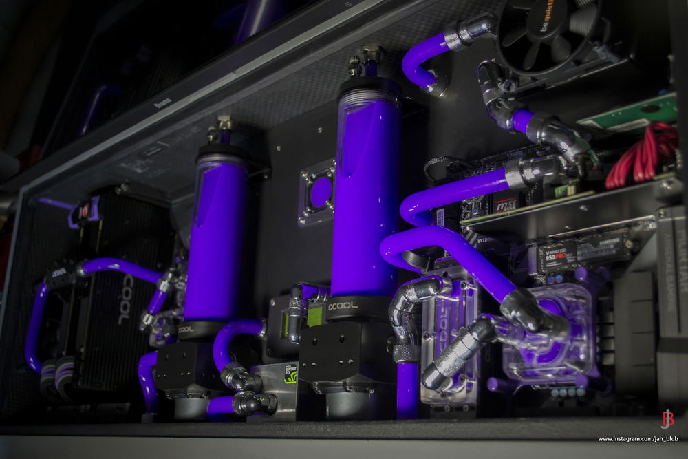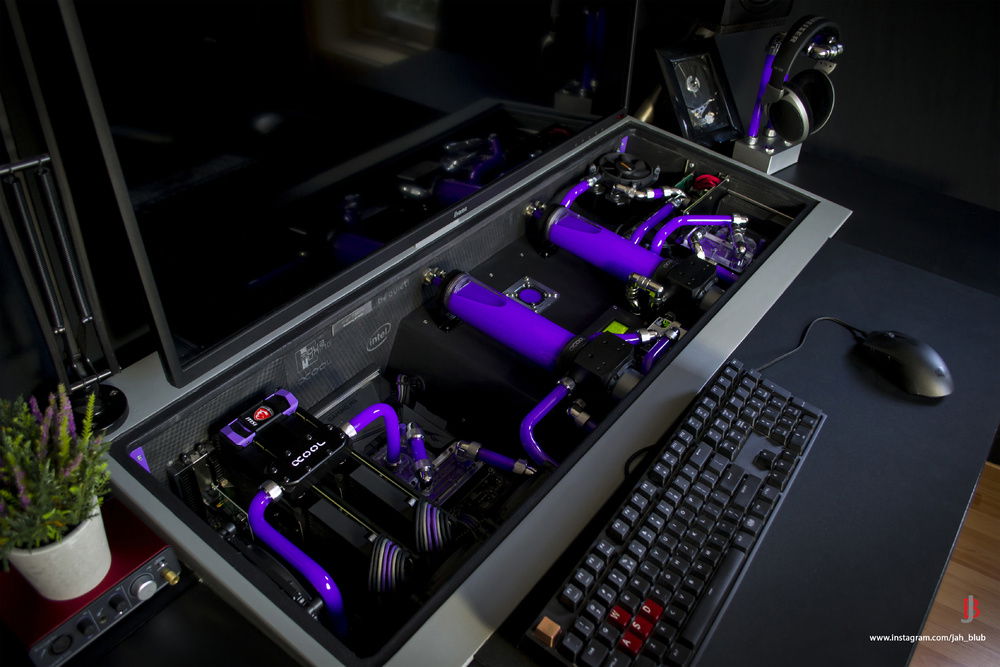 Custom parts : Custom painted - Desk - HDD Clock - Desk from MDF and from aluminium and steel - Backplate RAID controller from aluminium painted black - Reservoir mount from aluminium - Cables and custom sleeving - Temperature screen powered by Arduino Uno - Steel Stands for Studio Monitors - Monitor stand - Headset stand from aluminium and liquid cooling parts - Fan grill from aluminium - Footrest from aluminium Checkered plate - lighted Logos