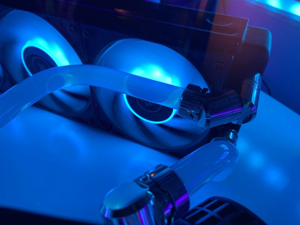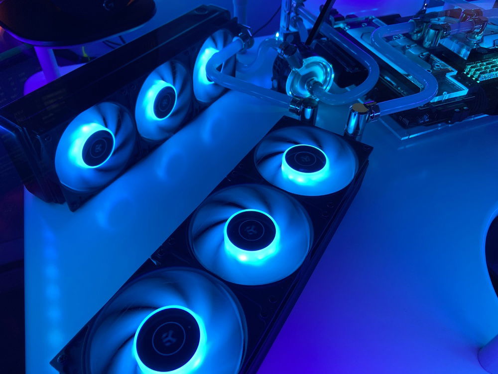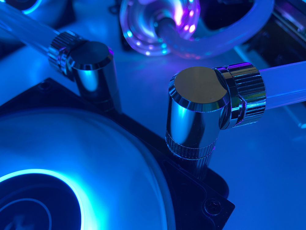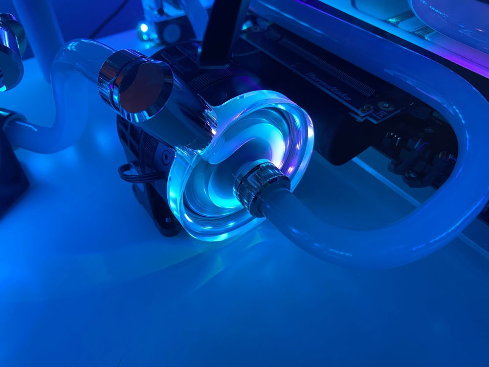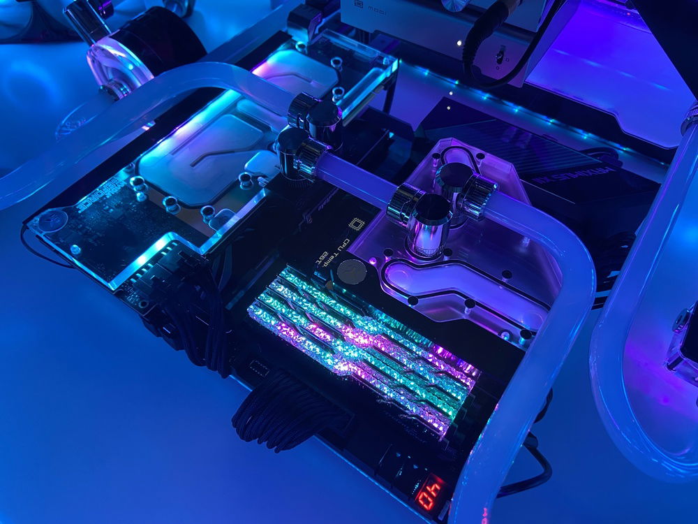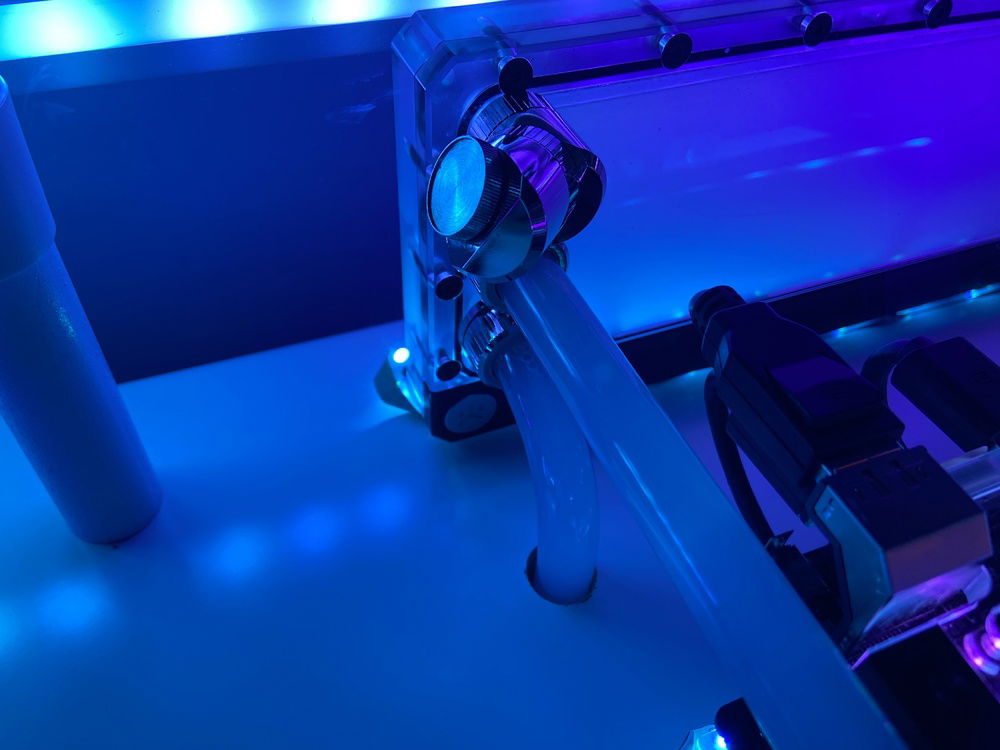 Little montage I put together of the build https://www.youtube.com/watch?v=2v0lbQXXICQ&t=32s . I always wanted to create my own watercooled desk when I first got into building computers about 6 years ago. After months of planning things out I decided to go for it and this is what I came up with. This is technically the 3rd iteration of the build. It has gotten more complex, sleek and thinner over the course of the past year. She started life as a sit stand desk from Autonomous AI and after a bunch of work and perfectly drilled holes this is the result. Parts lists says cooler master test bench but I used an acrylic motherboard tray. Had to put something to post it. I hope you all enjoy!!!