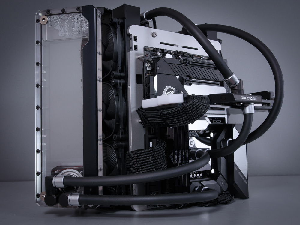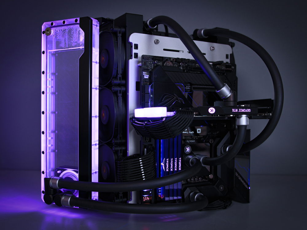 I opted to use an EK-FLT360 D5 pump/res combo as the heart of the system, which I side-mounted off the left radiator. What is awesome with this setup is what I can have the PC laying down on the radiators for that typical test bench style, and still have the pump/res fully functional. I did not get any photos of this orientation though, as the standing style is definitely my favourite. As an added bonus, the standing orientation saves space as well!!