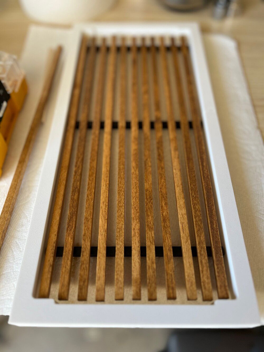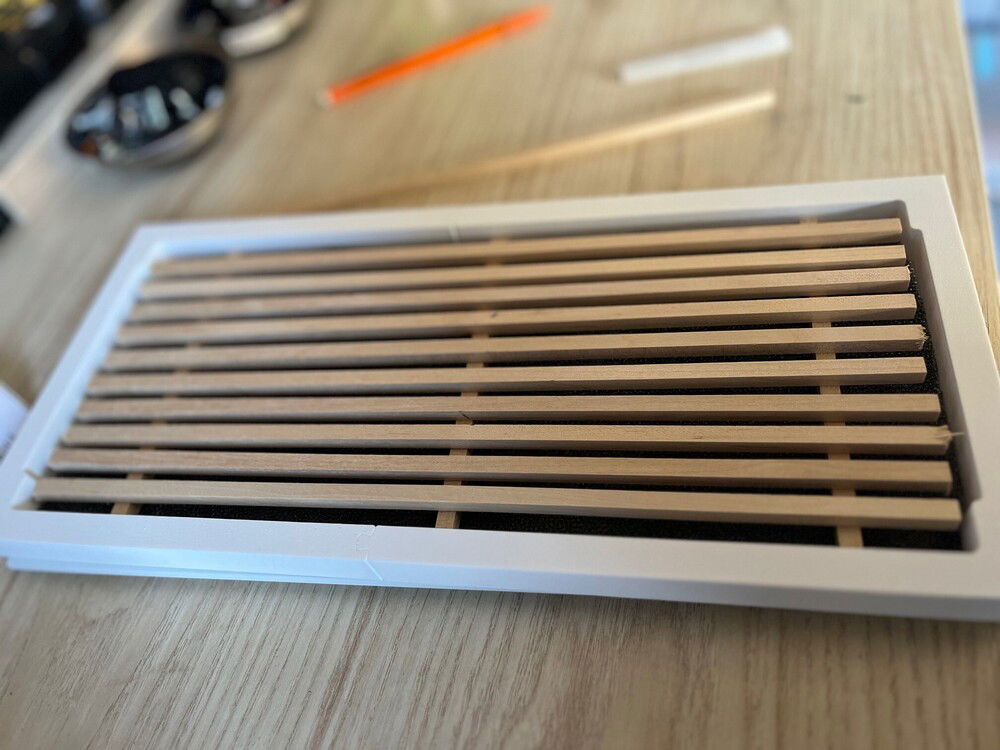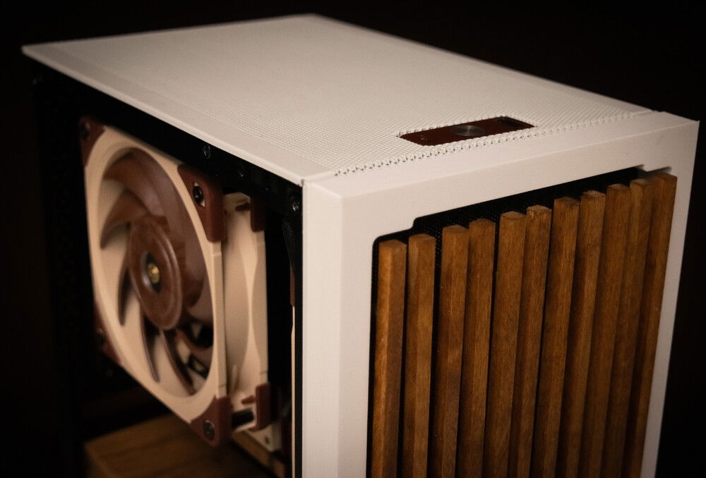 As we looked at cases, she loved the Fractal North and the white Meshy. She was disappointed that the Fractal North did not come in a SFF size. So, the idea popped in my head to DYI our own SFF Fractal North using the Meshy . . . I mean Fractalicious. The Fractal Northesque wood trim was made from Poplar 1/4 inch slats. They were stained with golden oak stain. I used "non-destructive" methods to adhere the front panel extender using magnets. The wood trim was assembled using wood glue and attached to the front panel using magnets. She loved the way the build turned out! For me, a fun PC mod project.