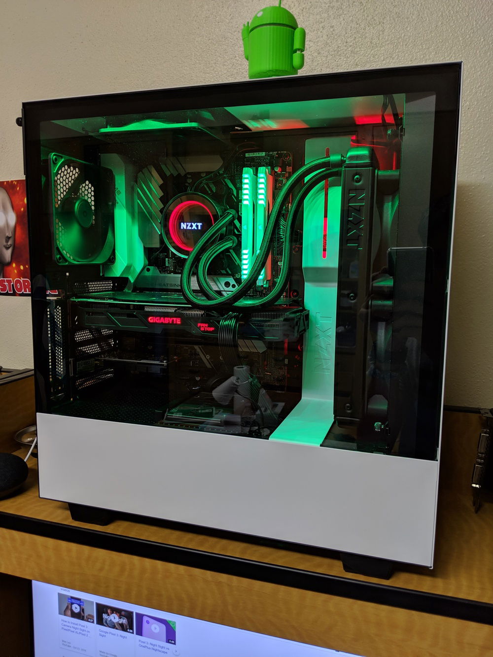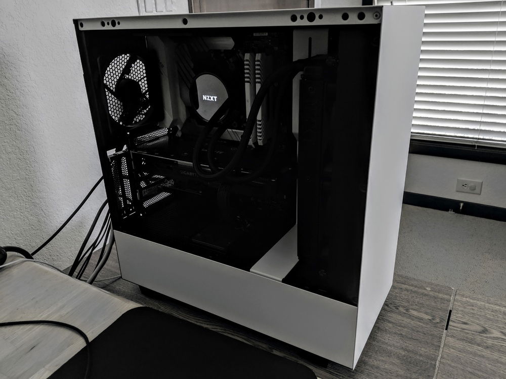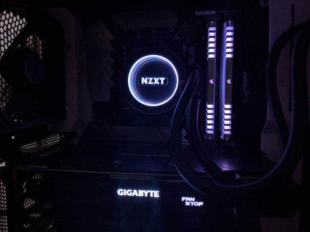 I've been planning to do this for about a year and I finally decided to buy all the parts and build it. I was going for a black and white themed build and the NZXT H500 was the perfect case. It matches perfectly with the Kraken x52 cooler I used for the Ryzen 2600x (although it took 4 tries to mount it correctly to the radiator bracket XD). I probably would have gotten a founders edition 1070 when Nvidia had it in stock, but I bought the Gigabyte 1060 3 months ago during the crypto-mining craze, thinking I would build it then, but school got in the way, and I didn't have time until now. This will be an amazing upgrade from the Intel HD 620 integrated graphics I was playing on earlier. It should be perfect for 1080p gaming and schoolwork.