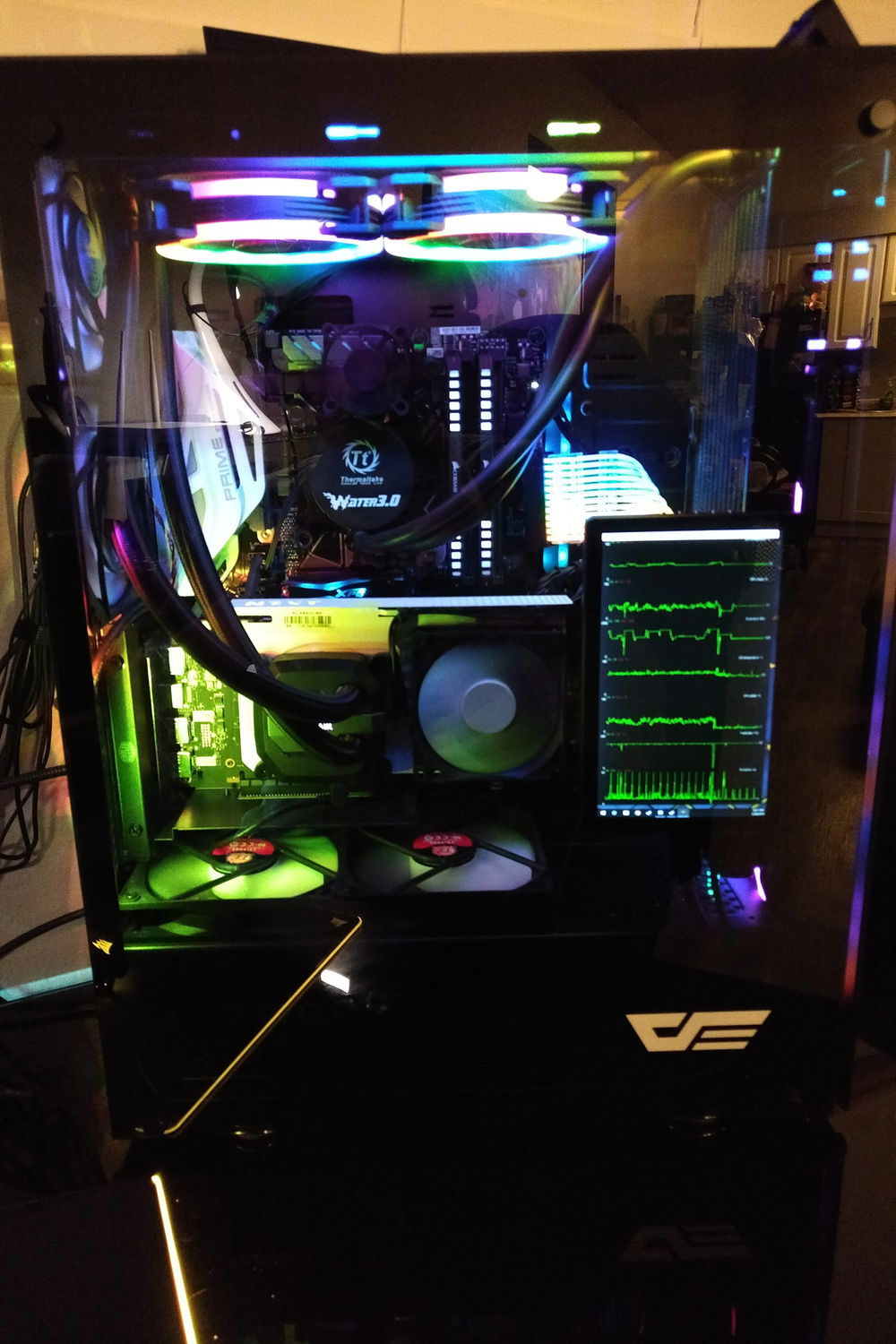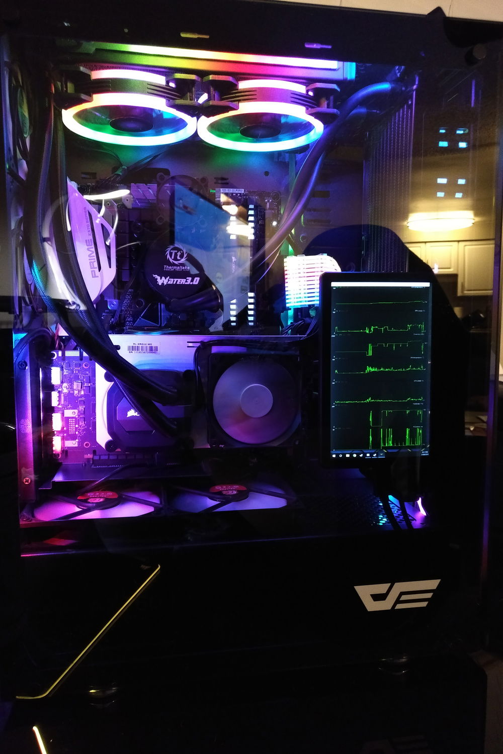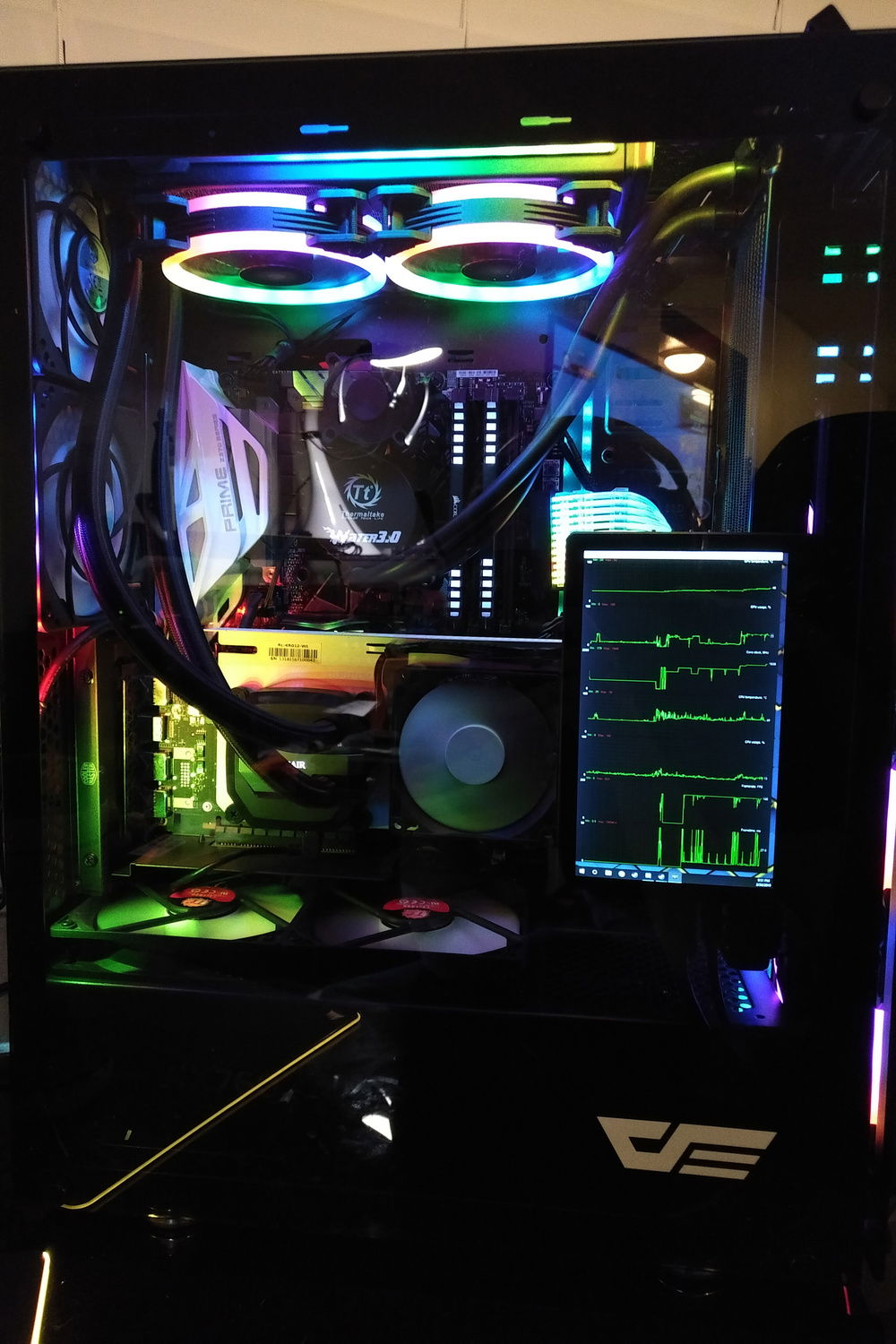 -I7 8086k (Thermaltake Water 3.0 Ultimate 360mm) -16Gb Corsair Vengance LED DDR4 3200Mhz (Non RGB White LED) -Galax GTX 1080Ti Exoc White (NZXT Kraken G12 AIO Mod with a Corsair H100i V2 and Cooler Master Vertical Mount) -Asus Prime Z370-A Motherboard -Intel 660p 500Gb NVME SSD (ADATA XPG Storm RGB M.2 SSD Cooler) -Hitachi 3Tb 7200RPM HDD -Lian Li Strimer addressable 24 pin RGB Cable -Two Silverstone Addressable RGB Strips -Corsair AX760 80+ Platinum Power supply -Internal 1200x720 Display for Temps and Statistics powered by an internal 5v USB through a Molex Connector -DarkFlash Phantom Black with 2 extra white 120mm fans as intake from the bottom and 2 white Slim 120 fans as intake from the rear (50mm fan on the motherboard VRM Black)