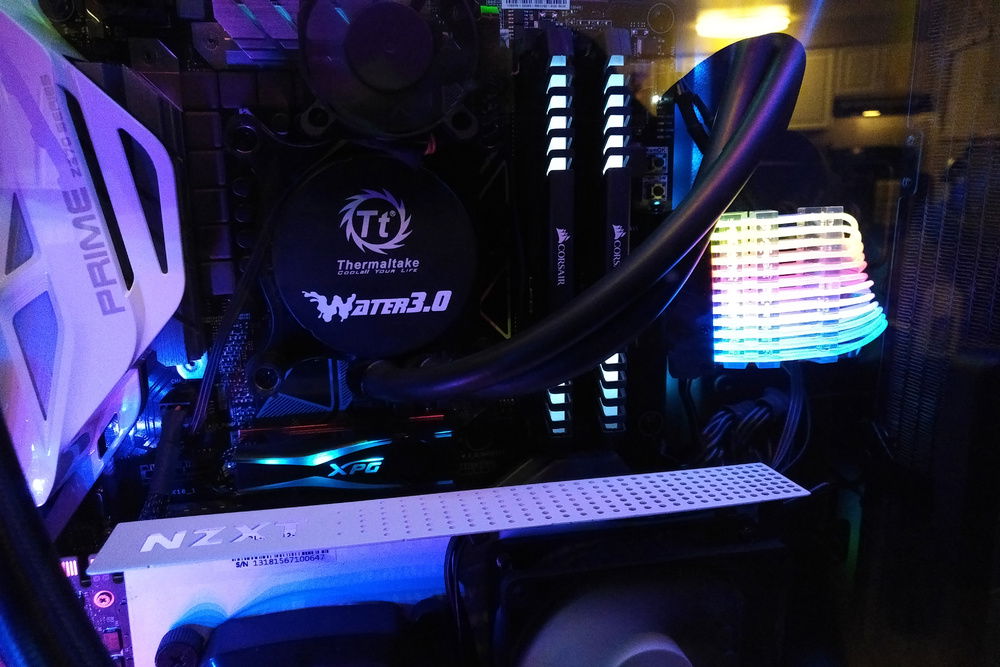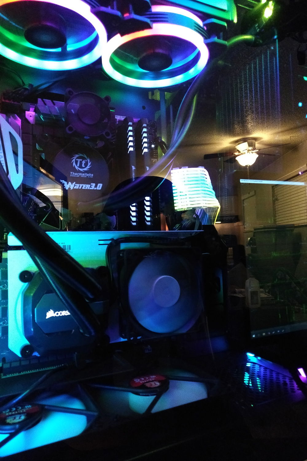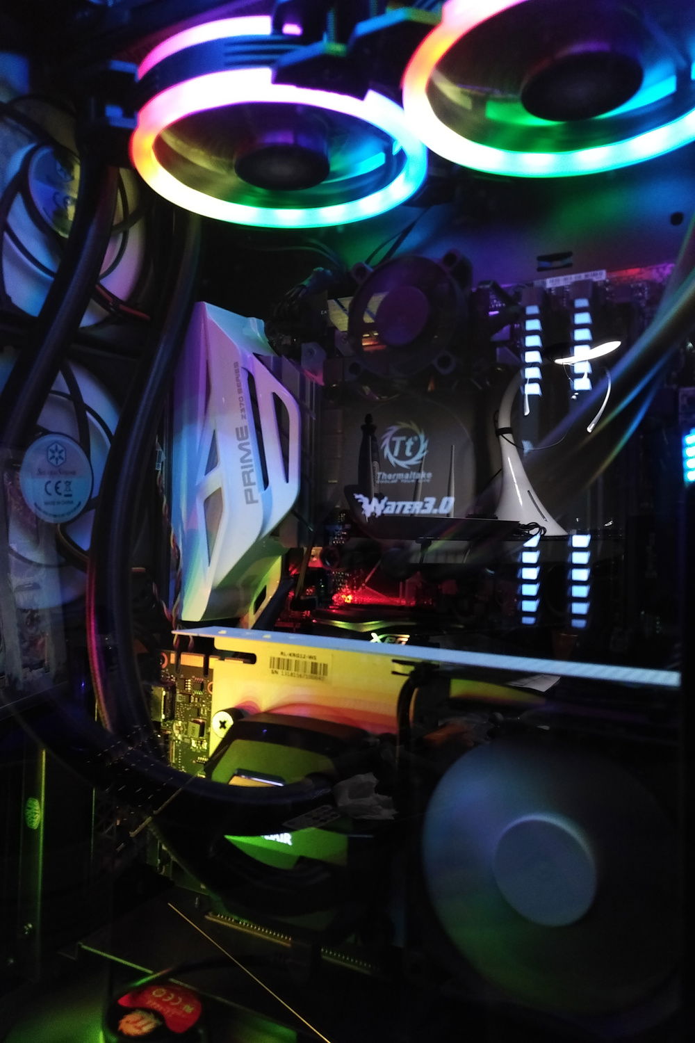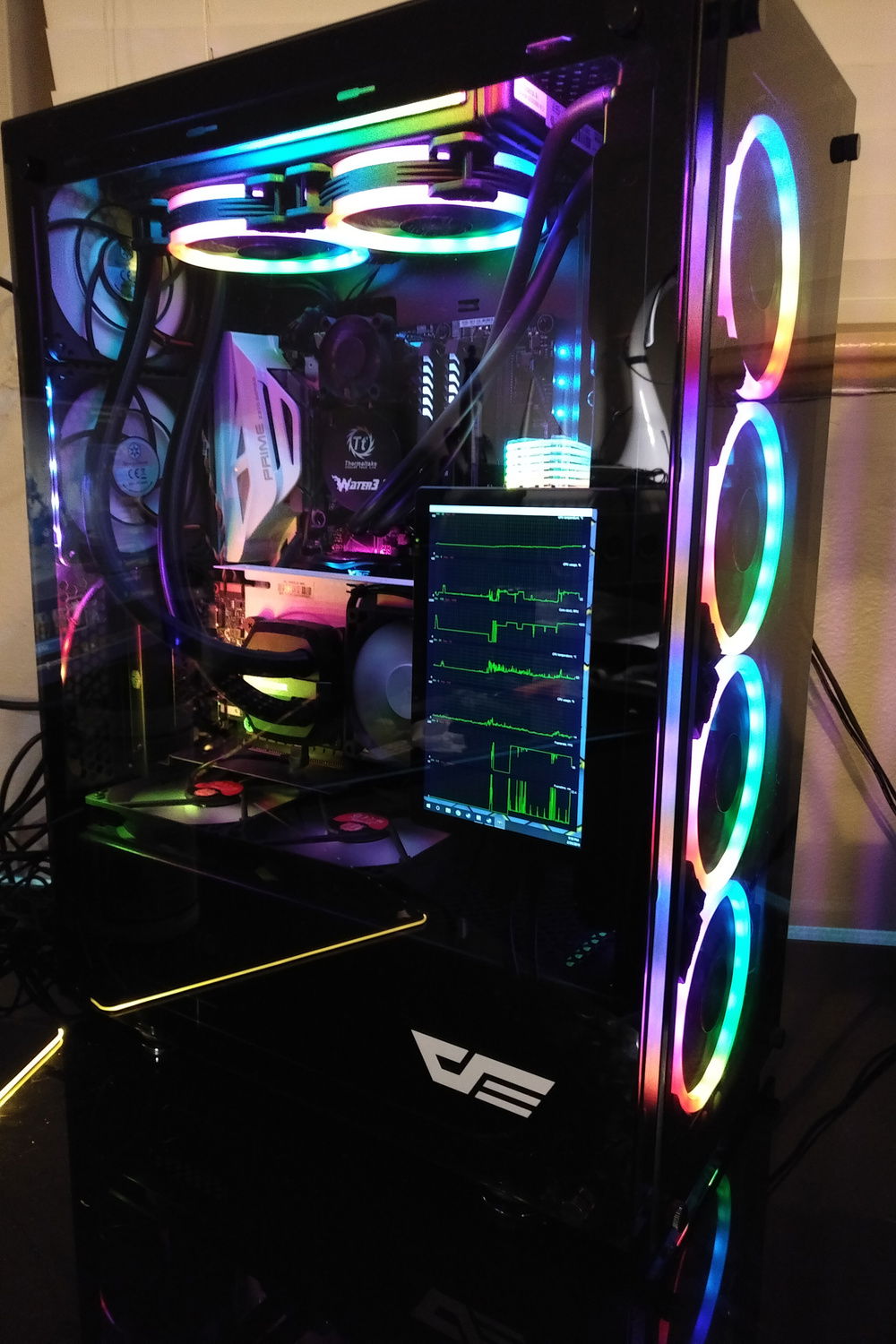 -I7 8086k (Thermaltake Water 3.0 Ultimate 360mm) -16Gb Corsair Vengance LED DDR4 3200Mhz (Non RGB White LED) -Galax GTX 1080Ti Exoc White (NZXT Kraken G12 AIO Mod with a Corsair H100i V2 and Cooler Master Vertical Mount) -Asus Prime Z370-A Motherboard -Intel 660p 500Gb NVME SSD (ADATA XPG Storm RGB M.2 SSD Cooler) -Hitachi 3Tb 7200RPM HDD -Lian Li Strimer addressable 24 pin RGB Cable -Two Silverstone Addressable RGB Strips -Corsair AX760 80+ Platinum Power supply -Internal 1200x720 Display for Temps and Statistics powered by an internal 5v USB through a Molex Connector -DarkFlash Phantom Black with 2 extra white 120mm fans as intake from the bottom and 2 white Slim 120 fans as intake from the rear (50mm fan on the motherboard VRM Black)