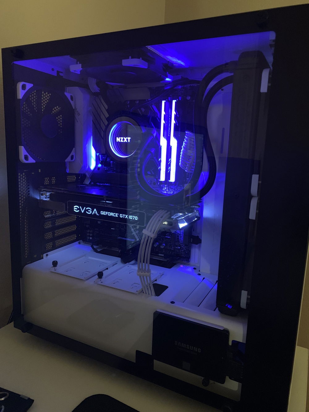 I went for a very clean aesthetic with this build using a mixture of white and black with purple accents. The photos cause the RGB to look a bit off.