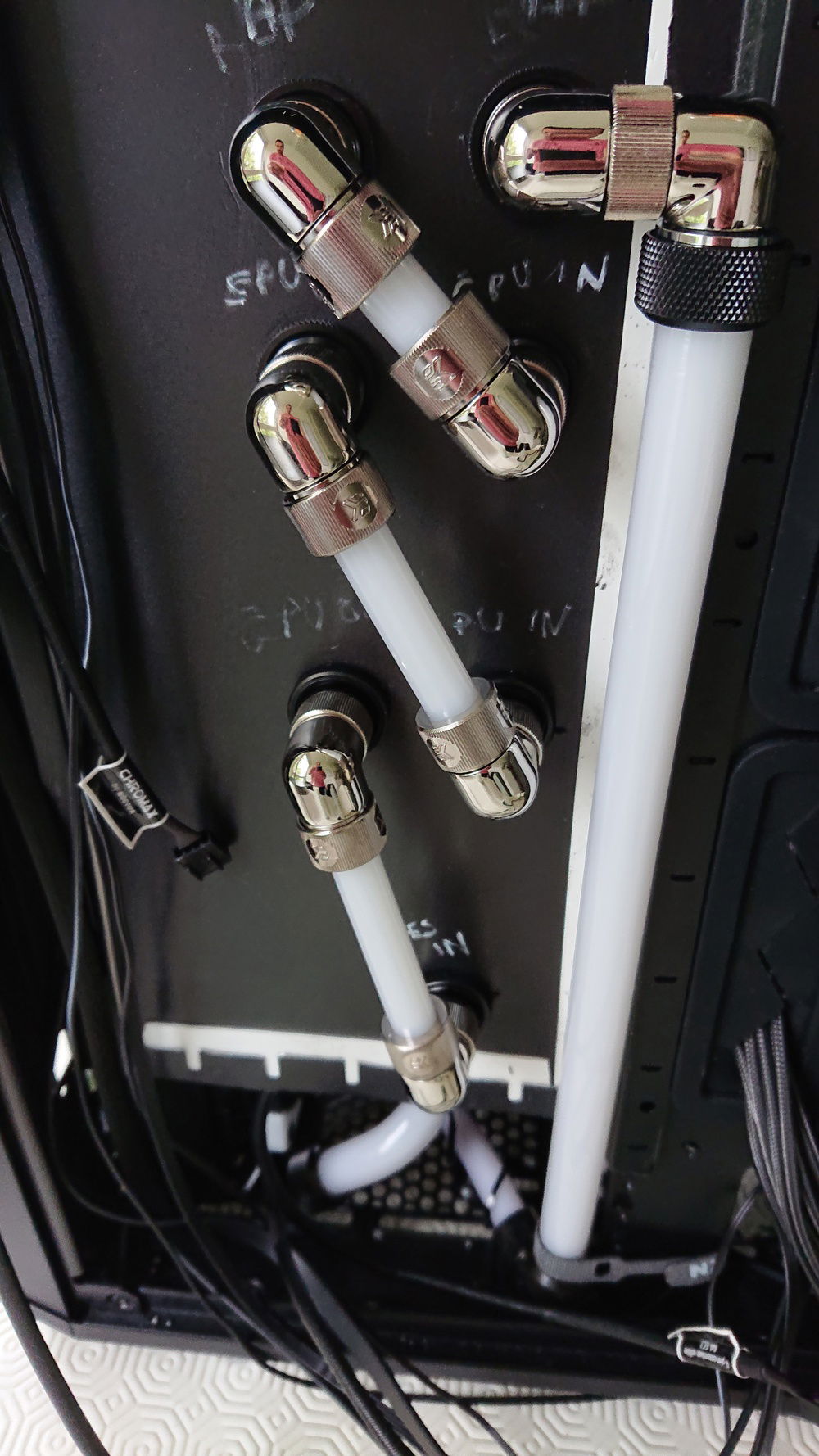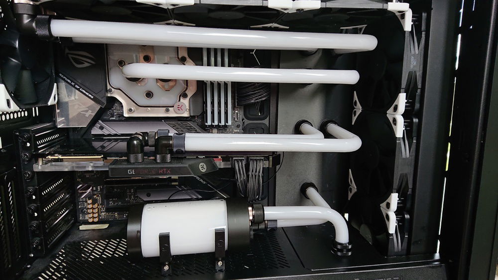 My second attempt at water cooling inside the Meshify S2. I am not really happy with the result, as I did not achieve to make all the tubes parallel. Also I do not like the tubing to the reservoir. I guess this will be a lesson learn for the next one !