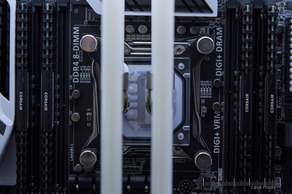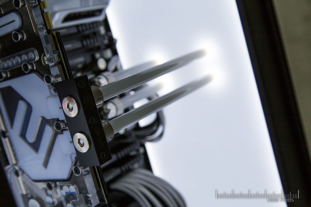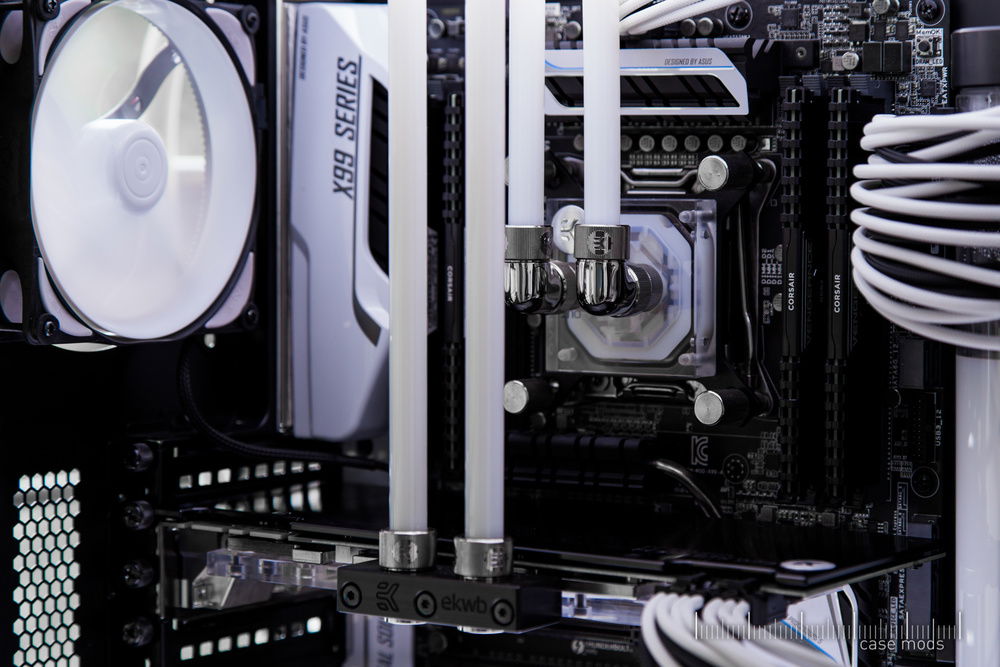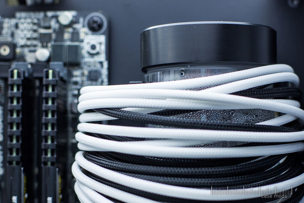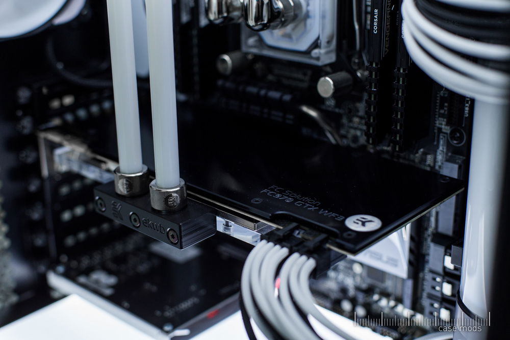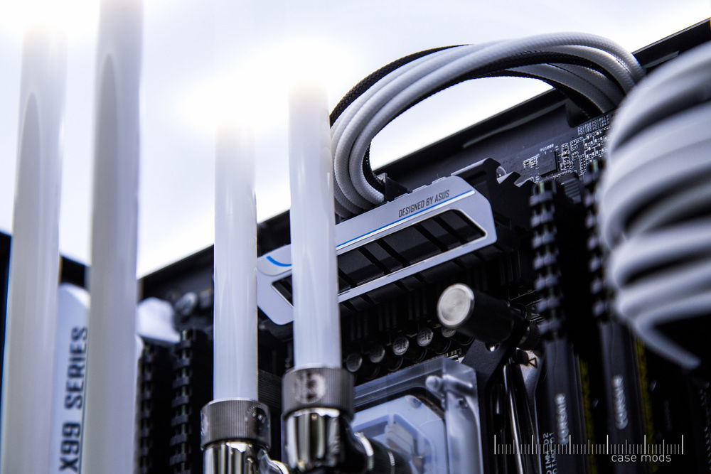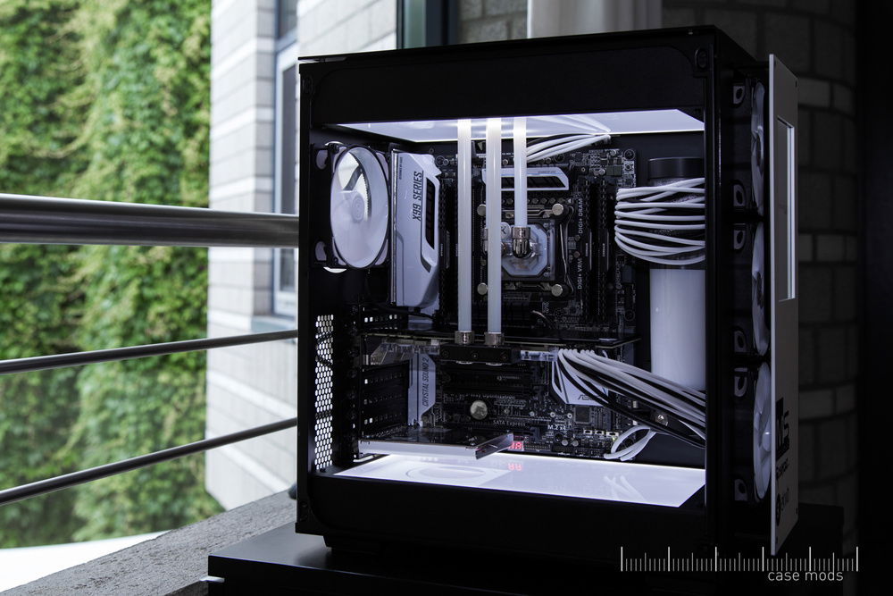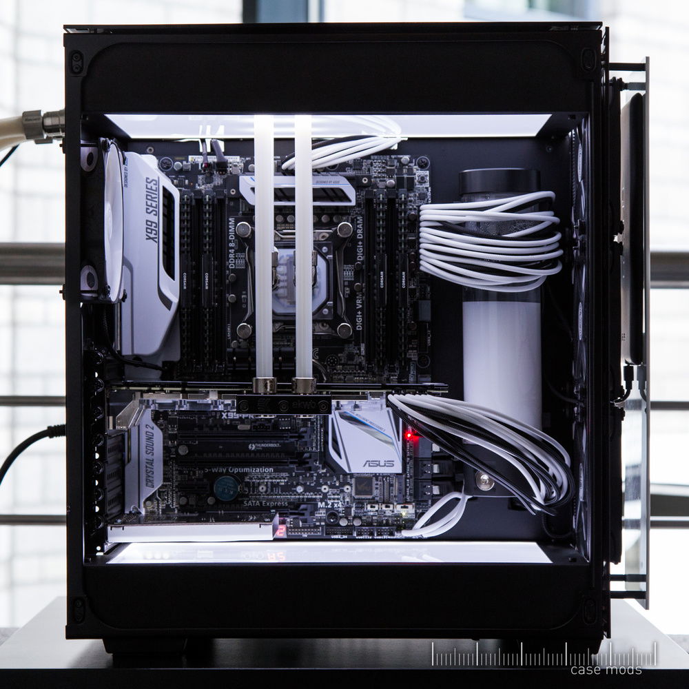 Sup guys, this is my very first casemod project i ever did, back in 2015. I just upgraded to X99 and decided to do an all black and white, custom watercooled build with a simple and unique design. I saw people building these light panels into the bottom part of their cases and thought, why not use two of them and put one into the top?! So i started planing and sketching, ordered acrylic plates and LEDs and a lot of watercooling stuff. The hardest part however was to drill holes into the top panel in the exact position so i can run the tubes perfectly straight up from the blocks. To my surprise it worked out on my first attempt. Back then i thought custom cables without combs looked cool, but seeing the photos now i can understand why most people critizised these. Anyway i just wanted to share it with you guys, hope you like it!