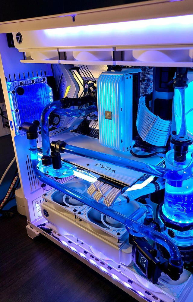 This build is my first completed full custom loop. It's the cumulation of lots of time and effort (and money) put into a PC. It sort of evolved several times over from my first white build in a Meshify C back in 2018. Over time I upgraded the case, moved to full liquid cooling and decided to go all in on the white out color theme. Several of the components such as the GPU backplate and RAM cooler I took apart and painted white to lean more into the theme I was going for. Ultimately this PC for me is about form and function, I'm quite happy with how it came out and it will definitely serve me well for years to come.