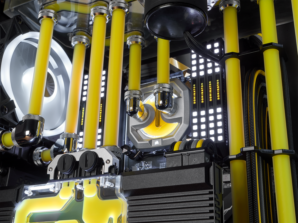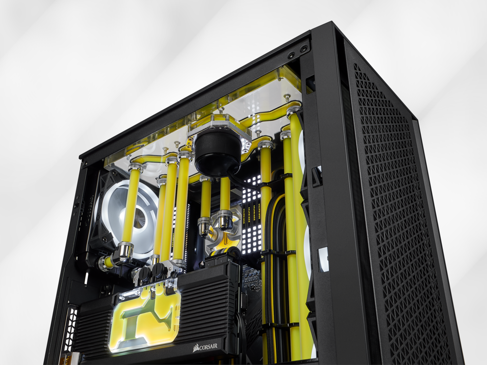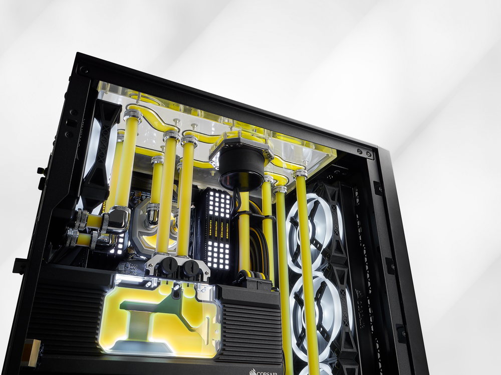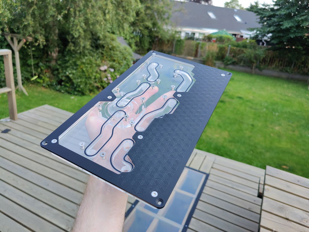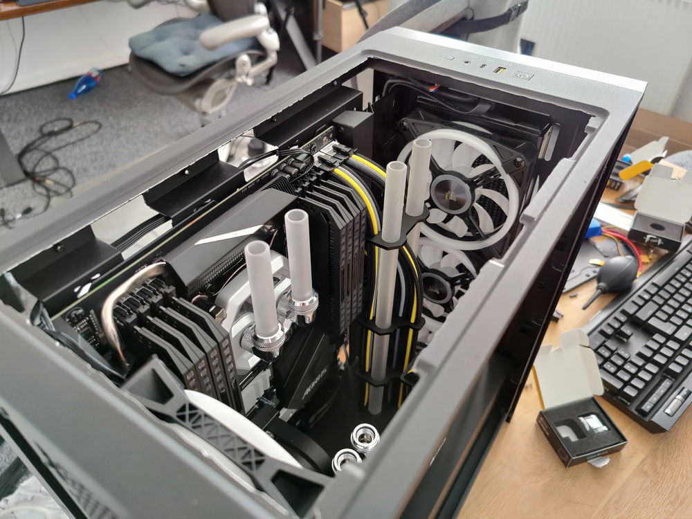 The whole project started with me getting a new case from CORSAIR and was tasked with doing a build in it. I wanted to still be able to put in dual radiators, so I mounted a custom made distro plate with built in pump in the top, and the entire system is filled with an external pump/res that is connected via quick disconnect fittings.