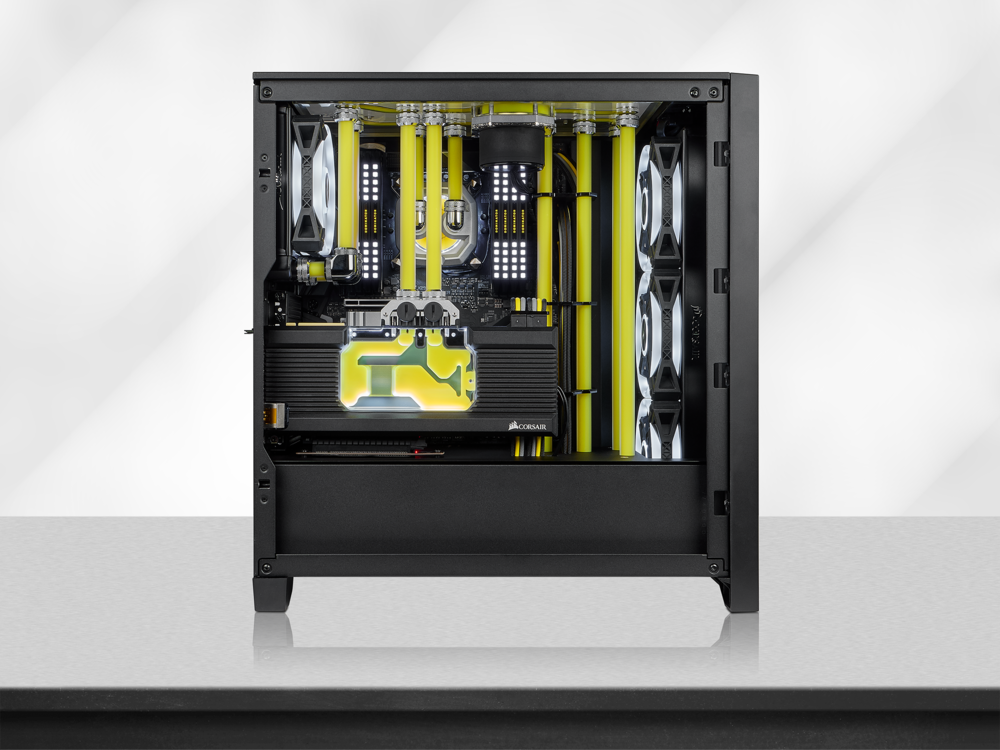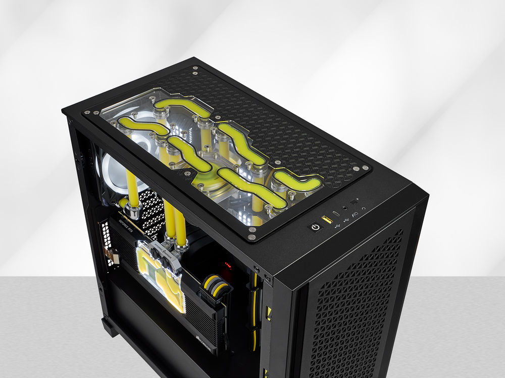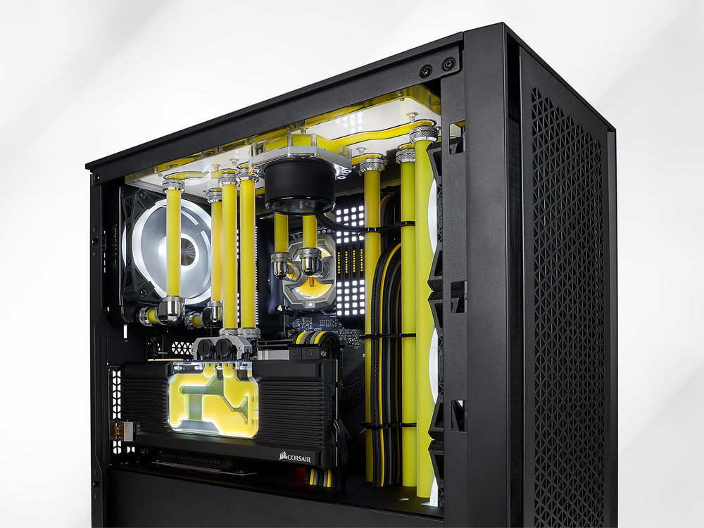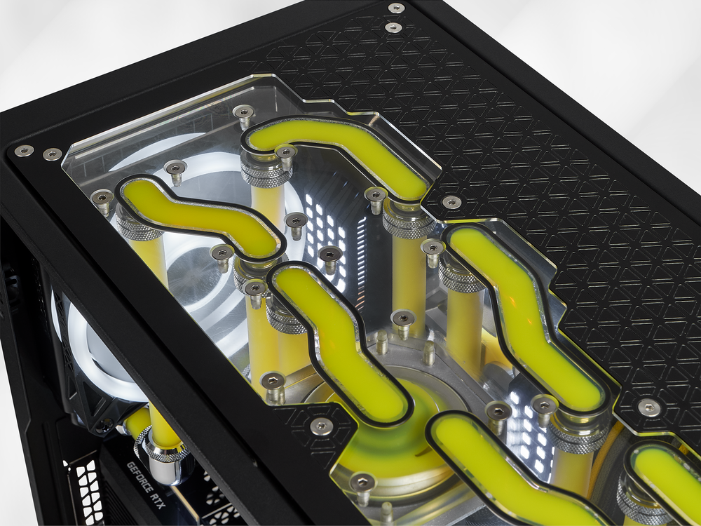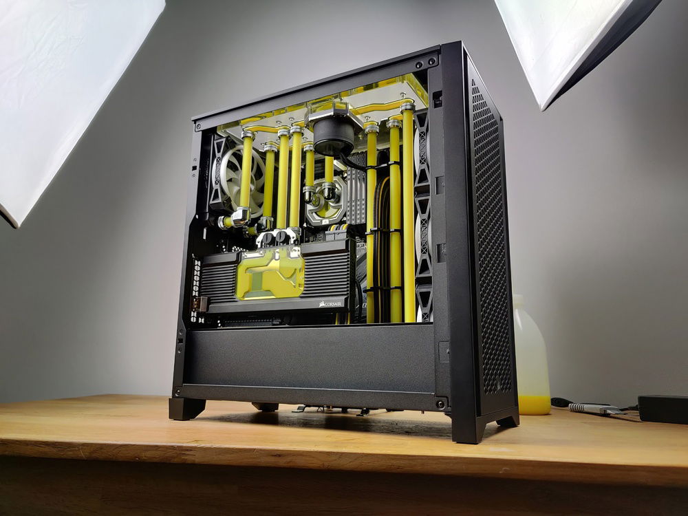 The whole project started with me getting a new case from CORSAIR and was tasked with doing a build in it. I wanted to still be able to put in dual radiators, so I mounted a custom made distro plate with built in pump in the top, and the entire system is filled with an external pump/res that is connected via quick disconnect fittings.