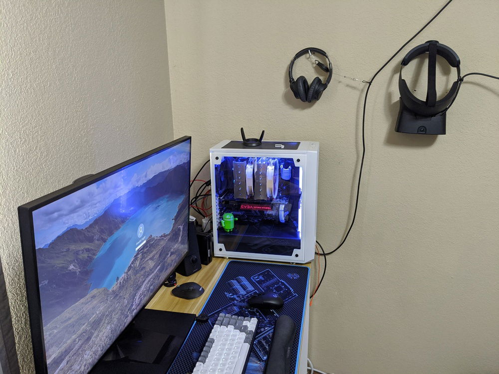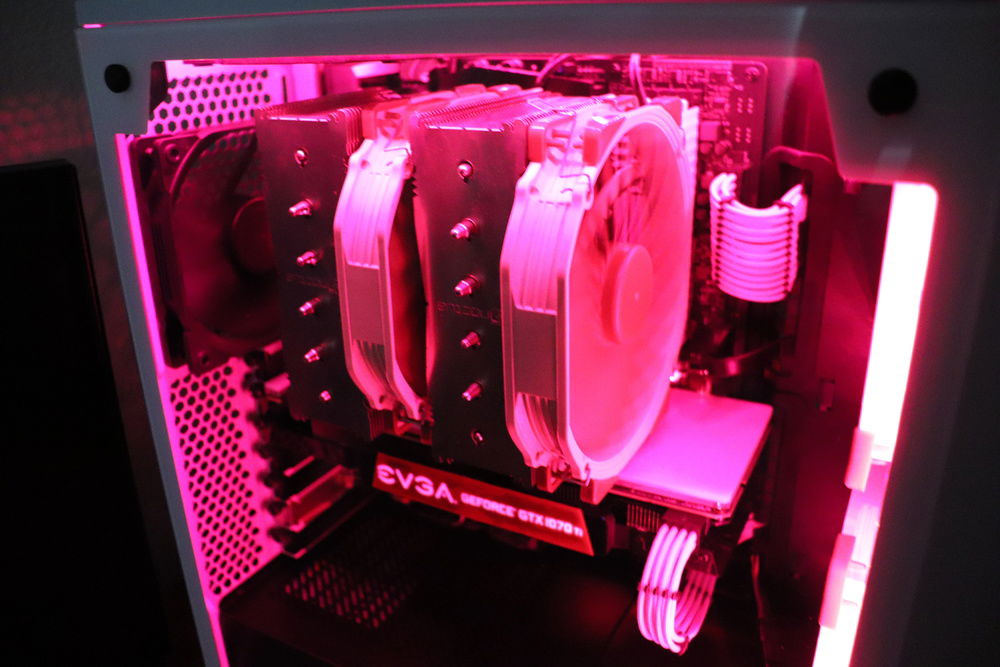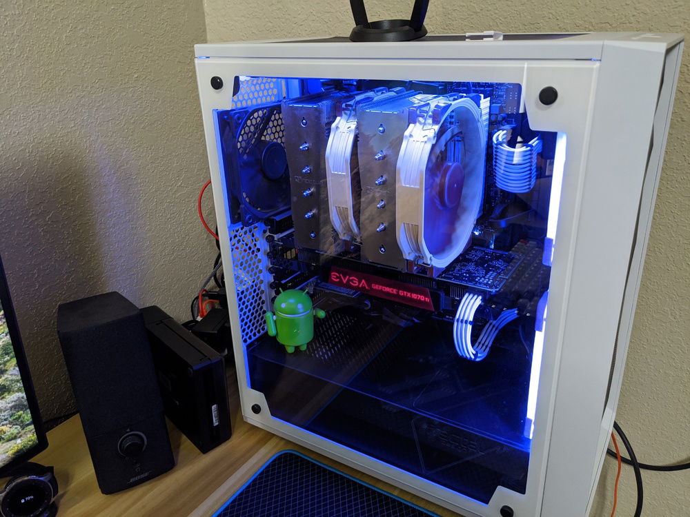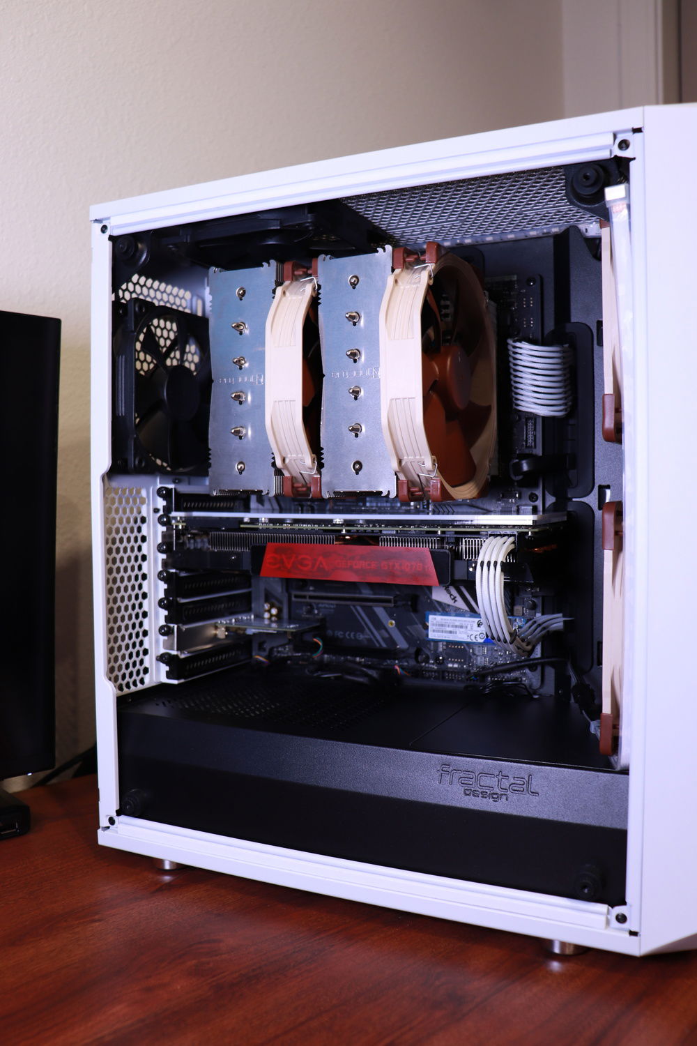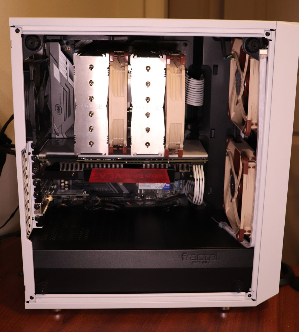 High performance on high air flow build. Core components include an i7 8700k (delidded with liquid metal between IHS and the die) at 5GHz on all cores, an EVGA GTX 1070 Ti, 32 GB of Corsair Vengeance LPX memory @ 3200 MHz. Ultimate air cooling using Noctua NH-D15 as the CPU cooler, together with 2 Noctua NF-A14 140 mm fans for intake and 2 Fractal Design Dynamic X2 GP-12 120 mm fans for exhaust, all inside a Fractal Design Meshify C White TG case.