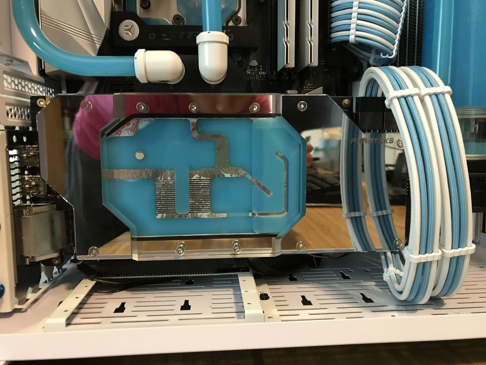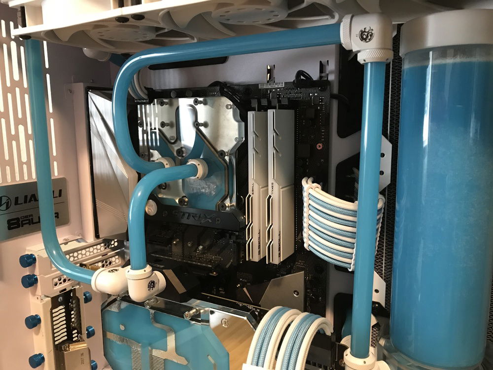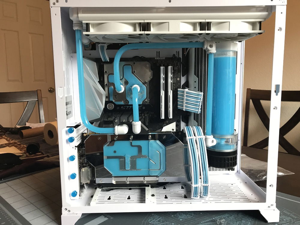 With a portion of the tubing in the back I wanted to try and fill out the case with the rest of the tubing and that is why I went with the layout I did. Bending wasn’t bad at all I only redid one since it didn’t come out as good as I wanted, but there aren’t really any difficult bends in this build. The only tricky one was the output on the pump to the back of the case. Getting it to fit well through the cutout with enough room for the drain port took a few times to get it to fit right. With the two 360 rads this thing runs near silent even while gaming and that was my intention. I will at some point overclock and see how far I can get this 8700K to go, but since I will probably bring it back to stock as silent running is amazing.