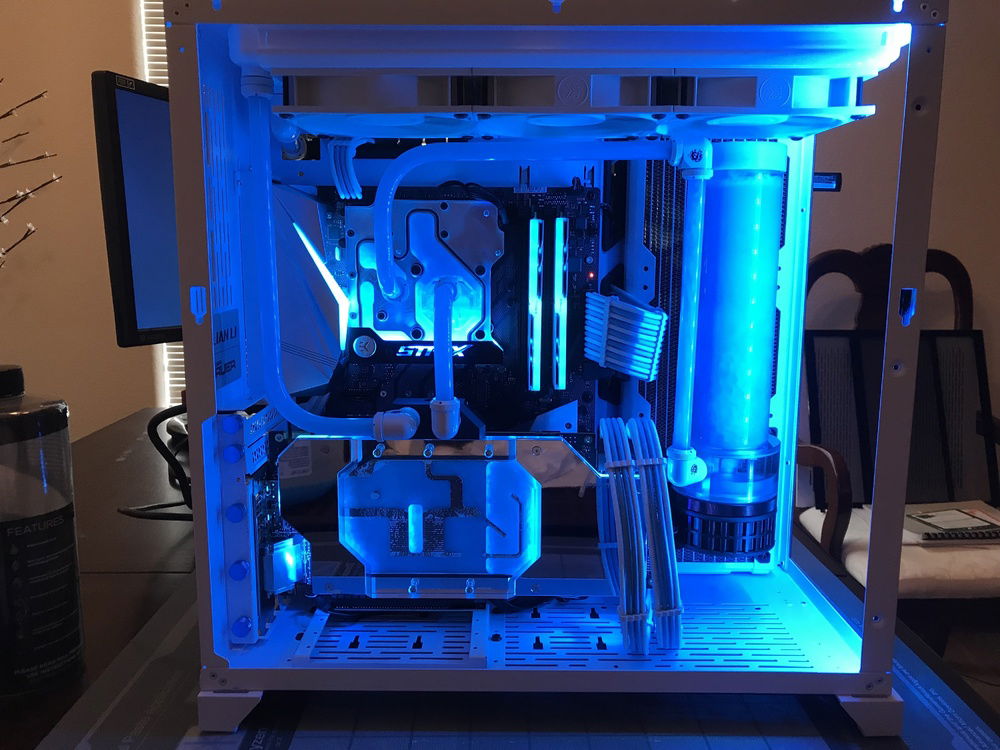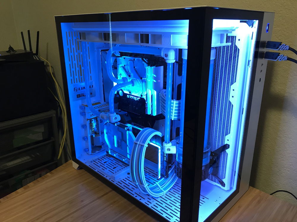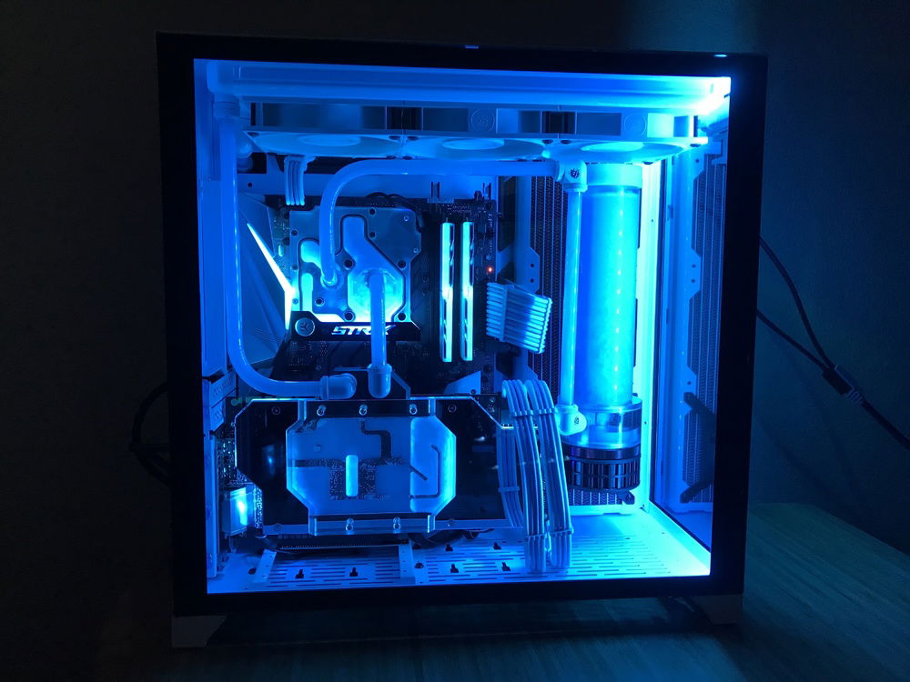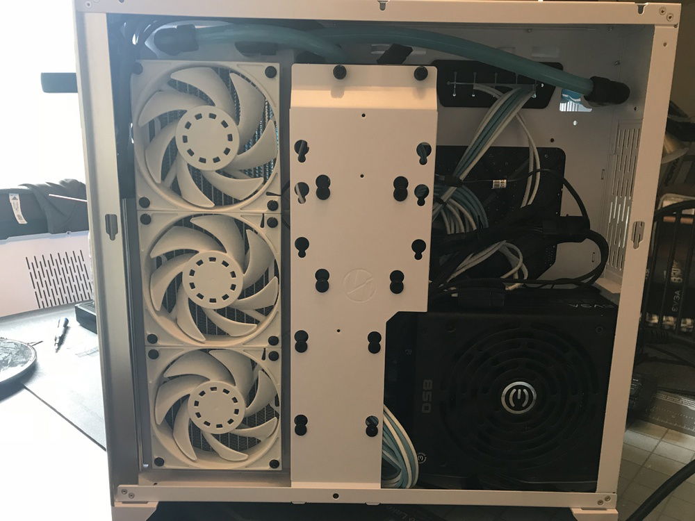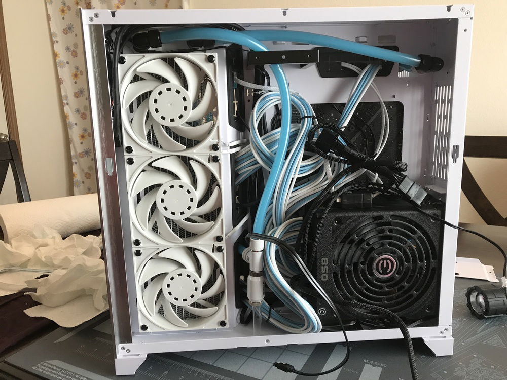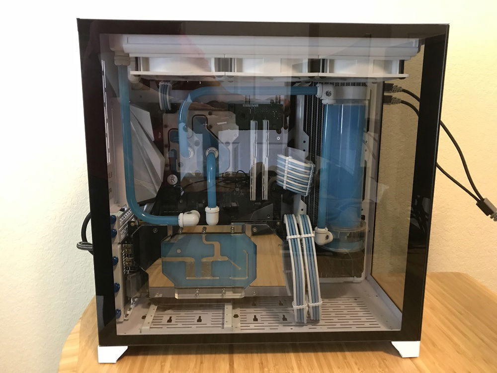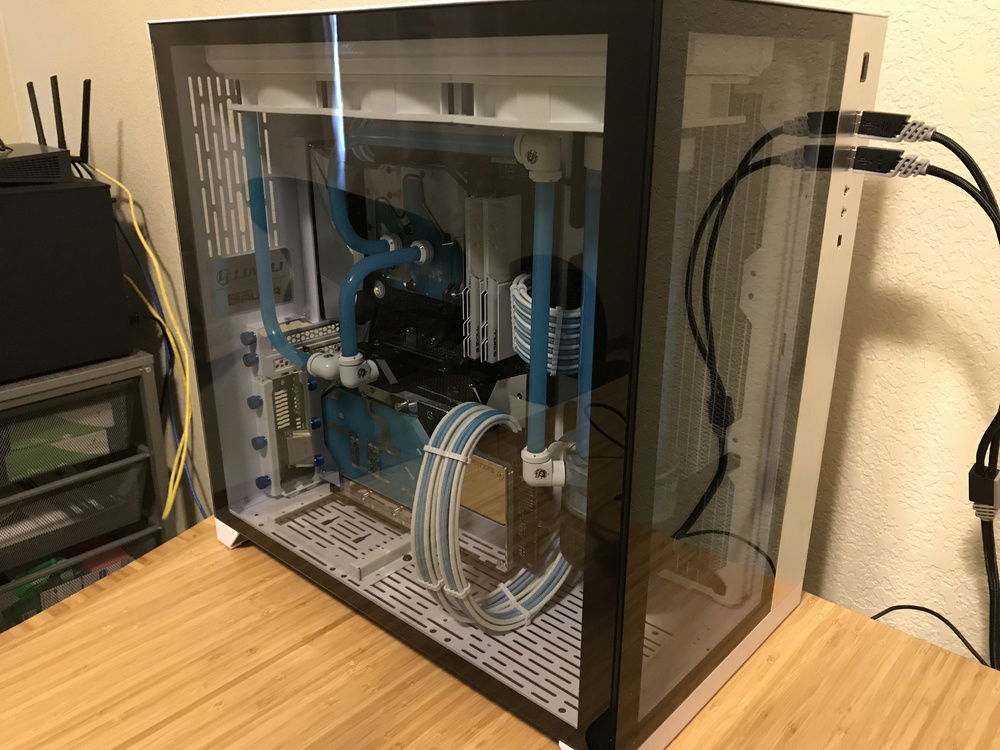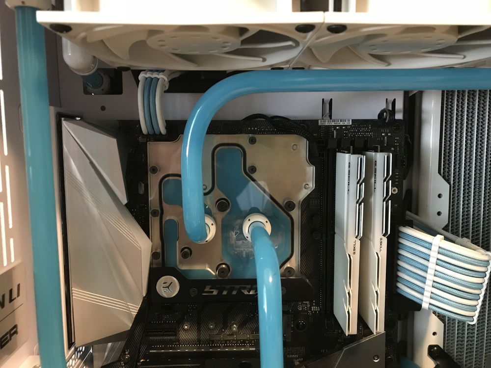 This is my first custom loop system that I use to game when I can. Originally was going to be in the Define R6, but it was delayed long enough for the O11 Dynamic to come out so I switched cases. The O11 Dynamic is a fantastic case that was great and easy to work in. The only bummer about it was how front IO cables are set up in the back of the case. With the radiators I had they wouldn’t fit in the back because the cables interfered as well as a tie down loop. Because of this the only way the side radiator would fit was to put it in front with the port facing the back of the case so I had to run part of the loop in the back of the case using soft tubing. With part of the loop in the back it made it easy to add in a drain port out of sight.