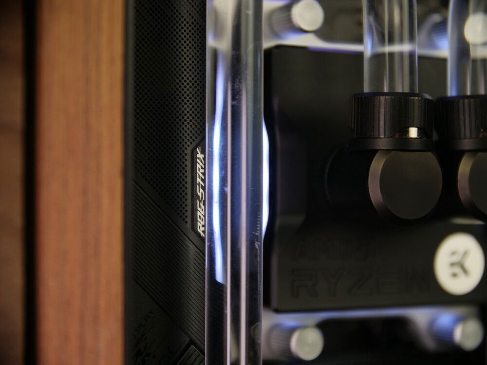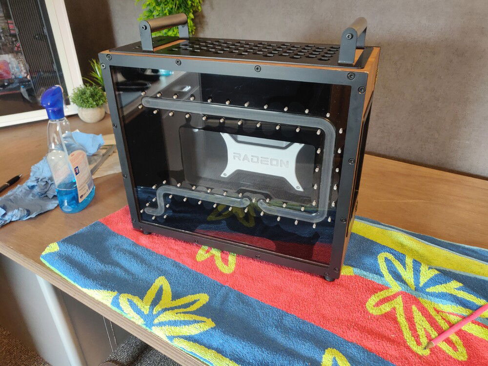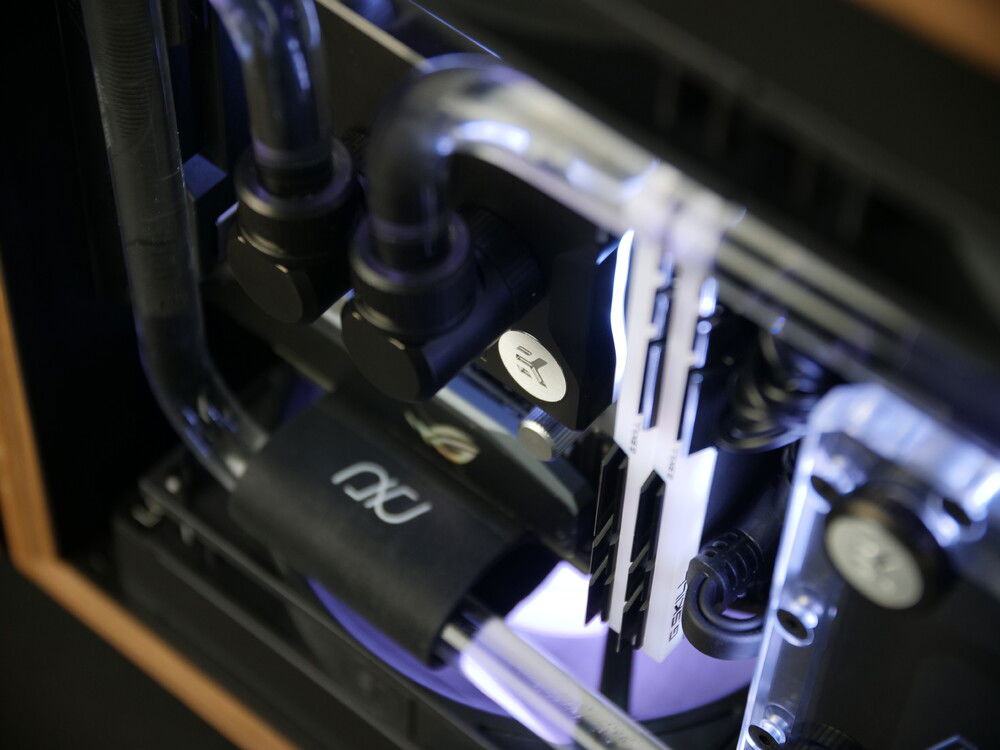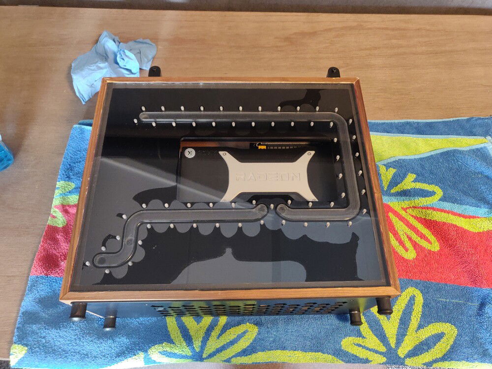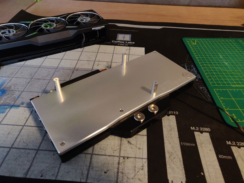 GPU waterblock installation with custom spacers + distro installation in wooden box.