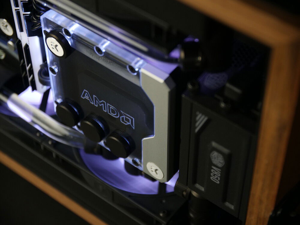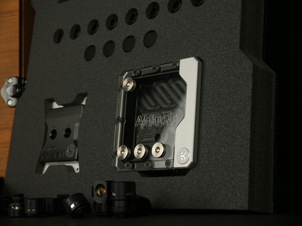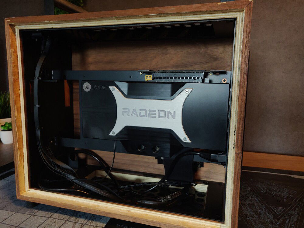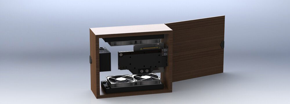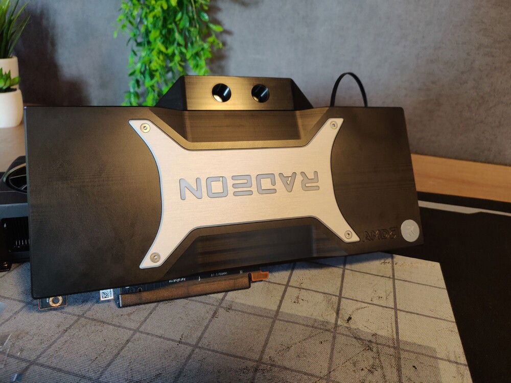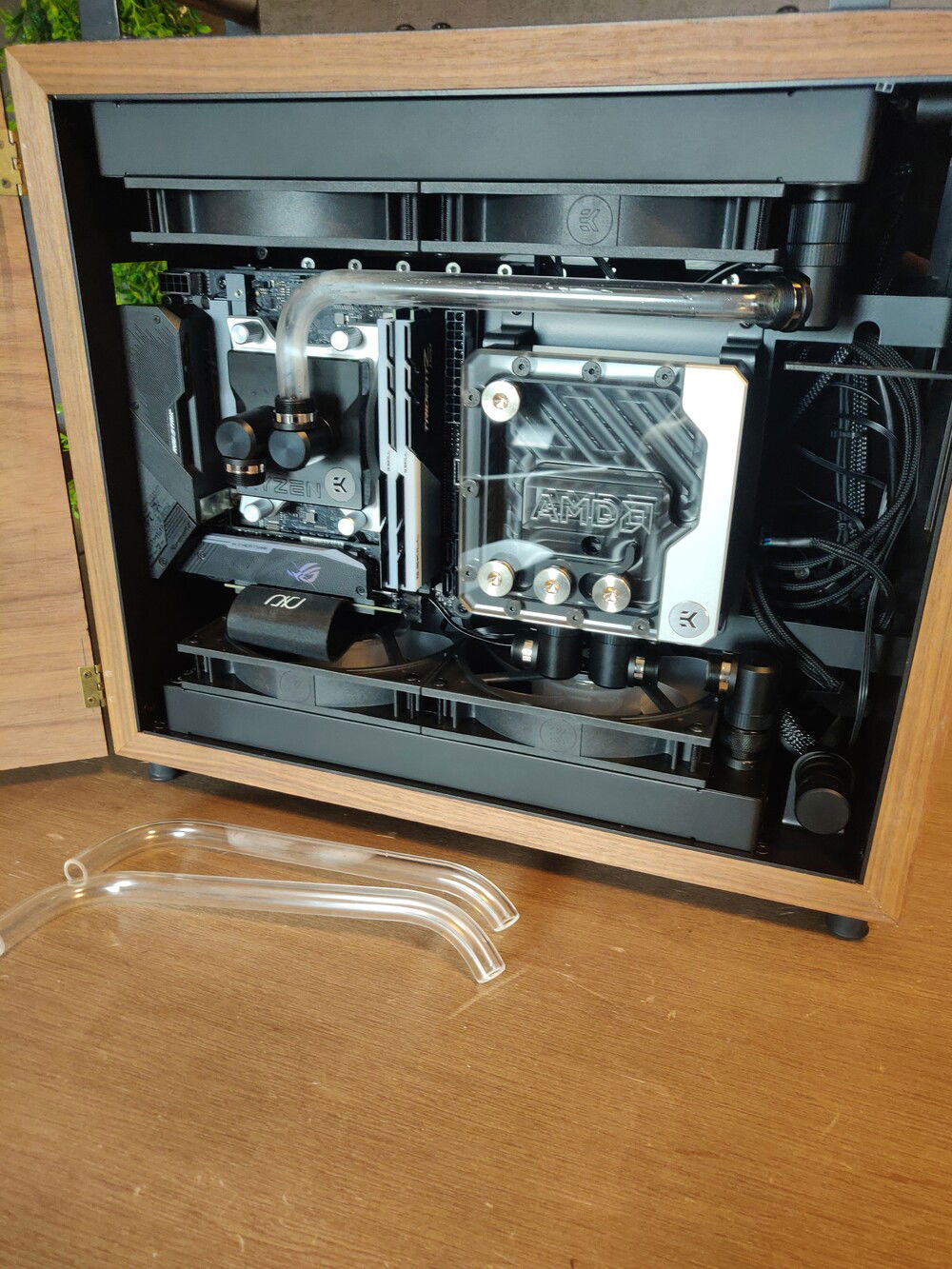 GPU waterblock installation with custom spacers + distro installation in wooden box.