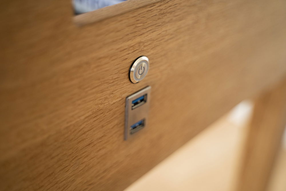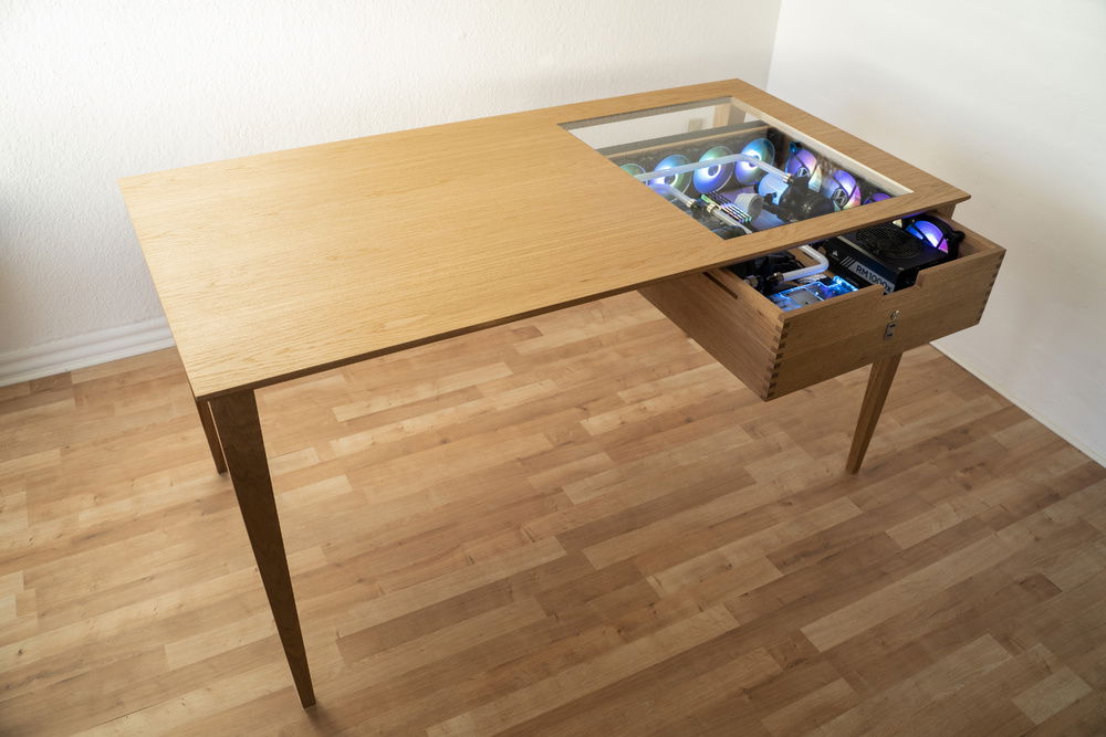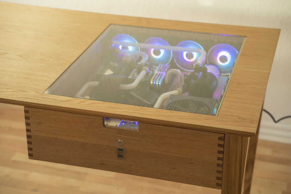 The hole drawer can slide out while the pc is running, and it has two bottoms so you can hide the cables in between.