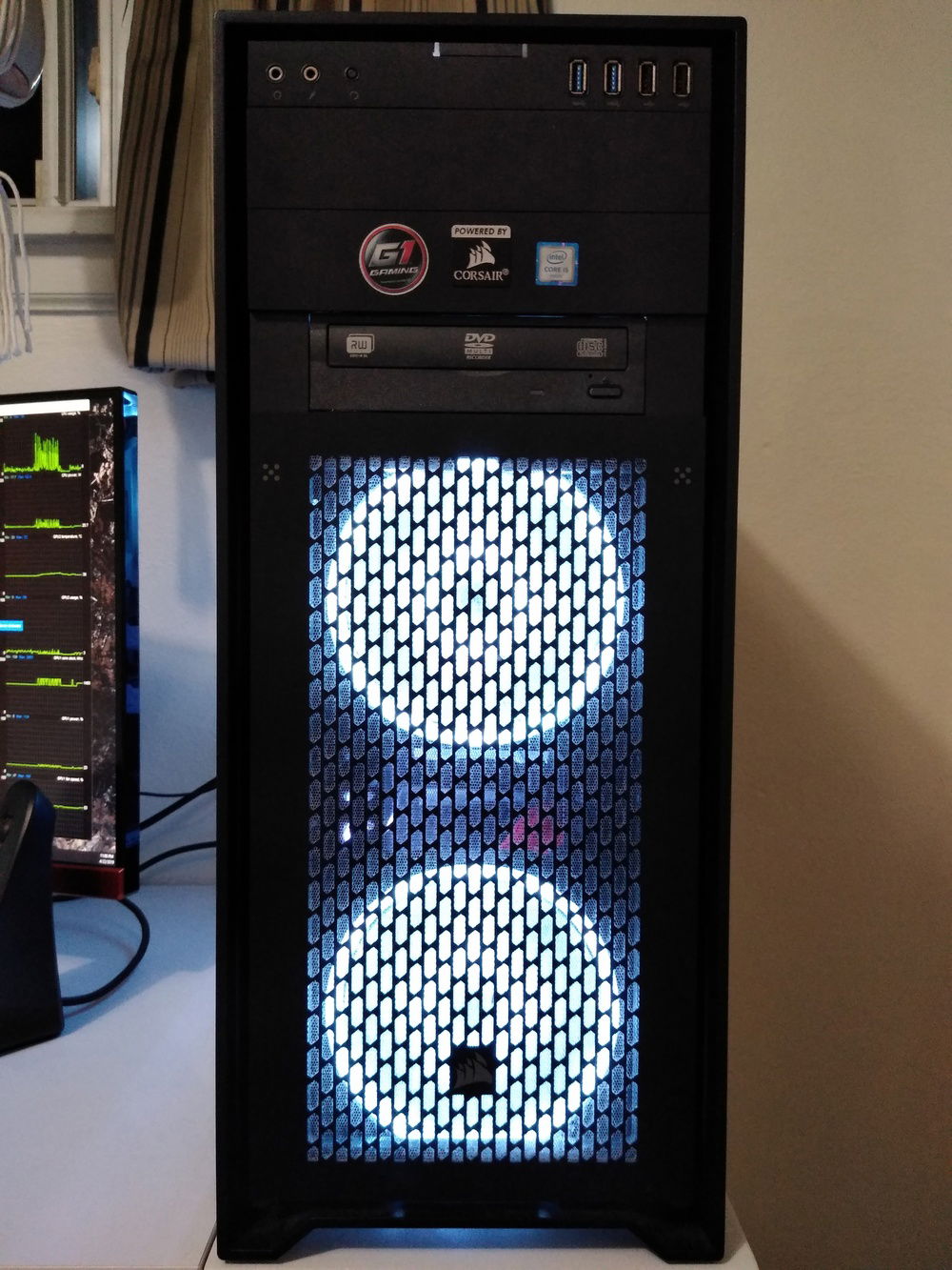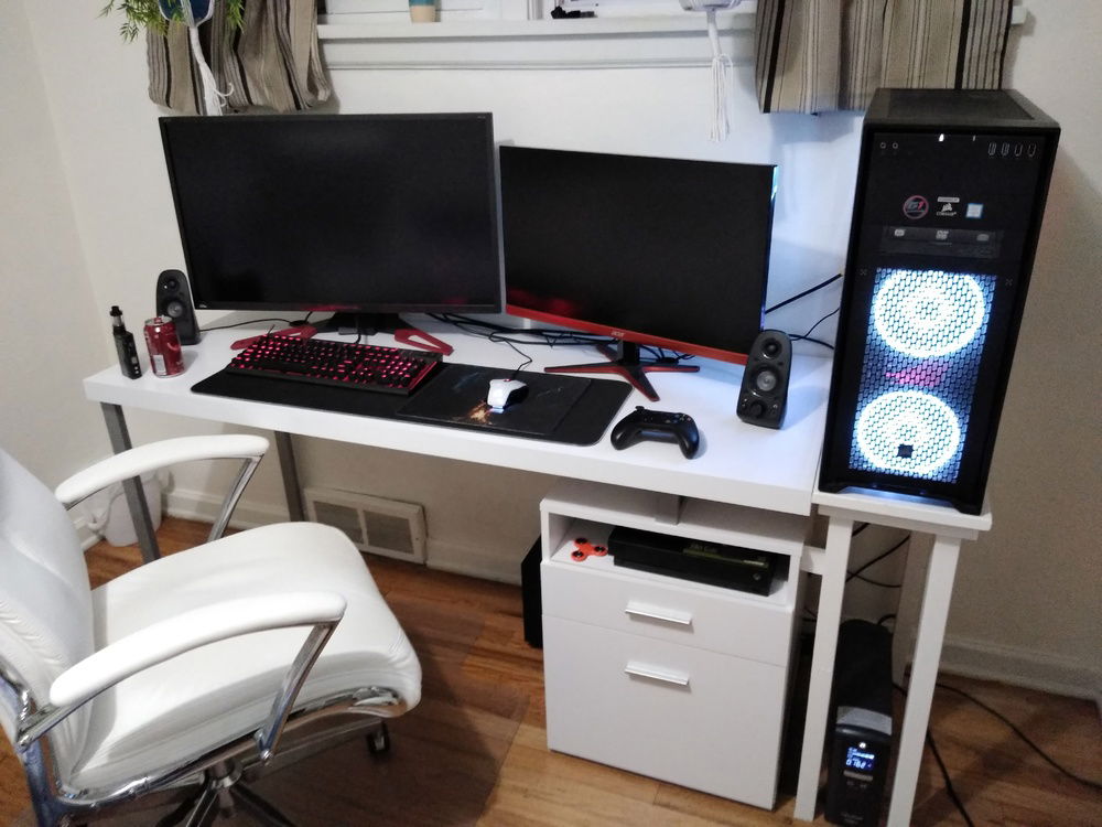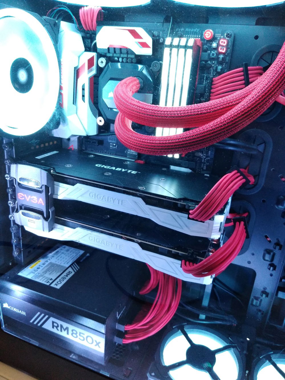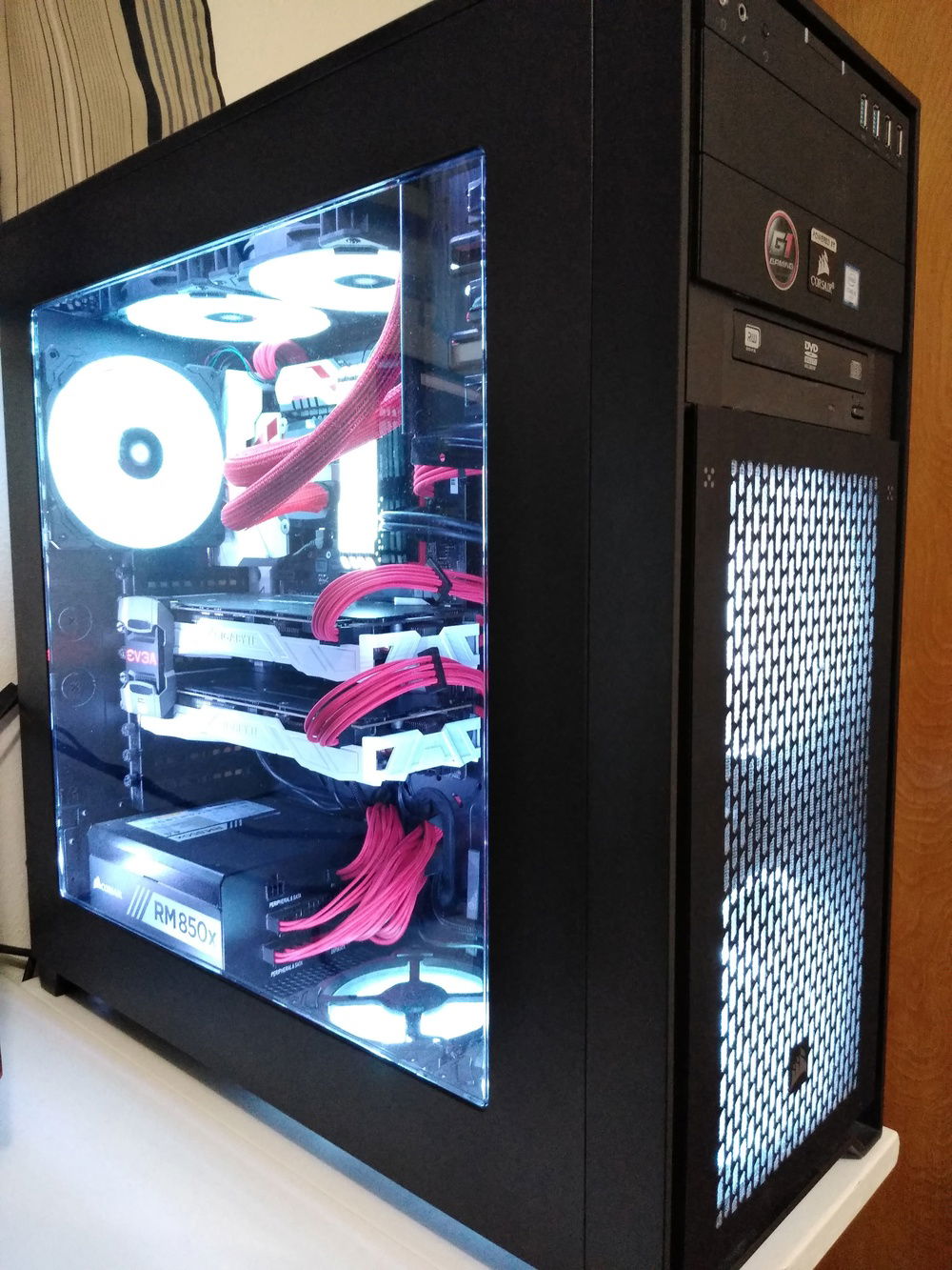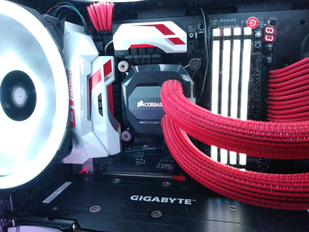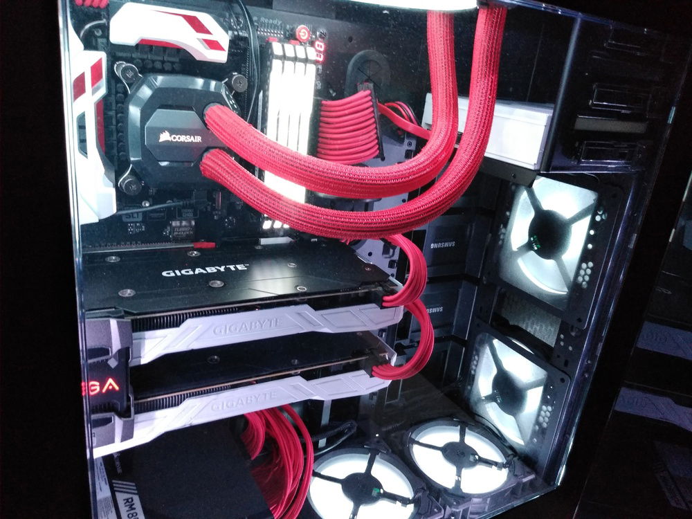 I've since installed an i7-7700K, replaced the stock fans with and added some extra of Corsair's gorgeous RGB LL series, swapped the RAM out with snappy Corsair Vengeance RGB Pro 3000MHz, replaced my PSU modular cables with Corsair's Cable Pro Kit for color, added a second GTX 1080 to try out SLI (previously had no experience with it- somewhat tricky to find HB SLI bridges now that NV Link is here), and finally spray painted the GPU shrouds and optical drive a soft glossy white to really make the bulky hardware stand out with Krylon ColorMaster Paint+Primer spray can.