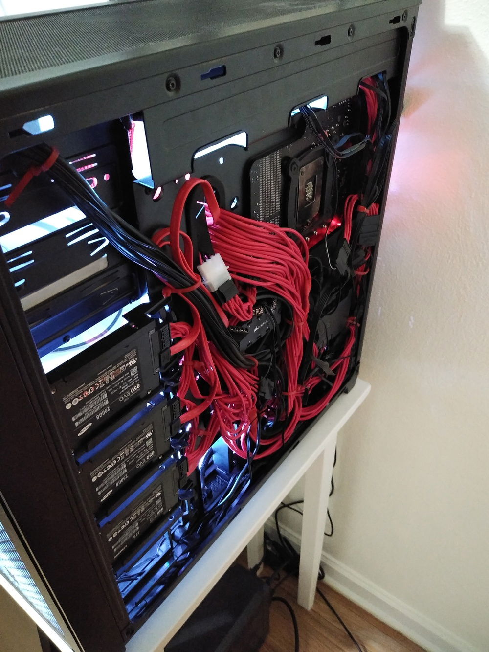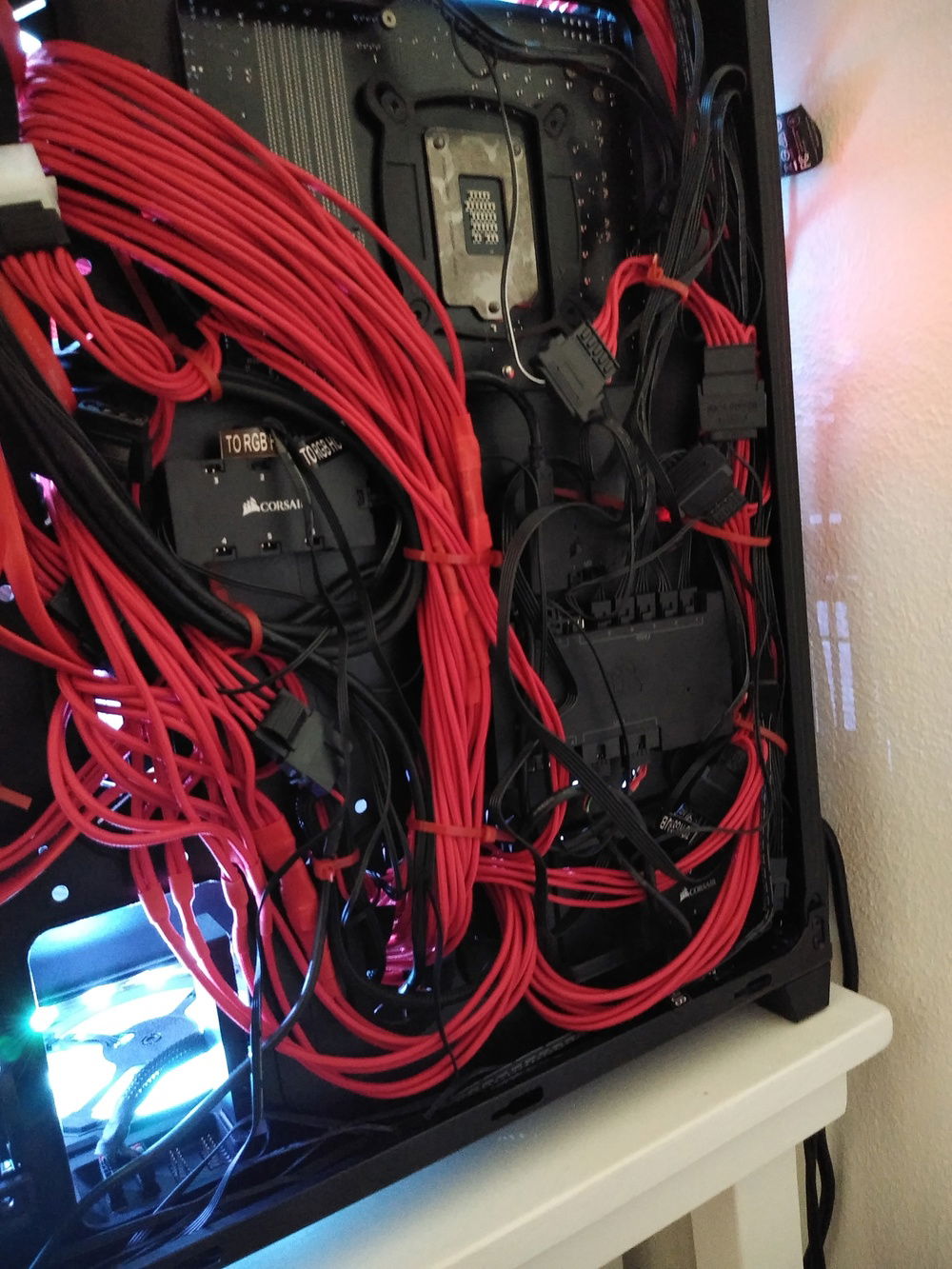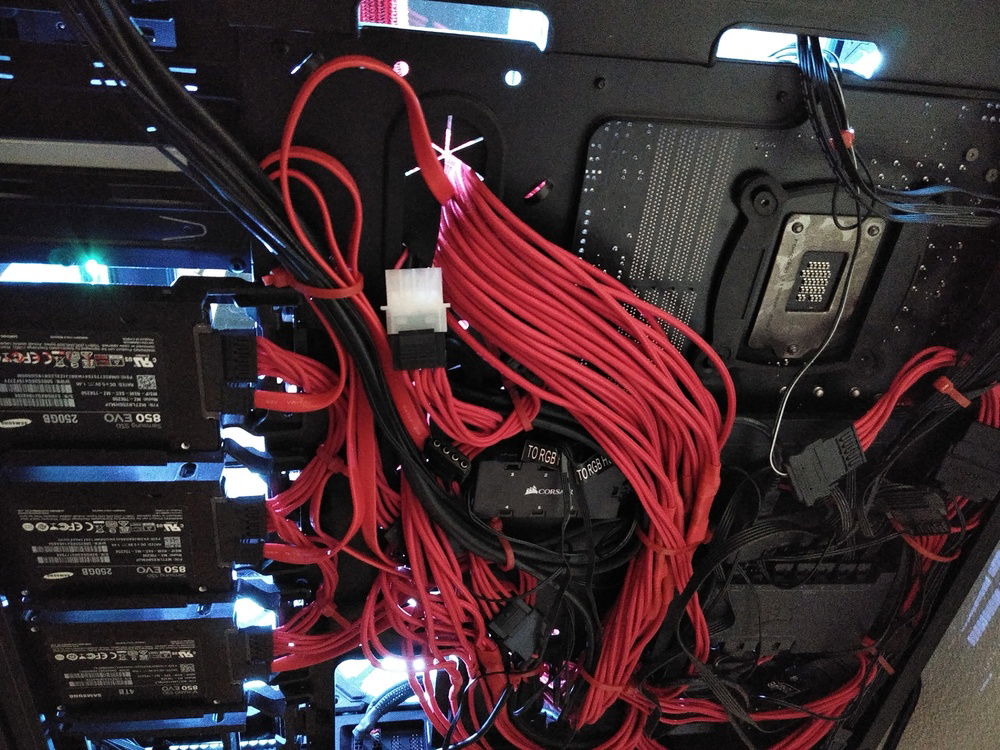 Corsair's iCUE software allows synchronized lighting control and effects with the AIO, RAM, fans, light strips, and mouse that I own. I use a Commander Pro for all the fans (7) and a Node Pro for the lighting strips (4); these were an extreme hassle to wire in any kind of managed sense around the perimeter of the case but I got it done. Each fan has 2 cables coming off them and cannot be daisy chained. Why, Corsair, why? The strips CAN be daisy chained which make them a bit easier to install, but running them AND the 14 cables from fans to the two hub units on the back of the case was messy, and then getting SATA power connectors to those was even trickier.