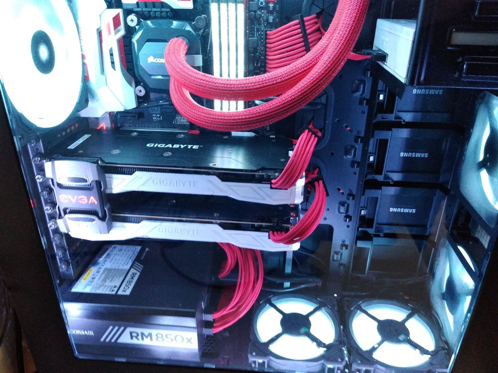 I started this thing early 2016 with an i5-6600K, single GTX 1080, and some relatively slow Dominator Platinum 2133Mhz RAM. Stock fans. Stock cables. There was virtually no color to it all but the hardware was the most powerful stuff I had ever owned. Had used onboard graphics up until then. Sickening. So over the course of the next few years I purchased upgrades here and there when I saw cool products and or sales for items that I thought would give the build some more flair.