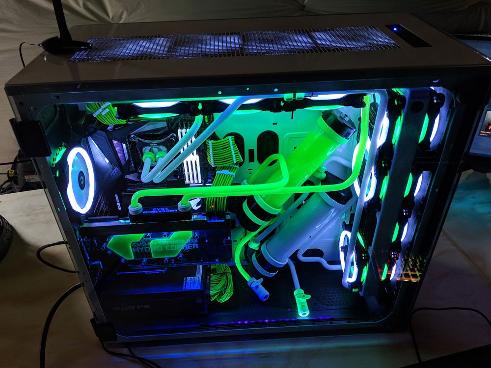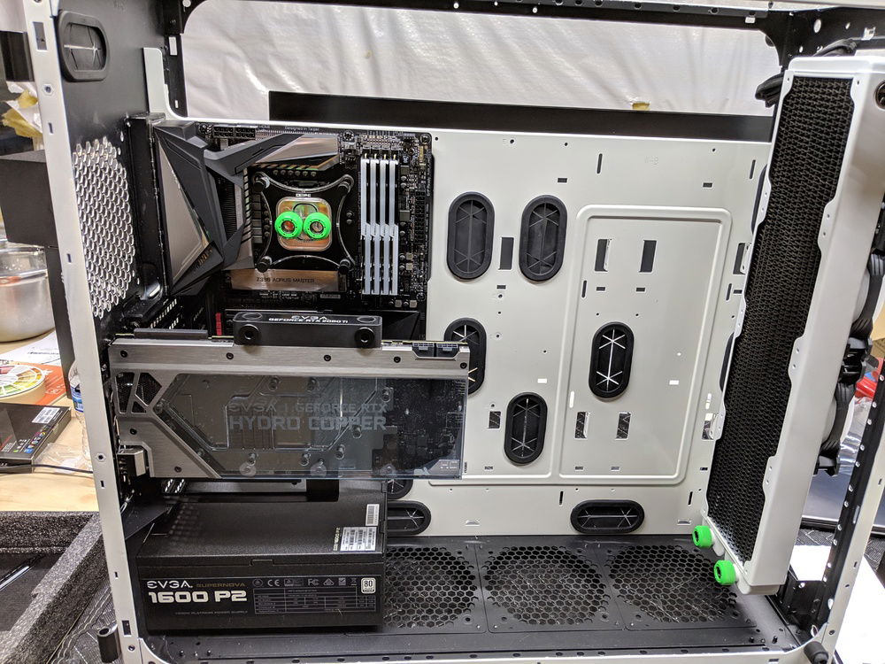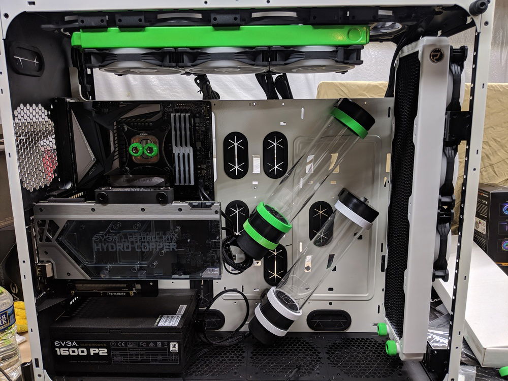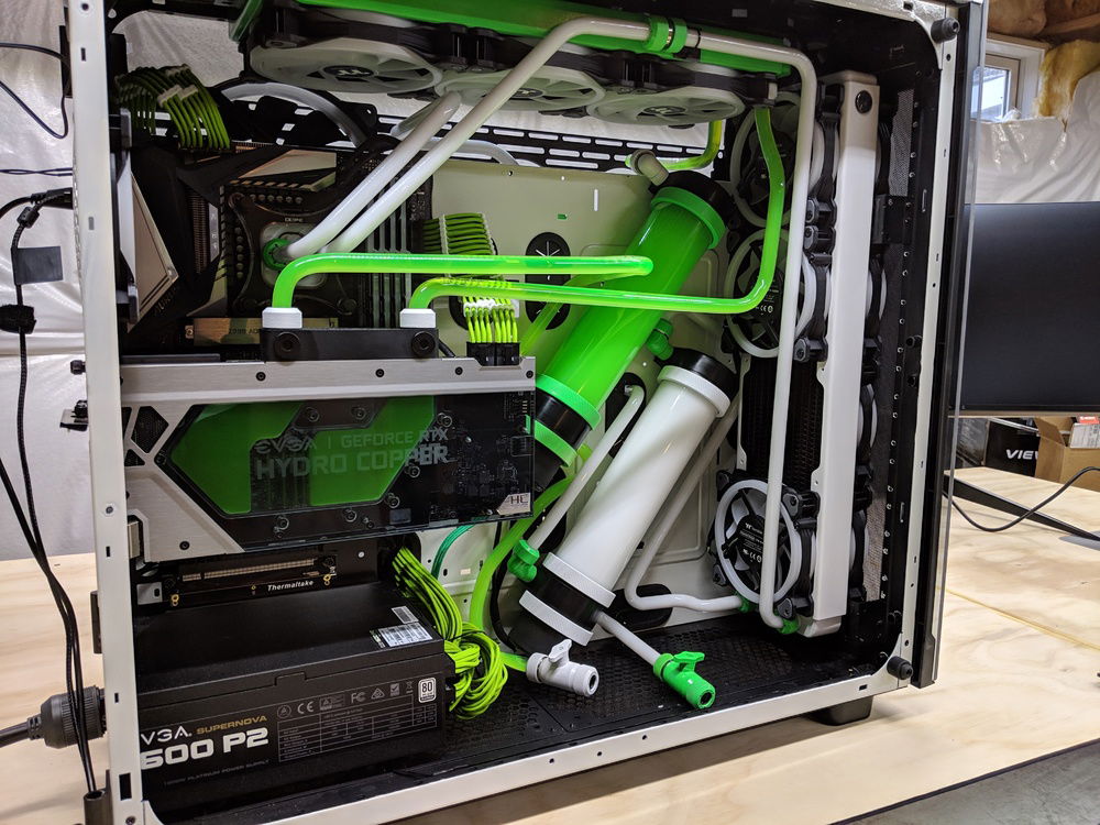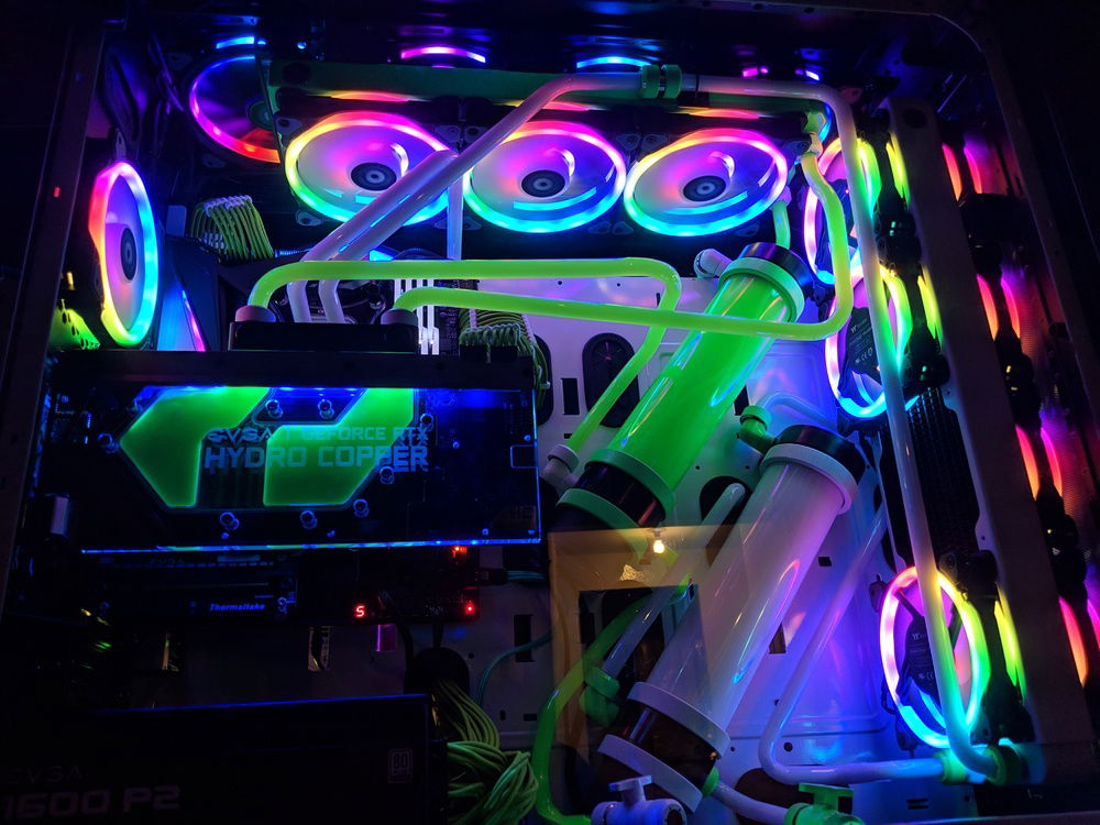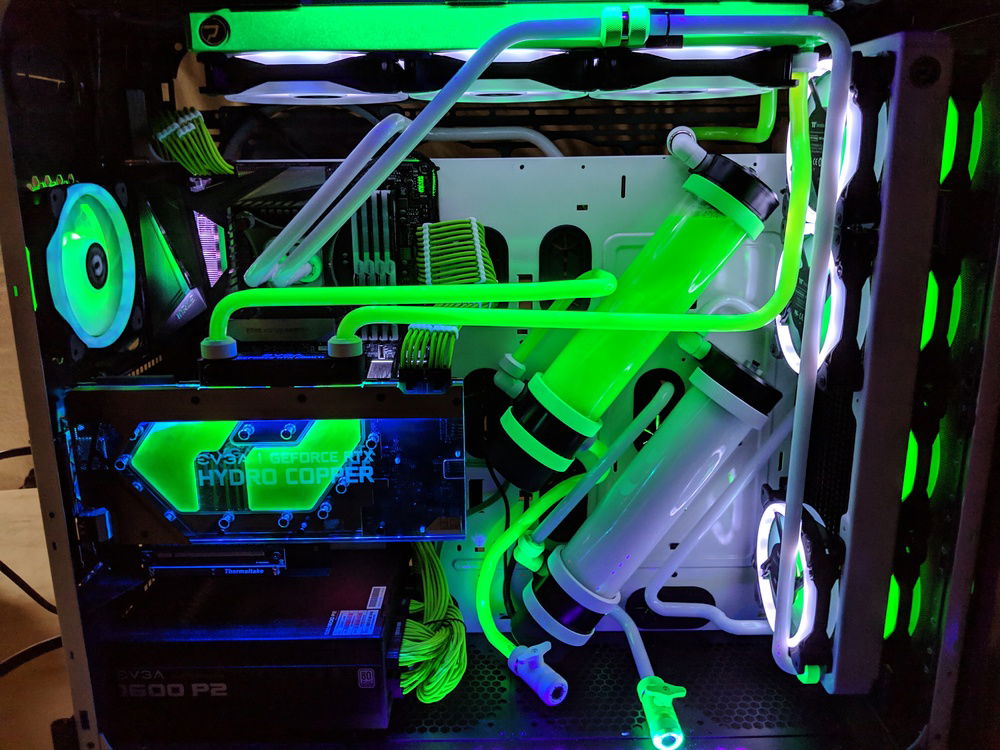 with the exception of the CPU block and GPU block all of the watercooling was built using Primochill components, they are excellent quality along with the XSPC and evga hydro copper block. The 9900k is not overclocked to anything crazy, set to 5ghz all cores and very stable. once i may work on tweeking this a bit over time. Currently seeing temps in the high 80c when going to 5.1ghz. the evga FTW3 overclocked fairly easly and quickly. seeing 2150 and stable with temps staying below 50c.