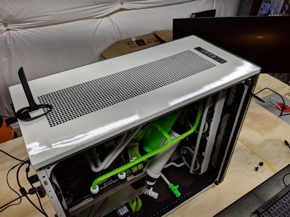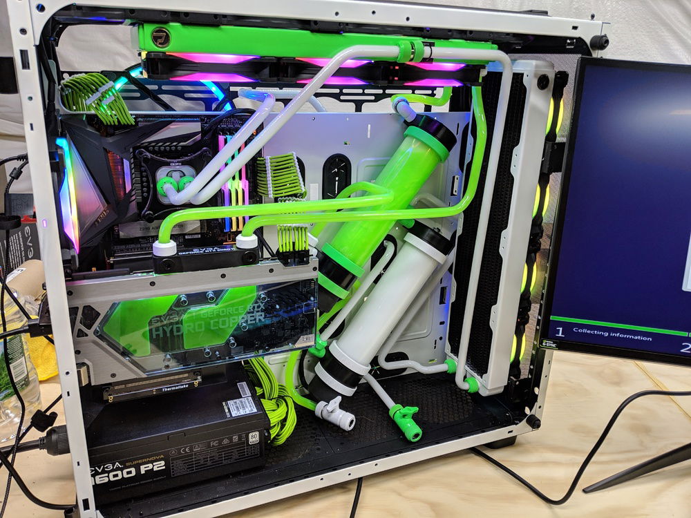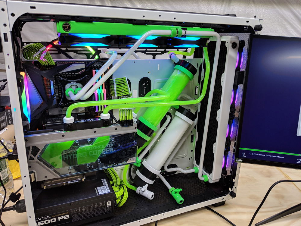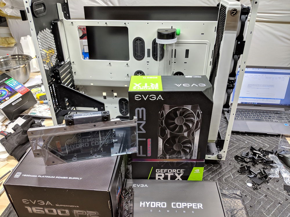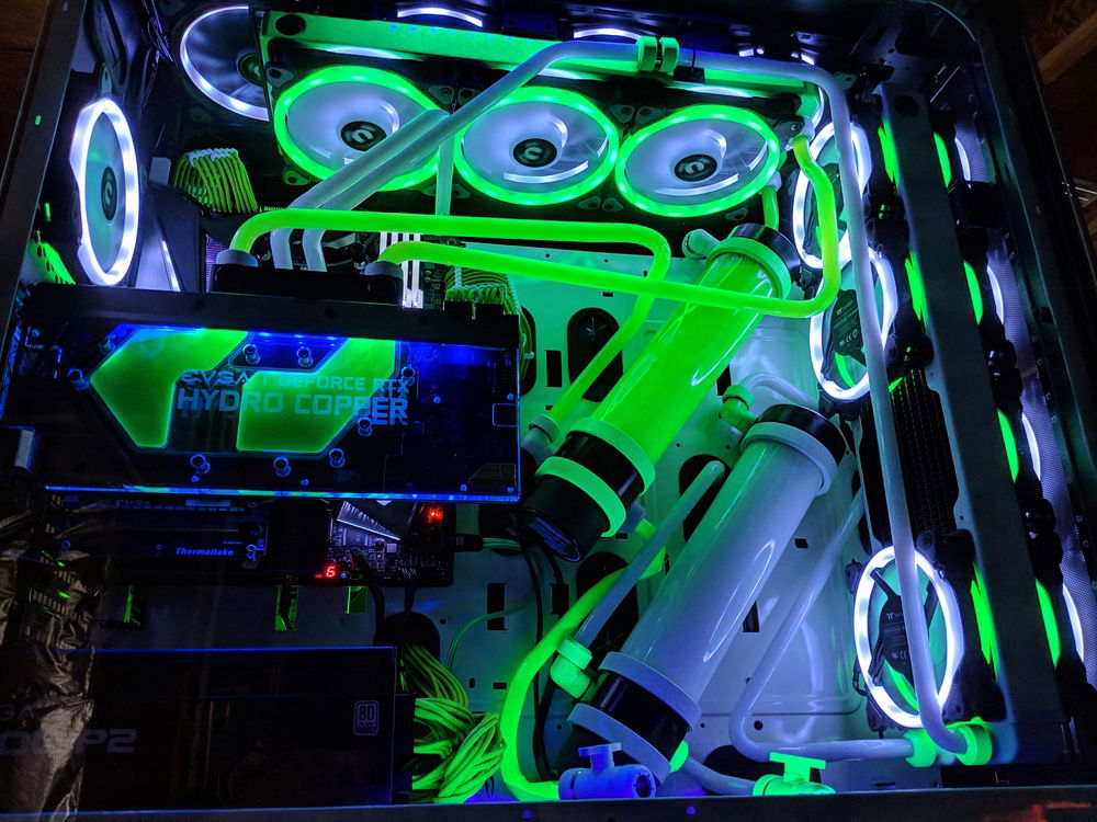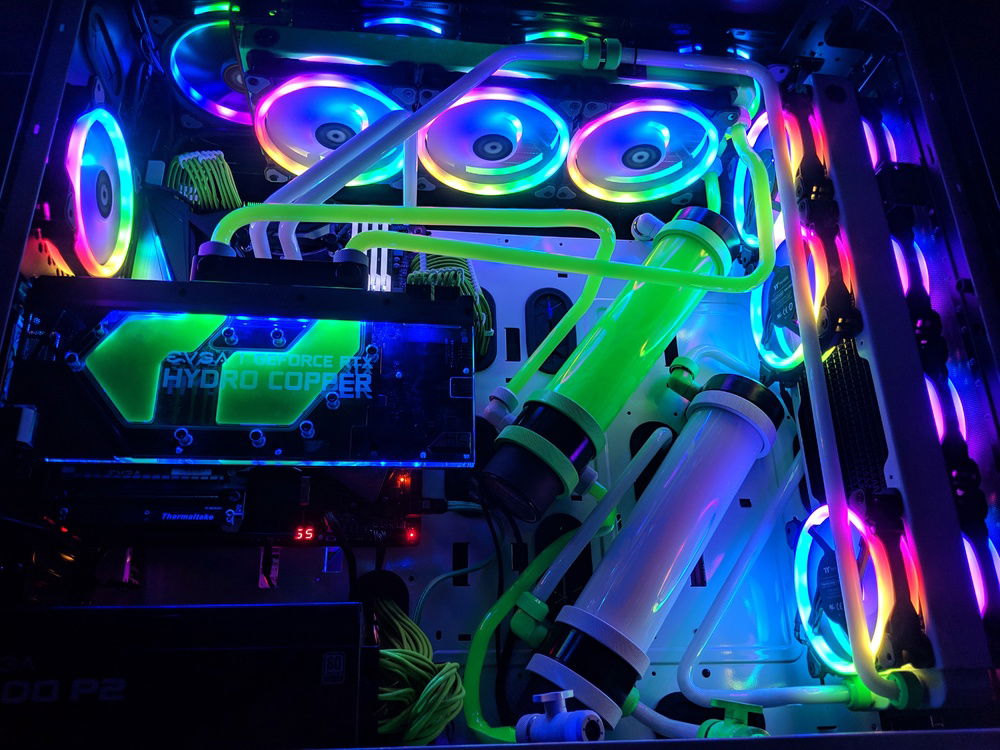 with the exception of the CPU block and GPU block all of the watercooling was built using Primochill components, they are excellent quality along with the XSPC and evga hydro copper block. The 9900k is not overclocked to anything crazy, set to 5ghz all cores and very stable. once i may work on tweeking this a bit over time. Currently seeing temps in the high 80c when going to 5.1ghz. the evga FTW3 overclocked fairly easly and quickly. seeing 2150 and stable with temps staying below 50c.