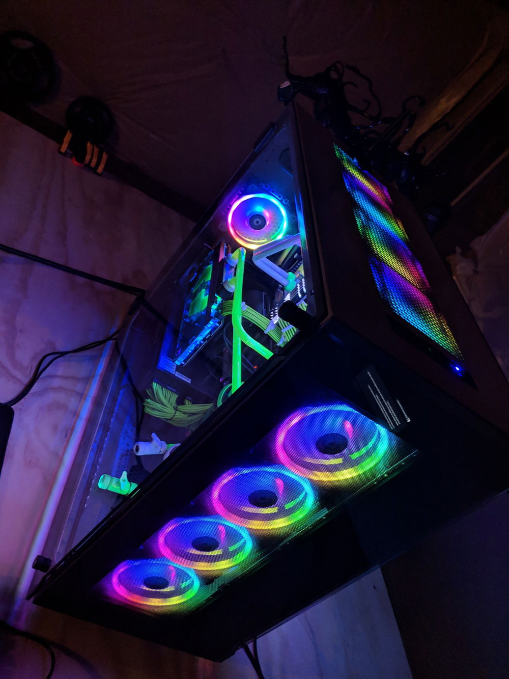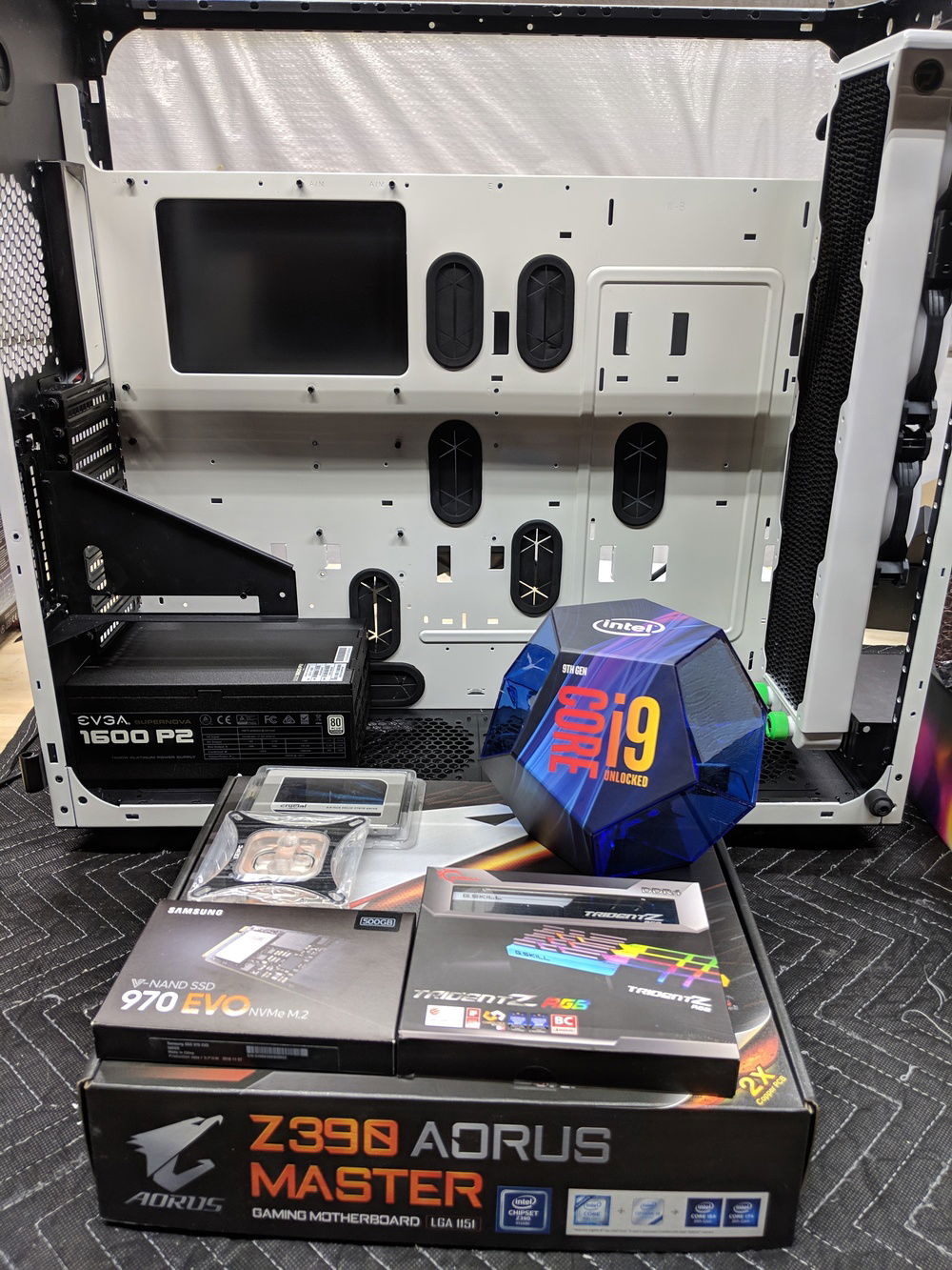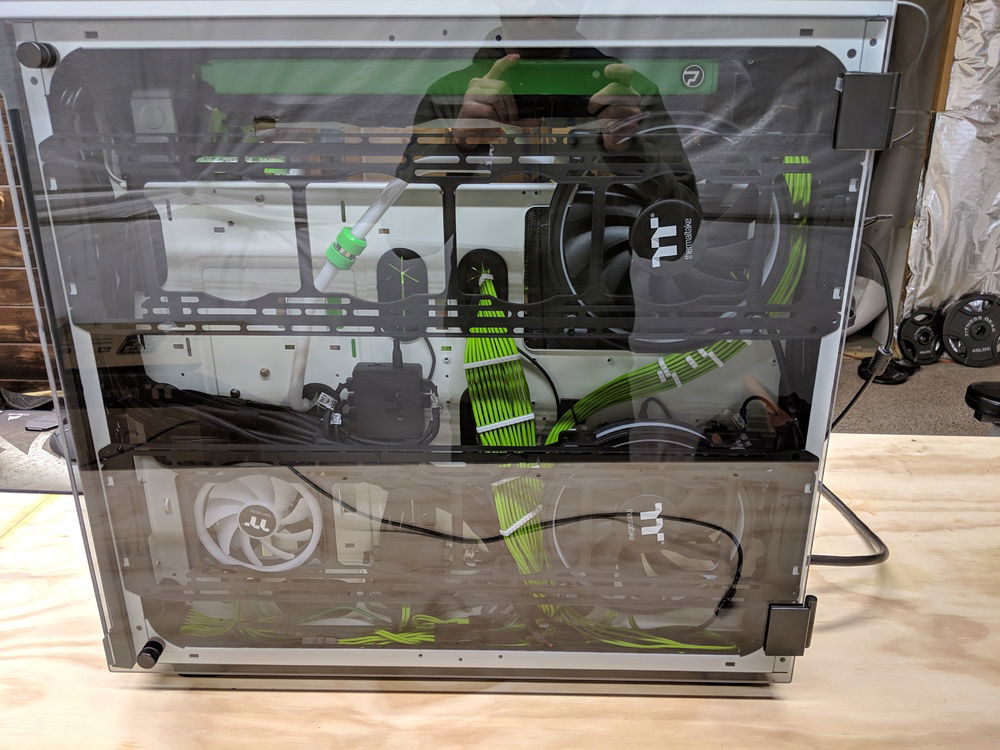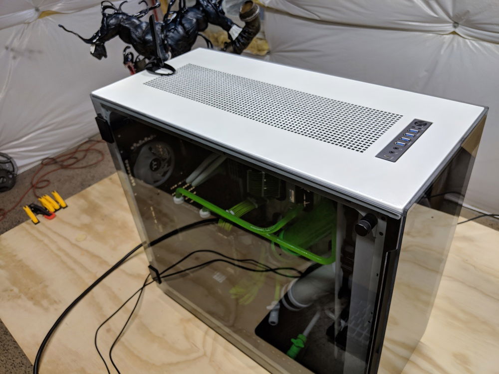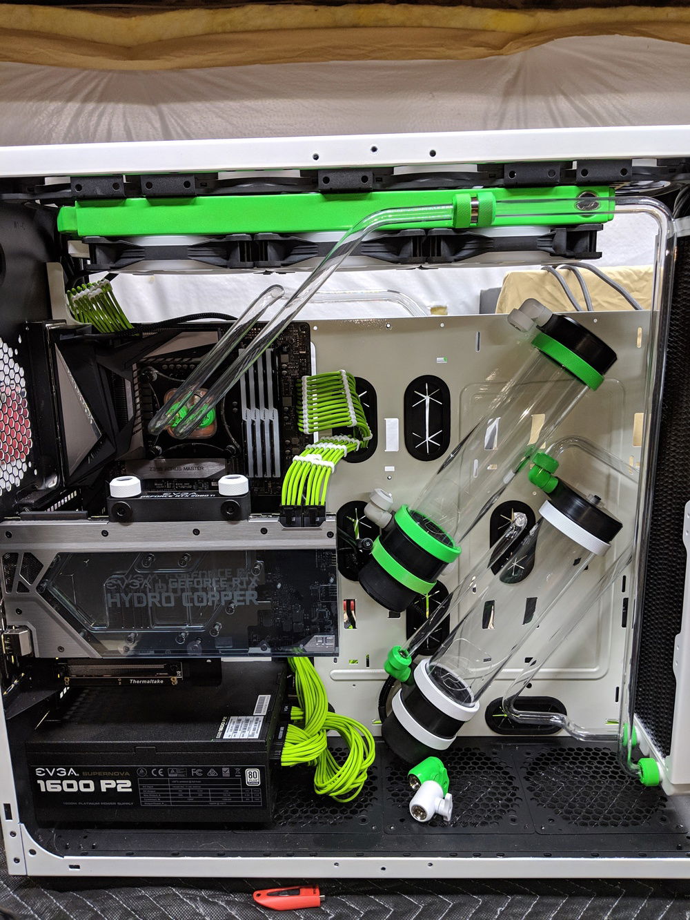 with the exception of the CPU block and GPU block all of the watercooling was built using Primochill components, they are excellent quality along with the XSPC and evga hydro copper block. The 9900k is not overclocked to anything crazy, set to 5ghz all cores and very stable. once i may work on tweeking this a bit over time. Currently seeing temps in the high 80c when going to 5.1ghz. the evga FTW3 overclocked fairly easly and quickly. seeing 2150 and stable with temps staying below 50c.