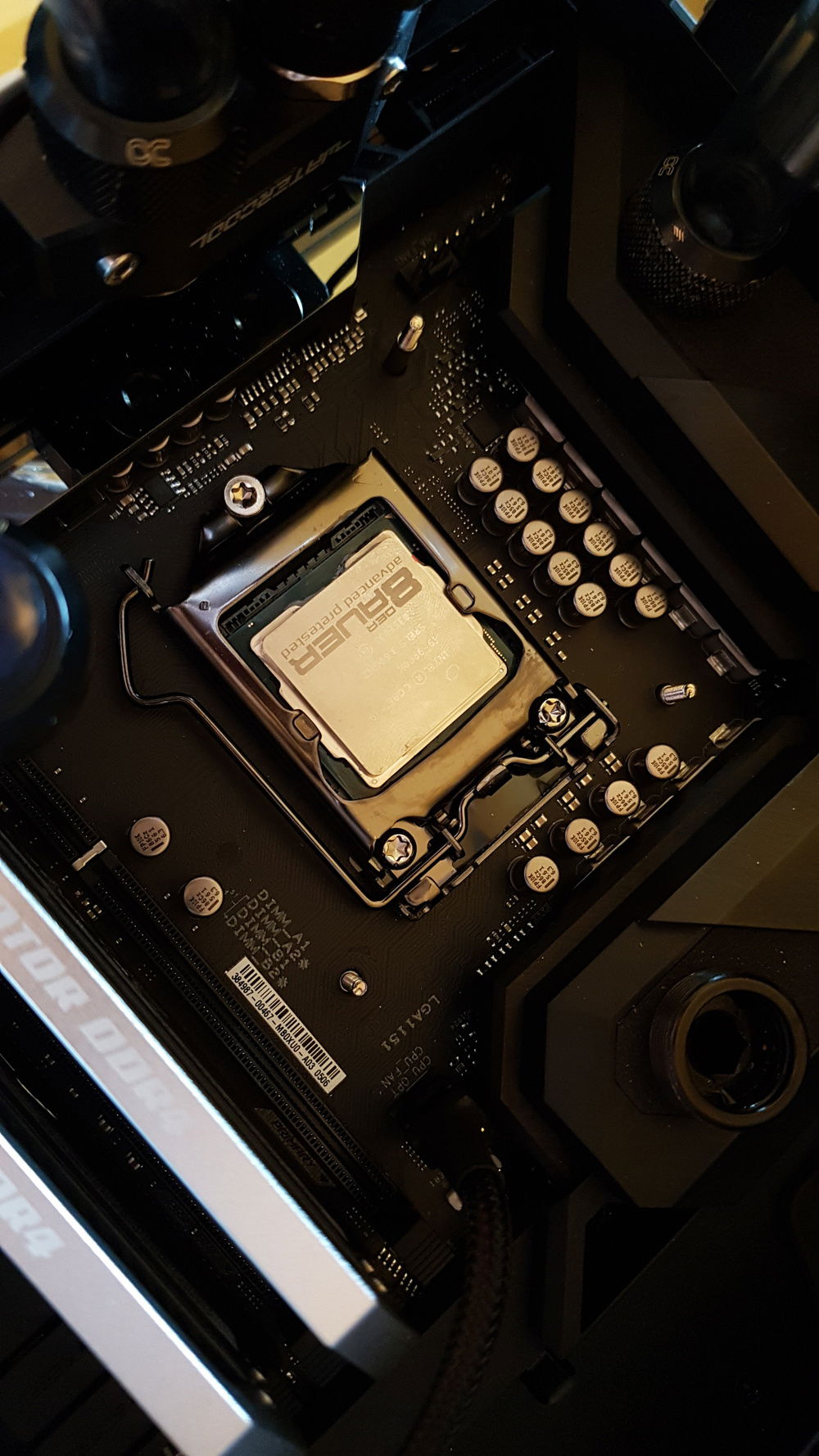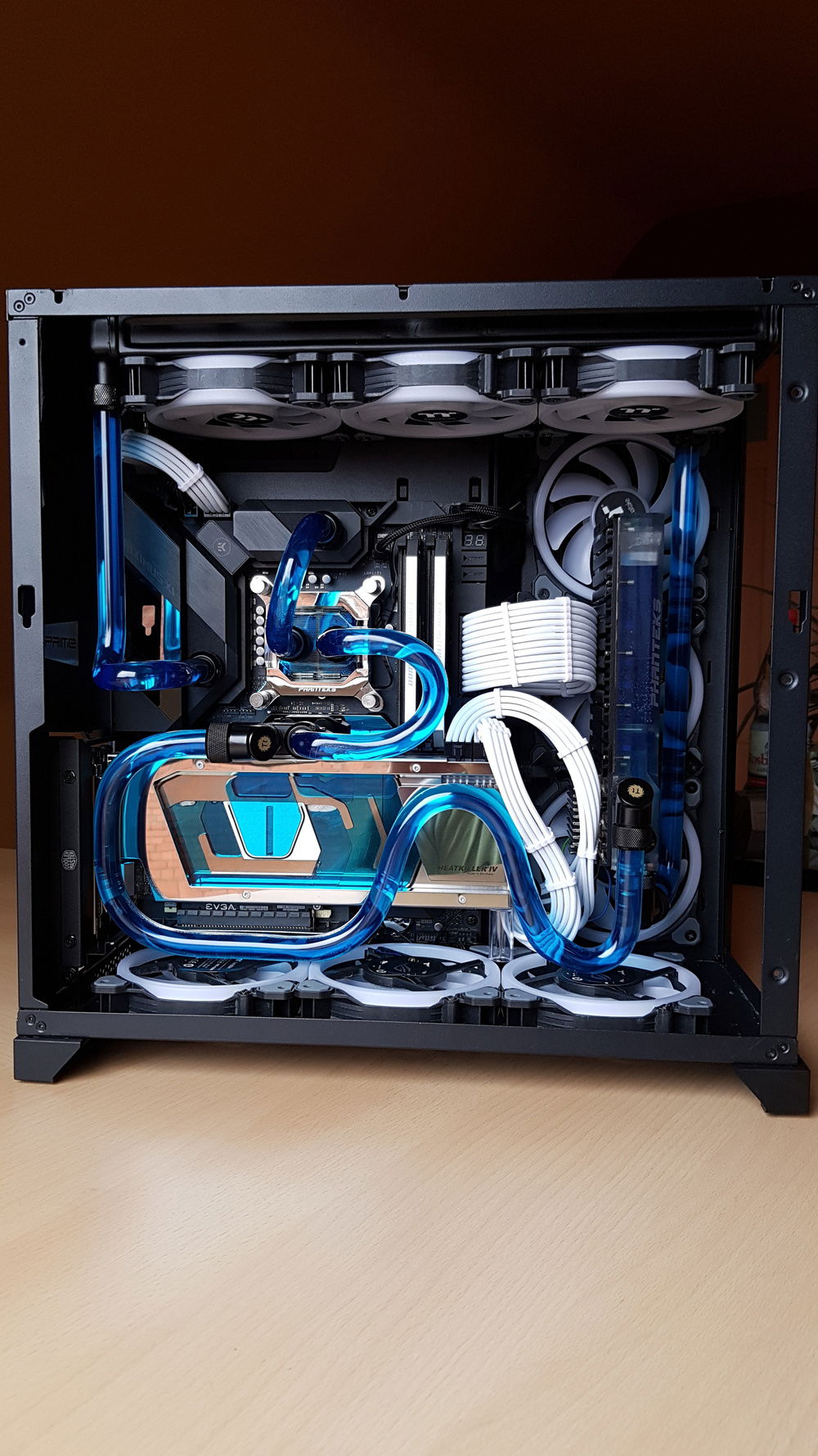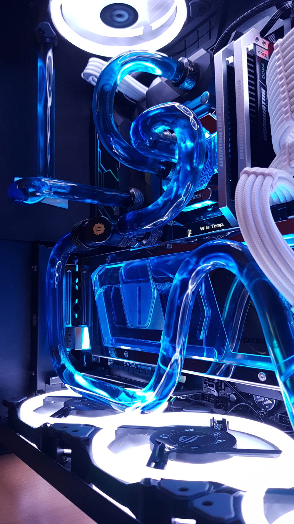 First I used my self delidded i7 8700k but now I upgraded to an der8auer i9 9900k which runs at 5.1 Ghz. My Gpu is cooled by an Watercool Heatkiller and I even made an YT tutorial for the installation.