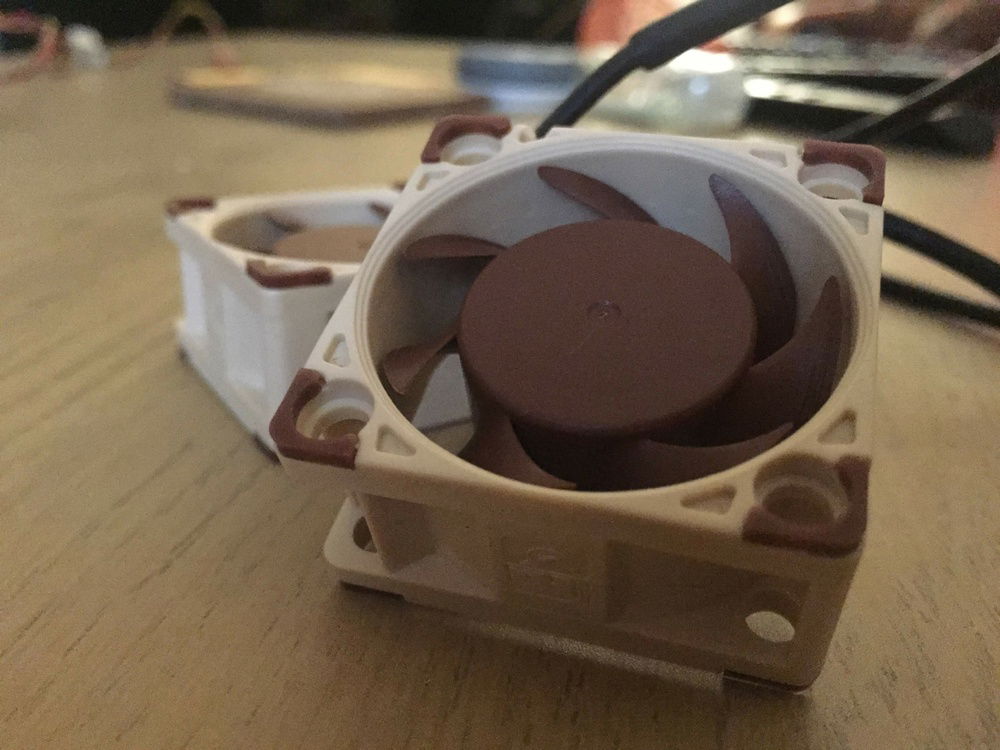 Added these two Noctua NF-A9x20 PWM fans to help exhaust air from the main chamber of the case. They're attached to the case with blu-tac for the time being.