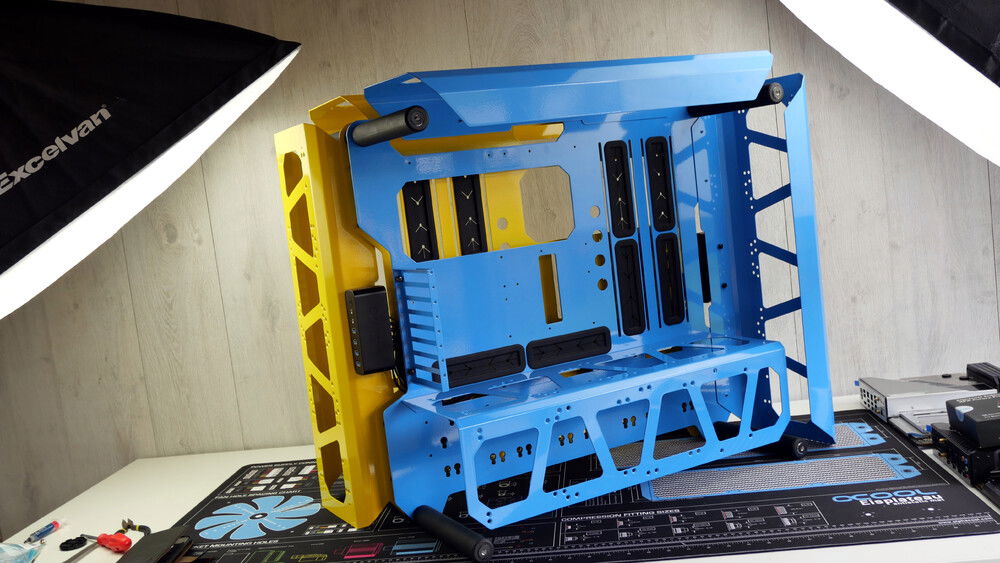 Featuring a custom dual Raijintek Enyo and a few other mods along with custom powder coating in Intels colours, it's all ready for Intel to enjoy! The Enyos fit back to back and are bolted together giving a complete 360 degree system.