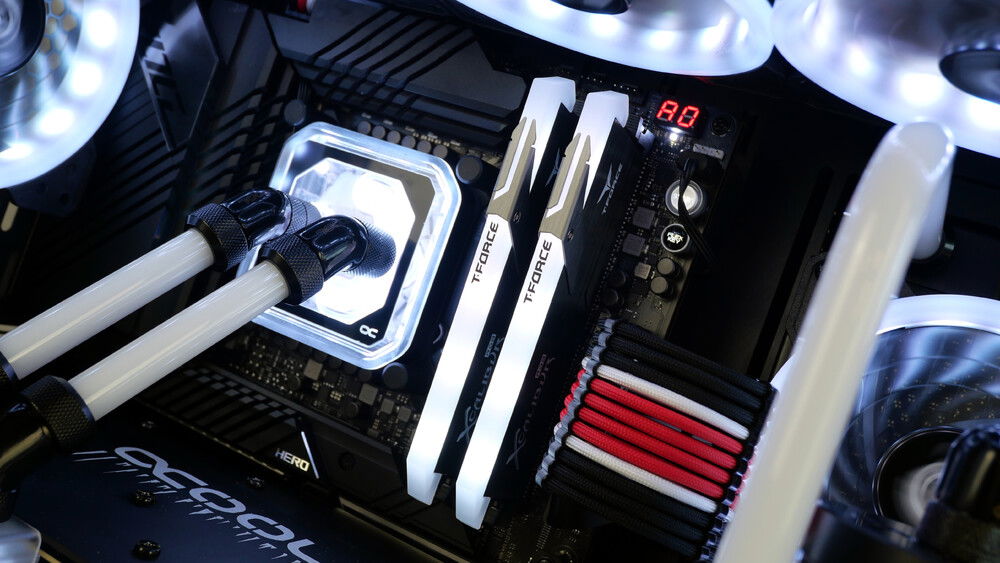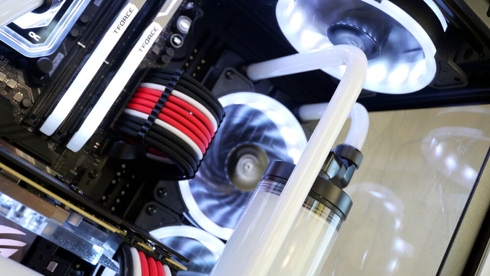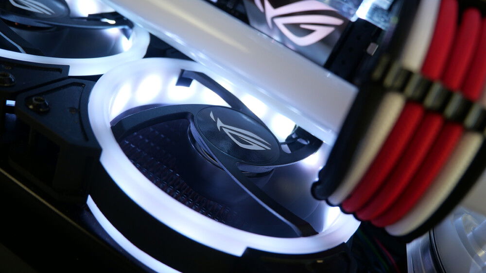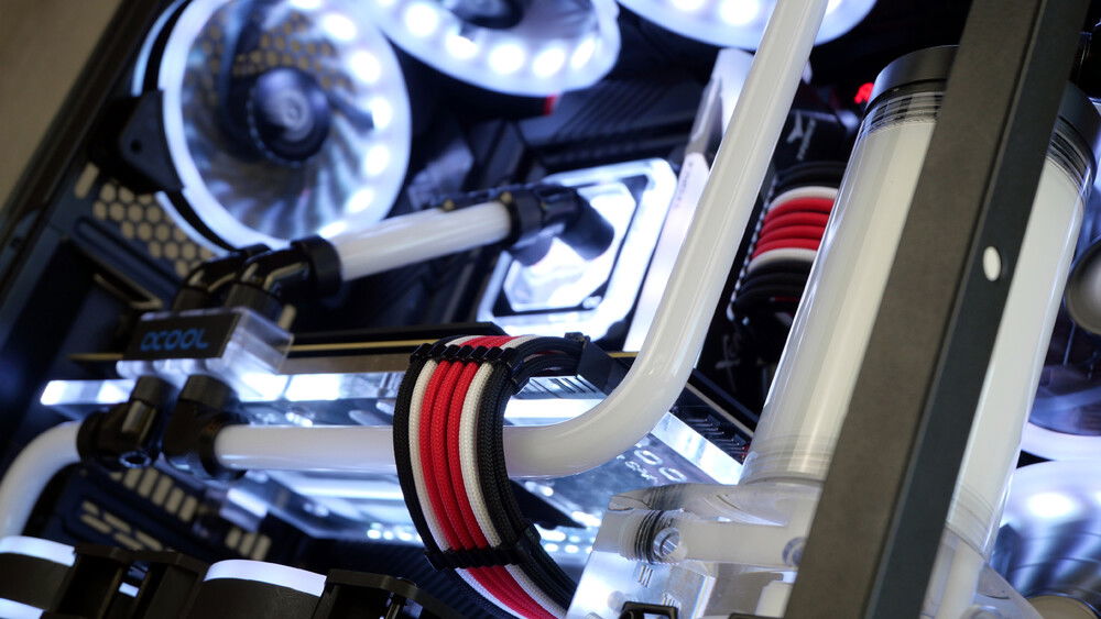 Rounding this out, there's a full custom Alphacool loop with Eiskylon Aurora Lux fans, de-badged, and retrofitted with ROG logos. Custom cables come courtesy of To The Wire - Mods, fitting the theme perfectly, all powered by the Be quiet! SFX-L 600W.