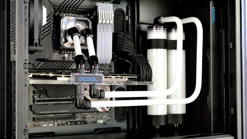 System built for Maximum PC article demonstrating 3d Printed parts for use as a reservoir holder.