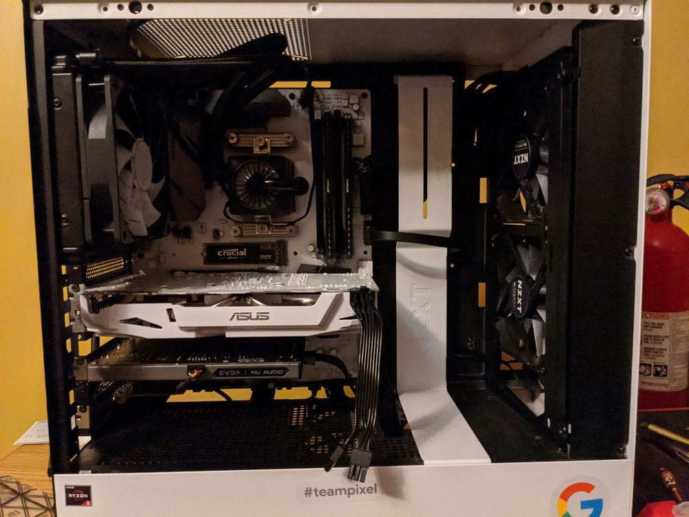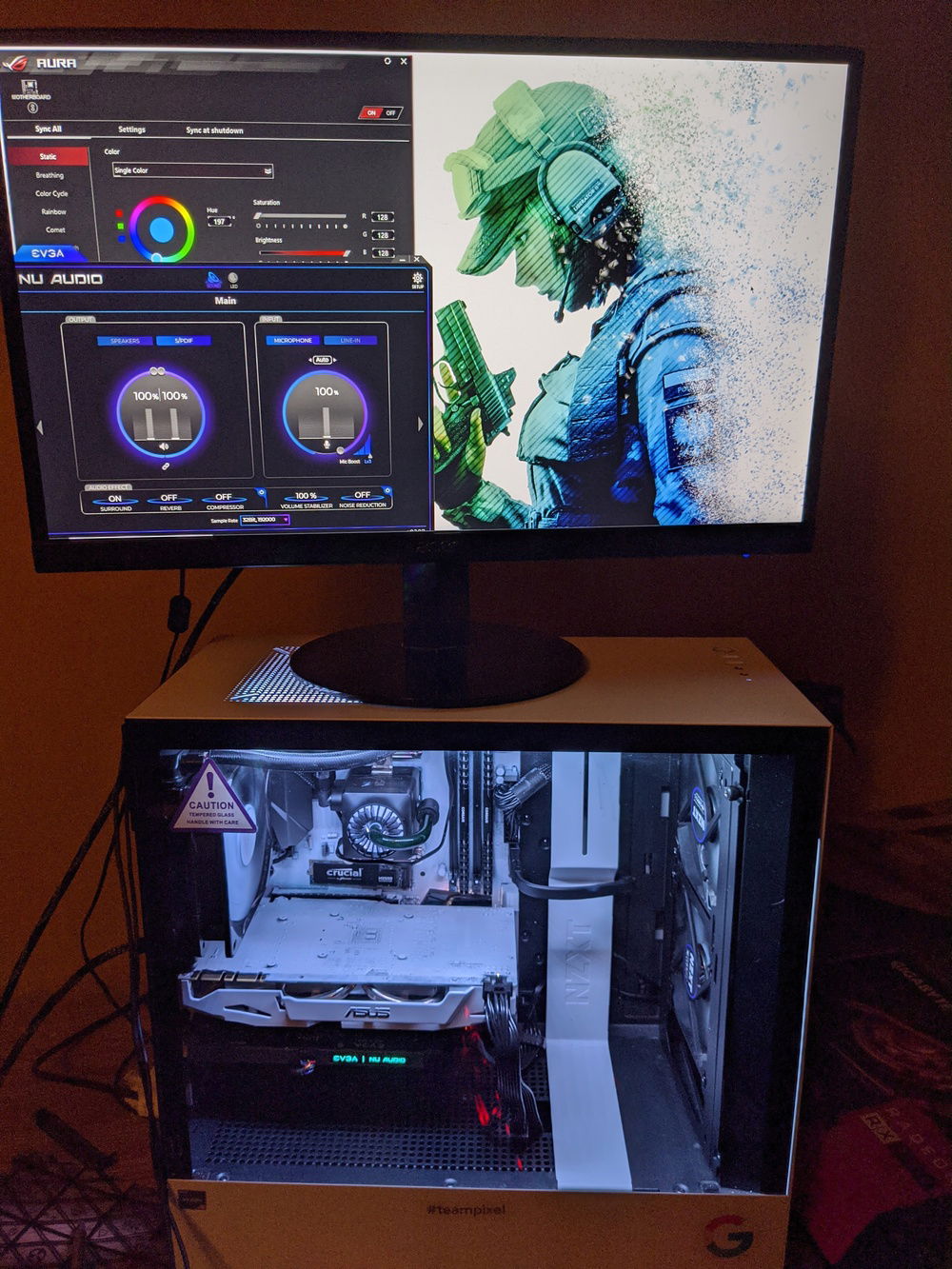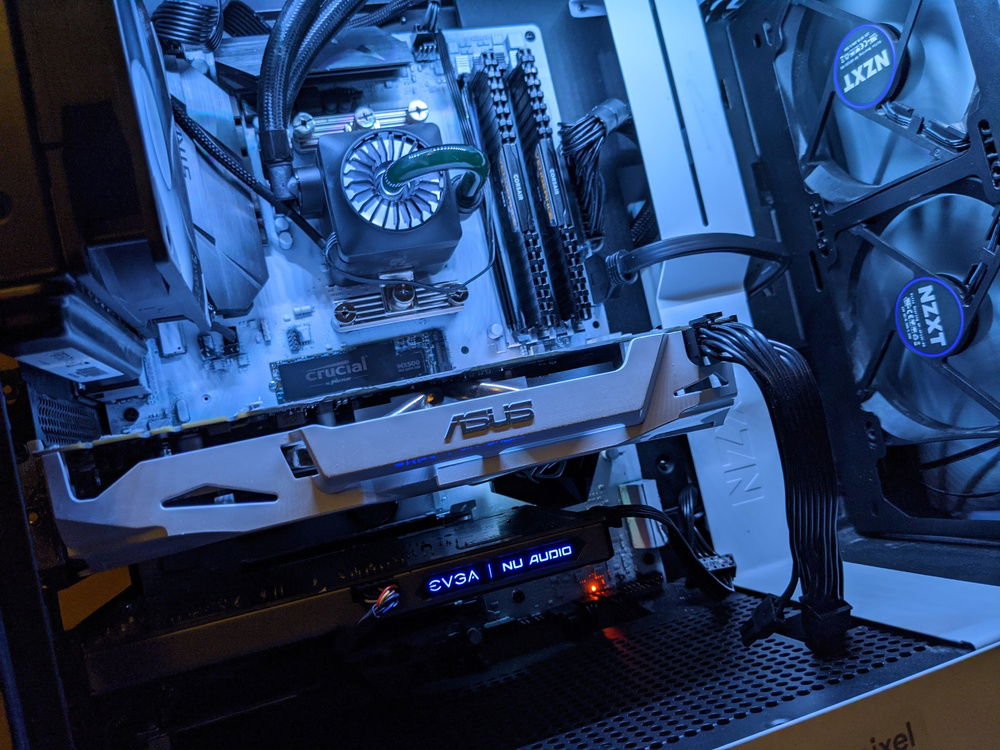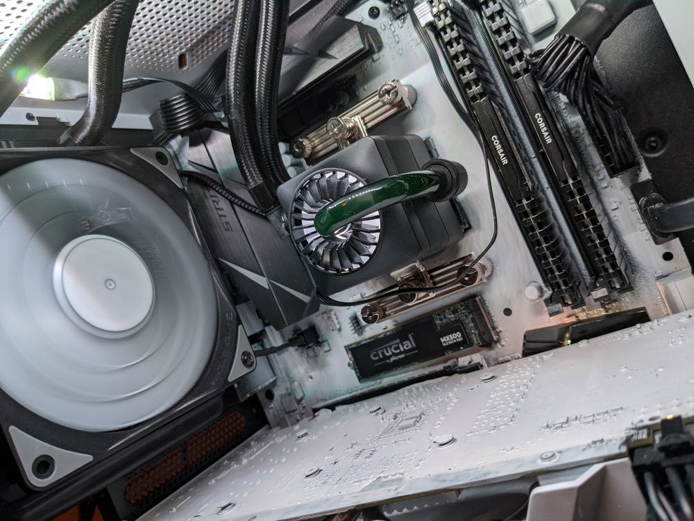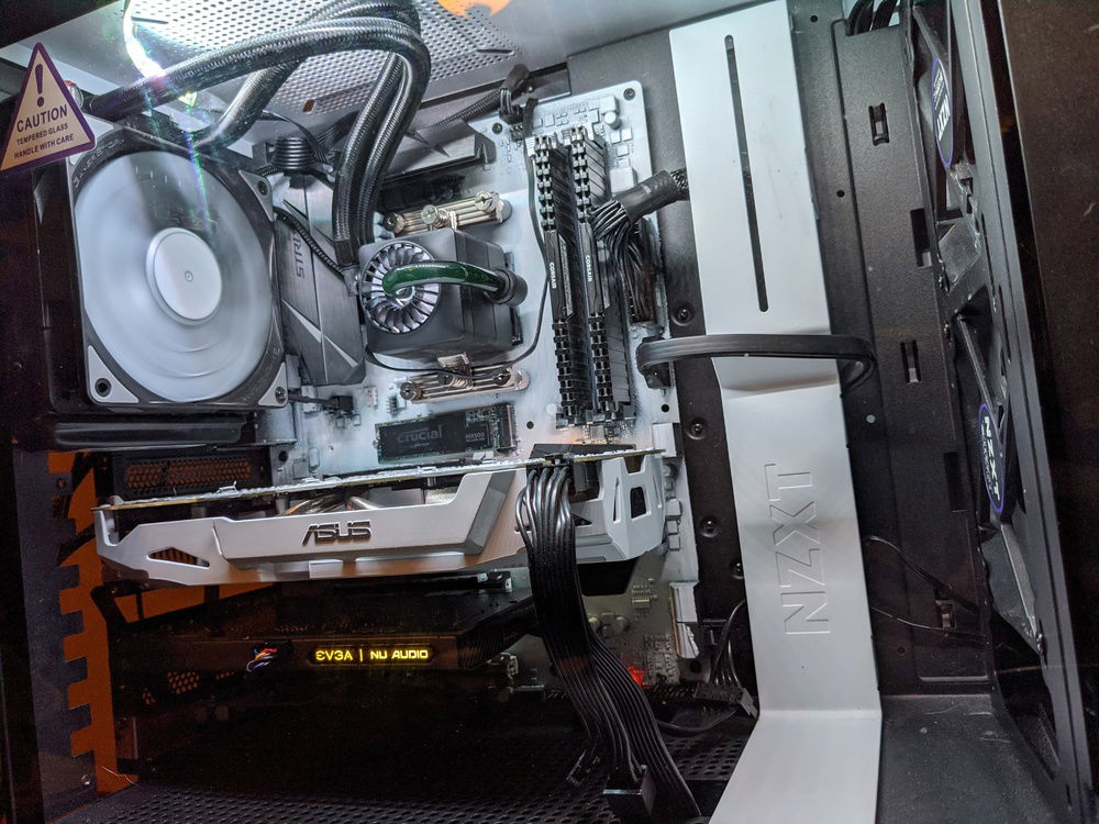 Mods: So far, the mods I’ve done are pretty simple, I added placti dip to the motherboard and graphics card to make the PCB white. I really love the metallic/rustic texture the placti dip created. The fans facing inward also have the plasti dip, but they didn’t turn out well, so I decided not to do the backside of them, but the rad fan looks better than expected and looks really cool when spinning.