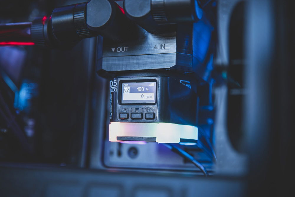 Aquacomputer Aquaero with two calitemp sensors (in and outlet) and a highflow sensor.