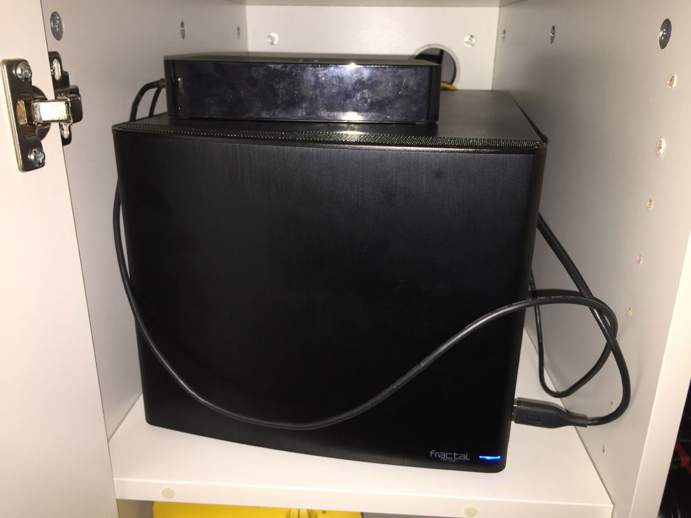 The mainboard supports up to 4 SATA devices of which one (SSD) contains the OS and two form a software RAID level 1 (mirroring), resulting in 4TB net storage space. The main reason for only having 4 SATA ports is that I wanted the server to be as silent as possible; the mainboard with the integrated CPU has passive cooling, the case fans do enough airflow to keep the CPU, RAM and storage devices cool. Additionally there is an old external USB-connected harddrive with 500 GB of backup space.