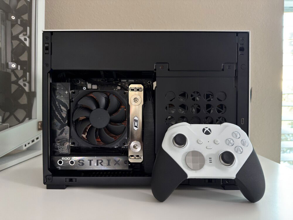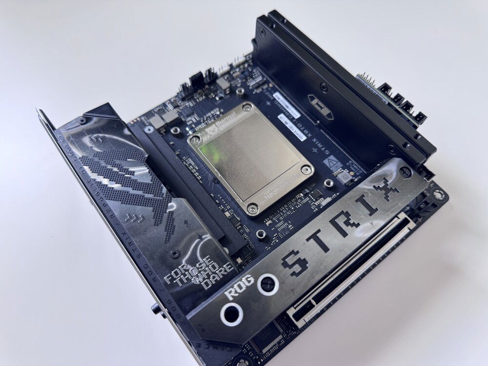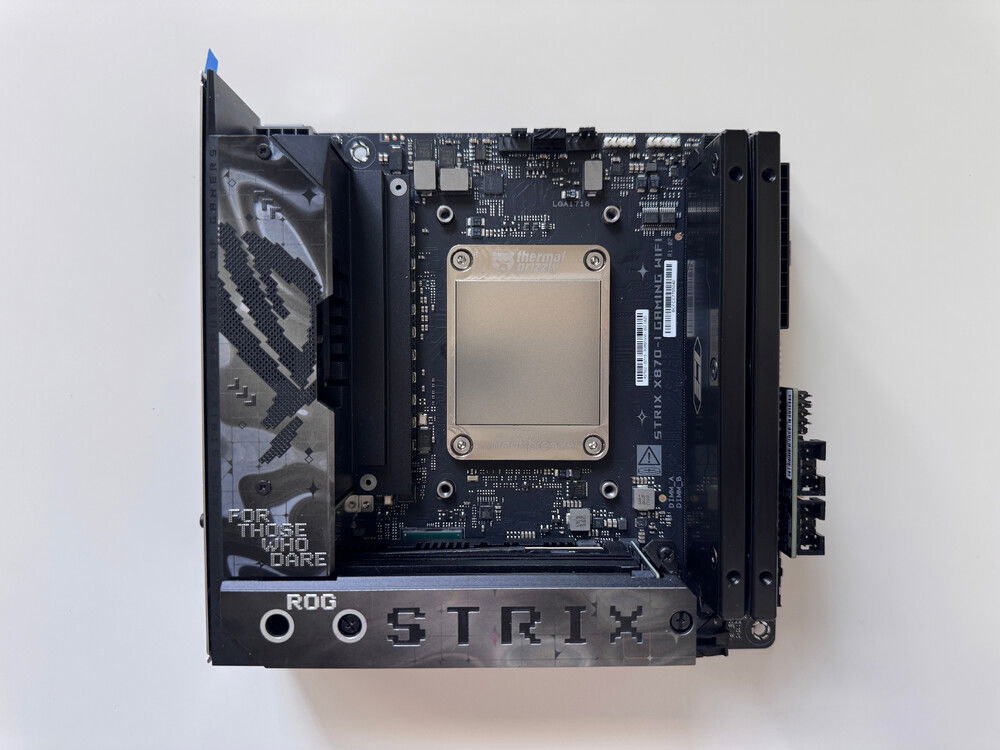 Mochi is an ITX, small form factor computer based on the AMD X870 chipset and represents the best of my mainline rig in a high-performance, portable package with minimal compromises. It was designed and built on the ROG Strix X870-I Gaming WiFi motherboard for its robust overclocking potential for both CPU and memory. At its heart, it is powered by a delidded 16-core, 32-thread AMD Ryzen 9 9950X3D with an overclock of 5.5GHz on both the 3D V-Cache cores and the non-3D frequency cores with an FCLK overclock of 2000MHz.