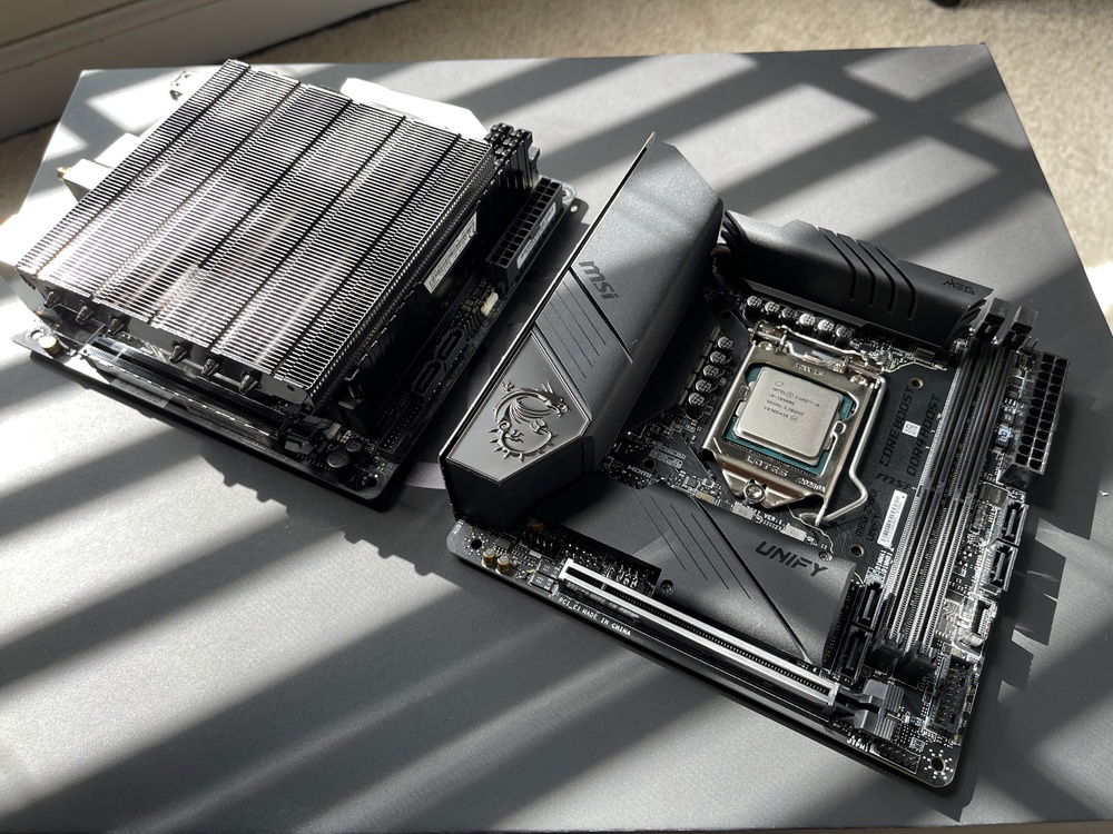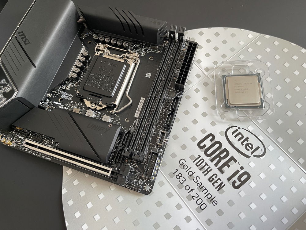 Sunlite is an ITX small form factor computer based on the Intel Z490 chipset and represents the best of Sunway in a high-performance, portable package. It was designed and built on the MSI MEG Z490i UNIFY motherboard for its high CPU overclocking and undervolting potential. It is powered by a highly-binned 10-core, 20 thread Intel Core i9-10900K LTX Golden Sample with an all core overclock of 5.1GHz and a ring ratio of 43. It is paired with an NVIDIA RTX 3080 Founders Edition and features 16GB of Corsair Vengeance DDR4 memory tuned and overclocked to 4266MT/s with a memory latency of 16-17-17-38.