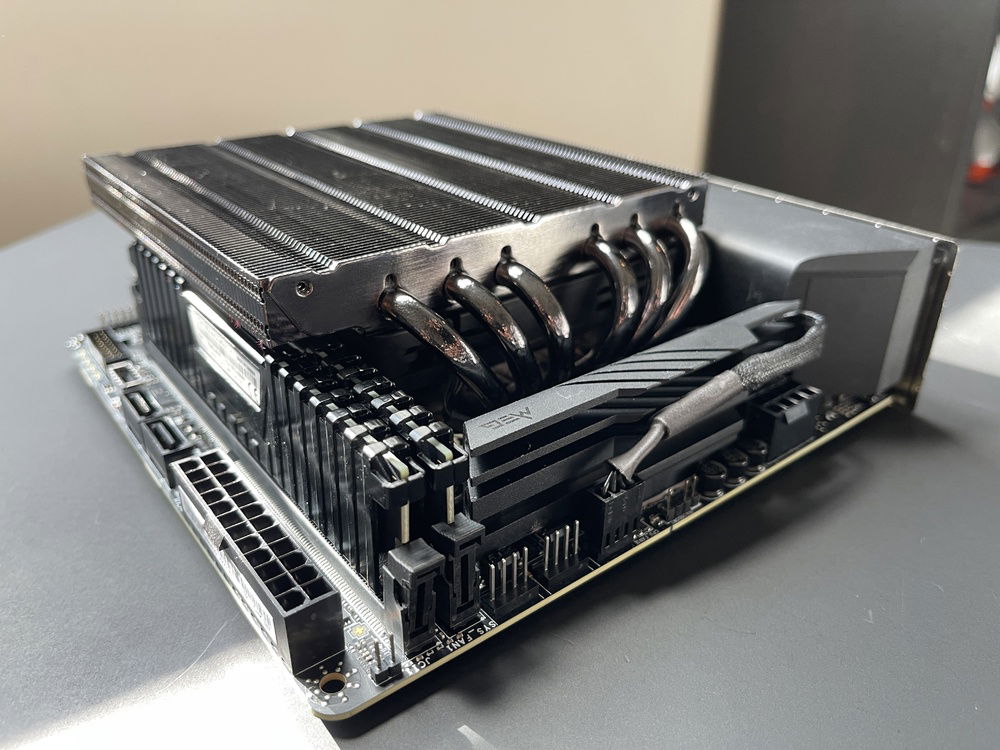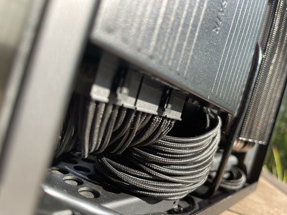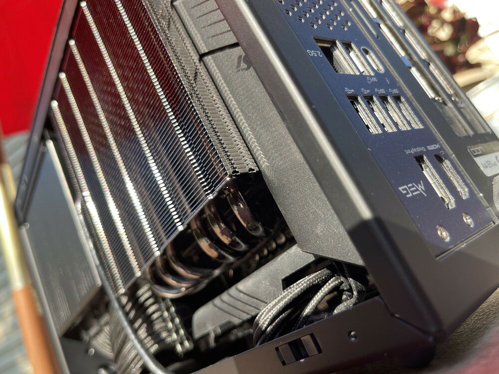Airflow is handled by a Alpenföhn Black Ridge for both the CPU, VRM and memory while the GPU is actively cooled by its dedicated cooling solution. Cold air is taken in directly from the outside of the case on the CPU side an exhausted out of the top of the case. As for the GPU side, cold air is taken in through the GPU's rear fan exhausted out of the back while the front fan takes in air and is then passed through and exhausted by the power supply from the top of the case. With this multi chamber and passthrough setup for various components, this means that the system can achieve a very efficient cooling profile and remains silent at idle, moderate use and slightly audible during heavy gaming.