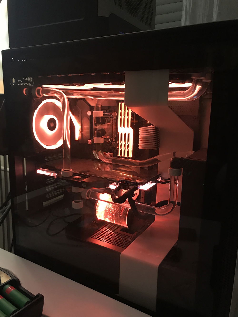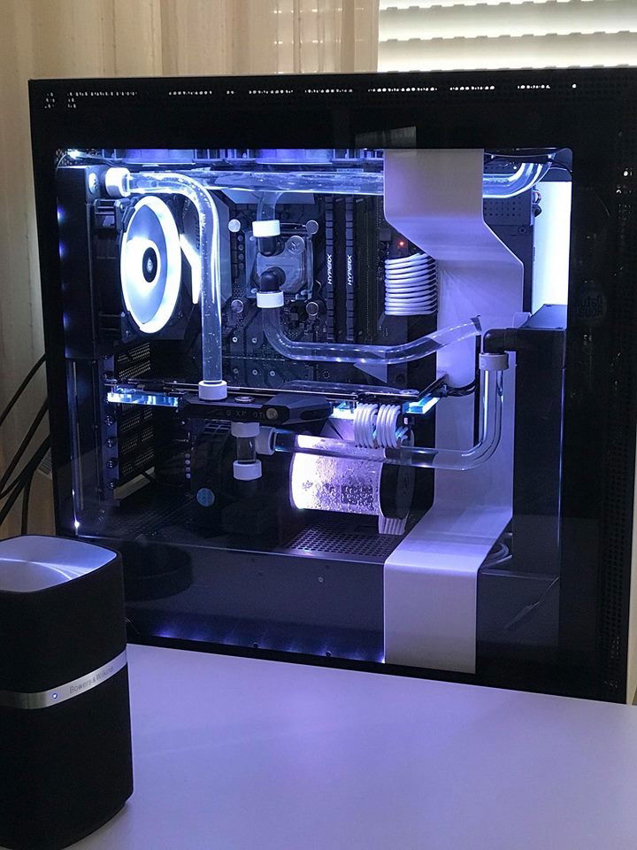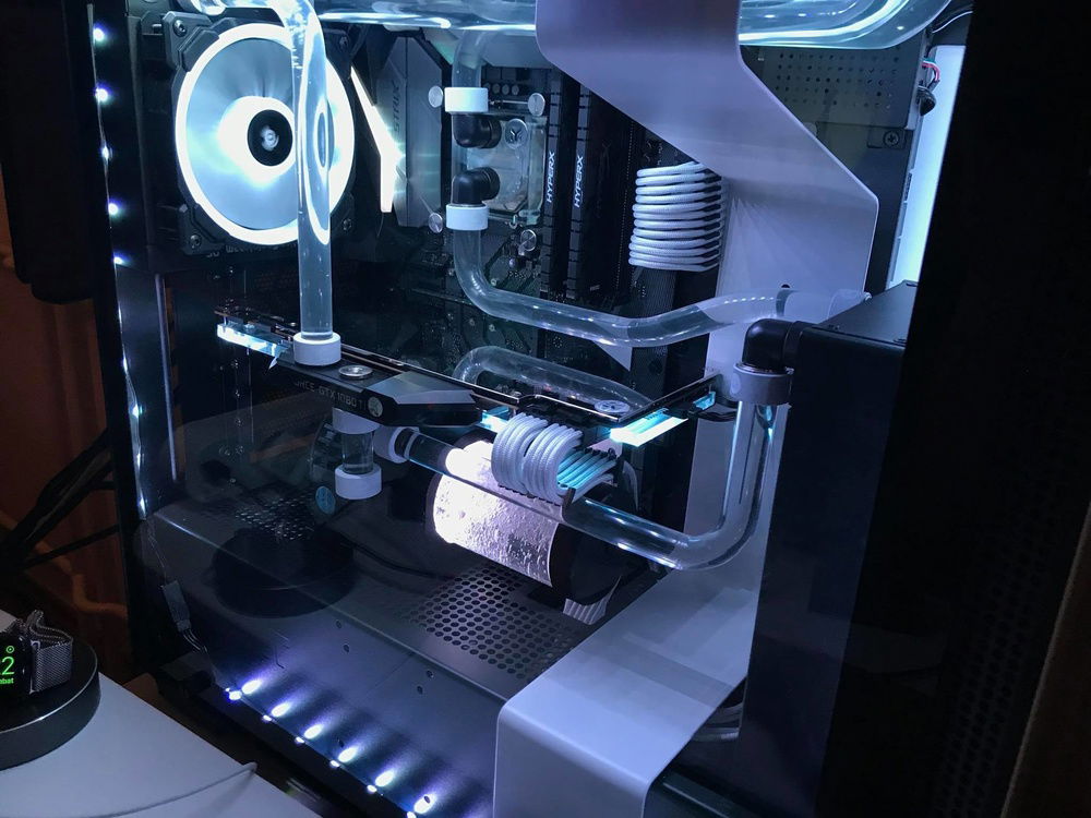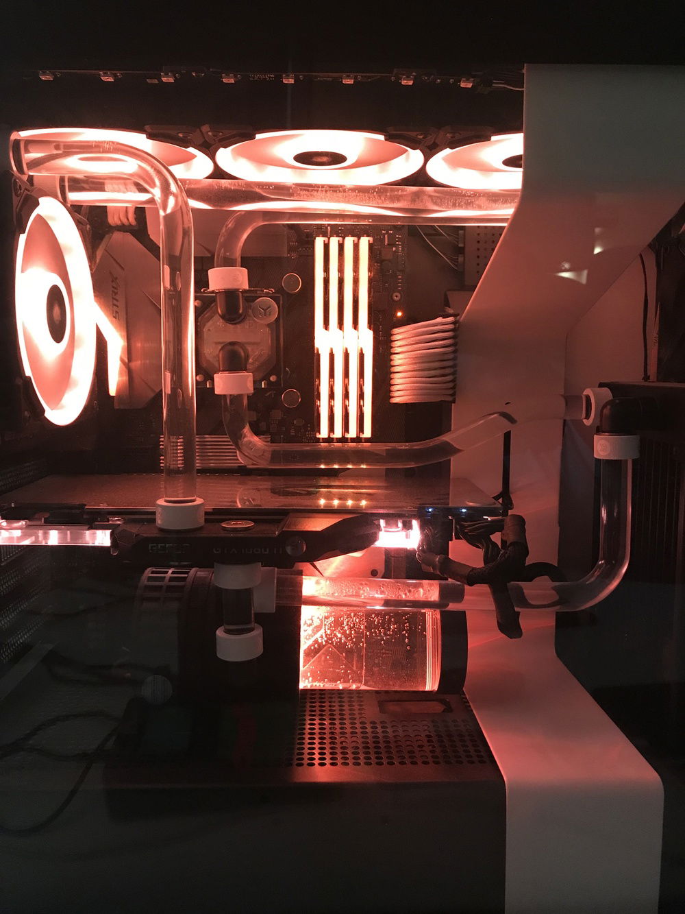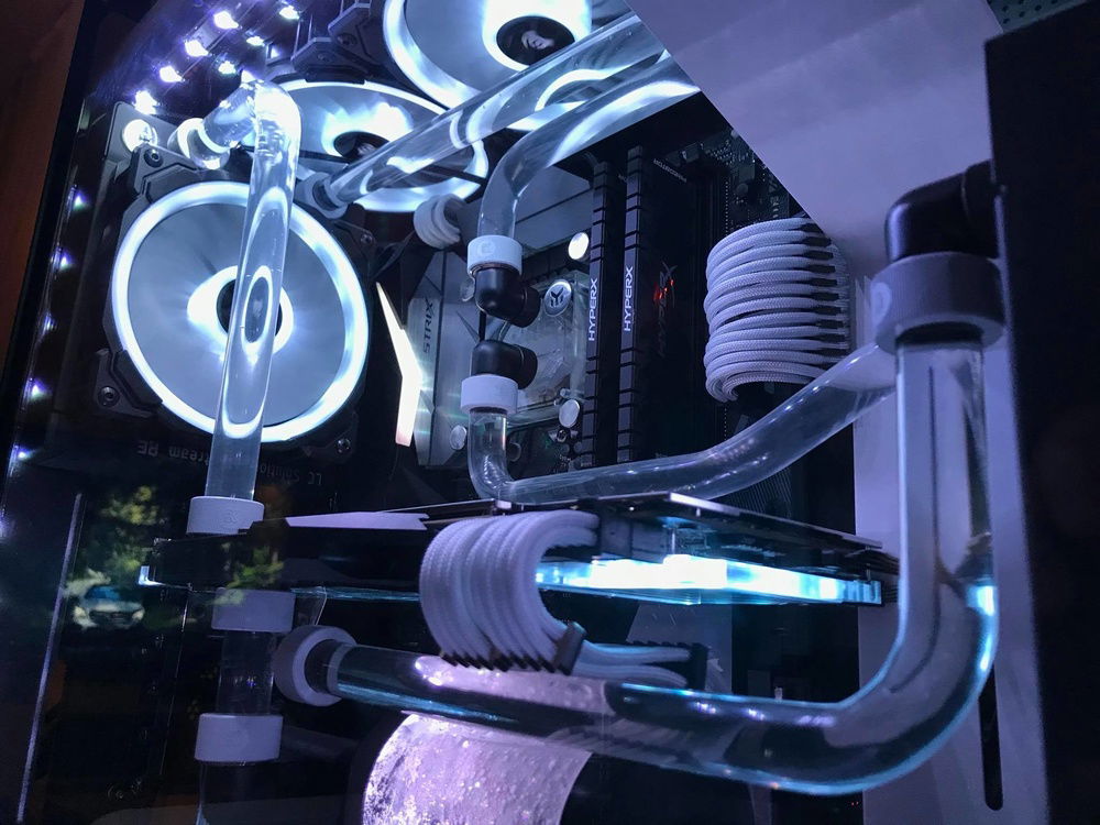 Built into a NZXT h700i with an almost full (no RAM and MB VRM are watercooled) EKWB custom loop with rigid 16mm acryllic tubing and almost 950Watts of cooling capacity (@30C° water temp.). Plans are to add a 2nd 1080ti. What is not on the pictures (or barely visible): - The build has already 4x8GB TridentZ RGB modules - The 1080ti is not Poseidon, but a Strix with EKWB full cover block (not selectable from the list) - Everything is RGB capable, but looks silly so decided to stick with white lighting only.