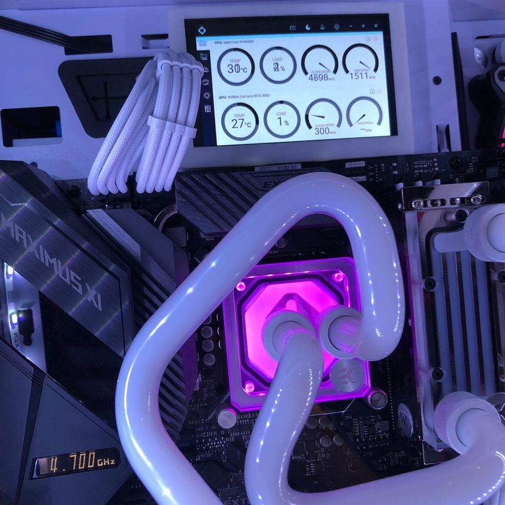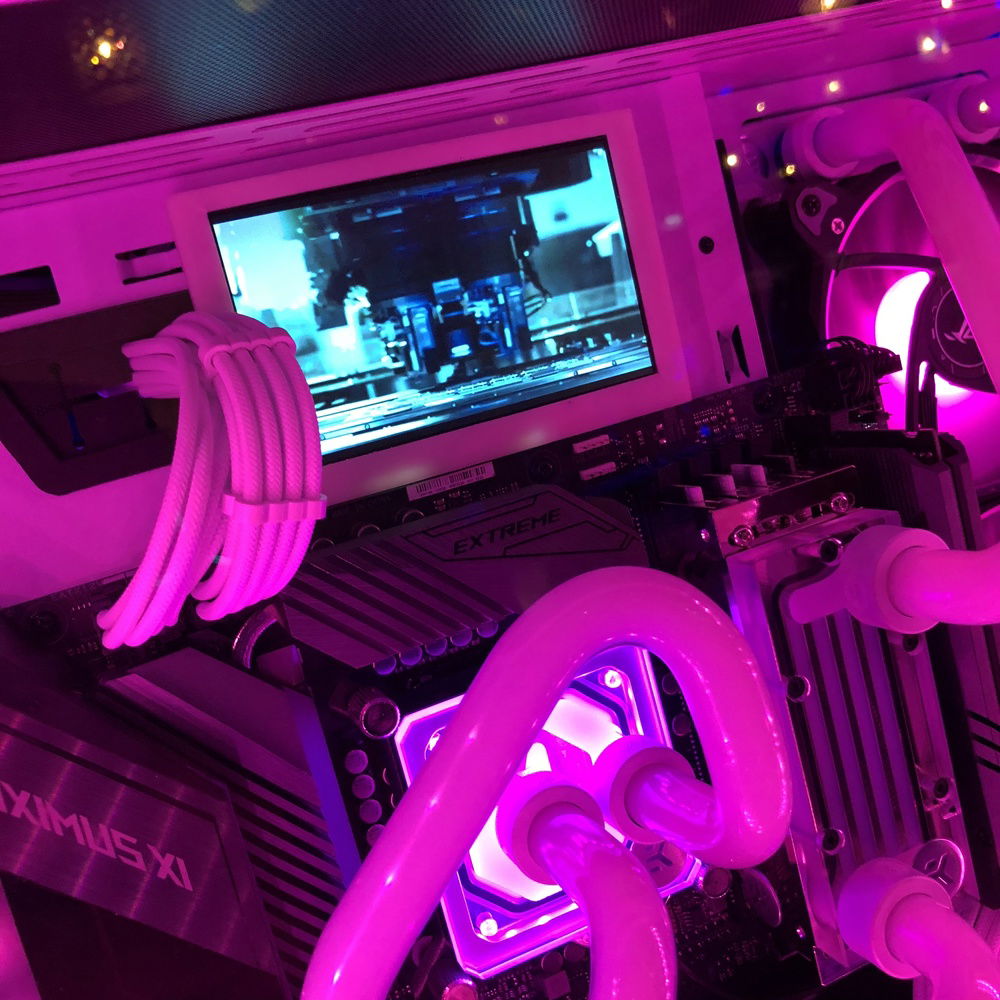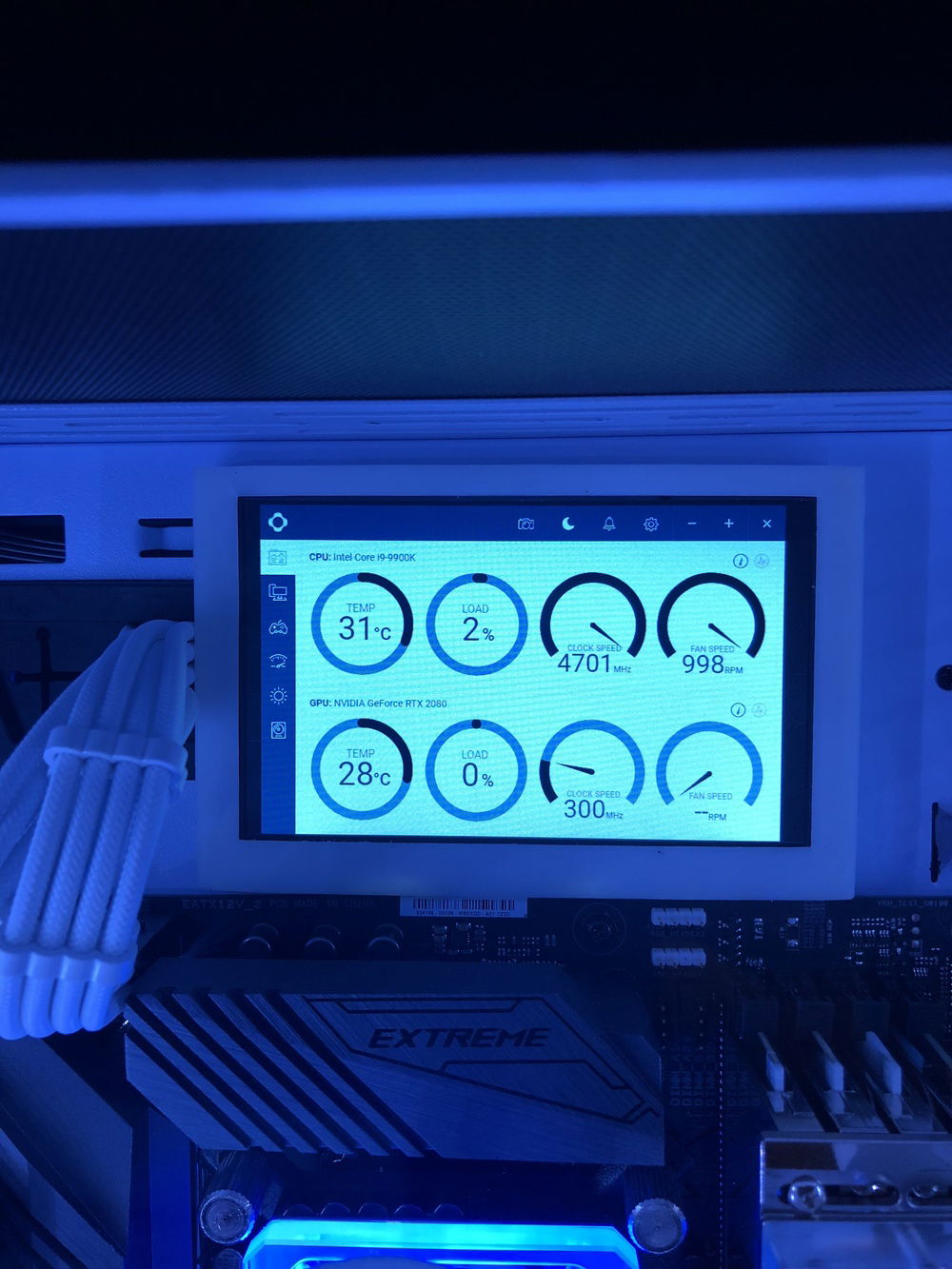 In the top of the case we have our signature screen. We make theres screens in house using 3d printed components. The screen can be used as a second monitor or for showing all the clocks and temps of the system in real time.