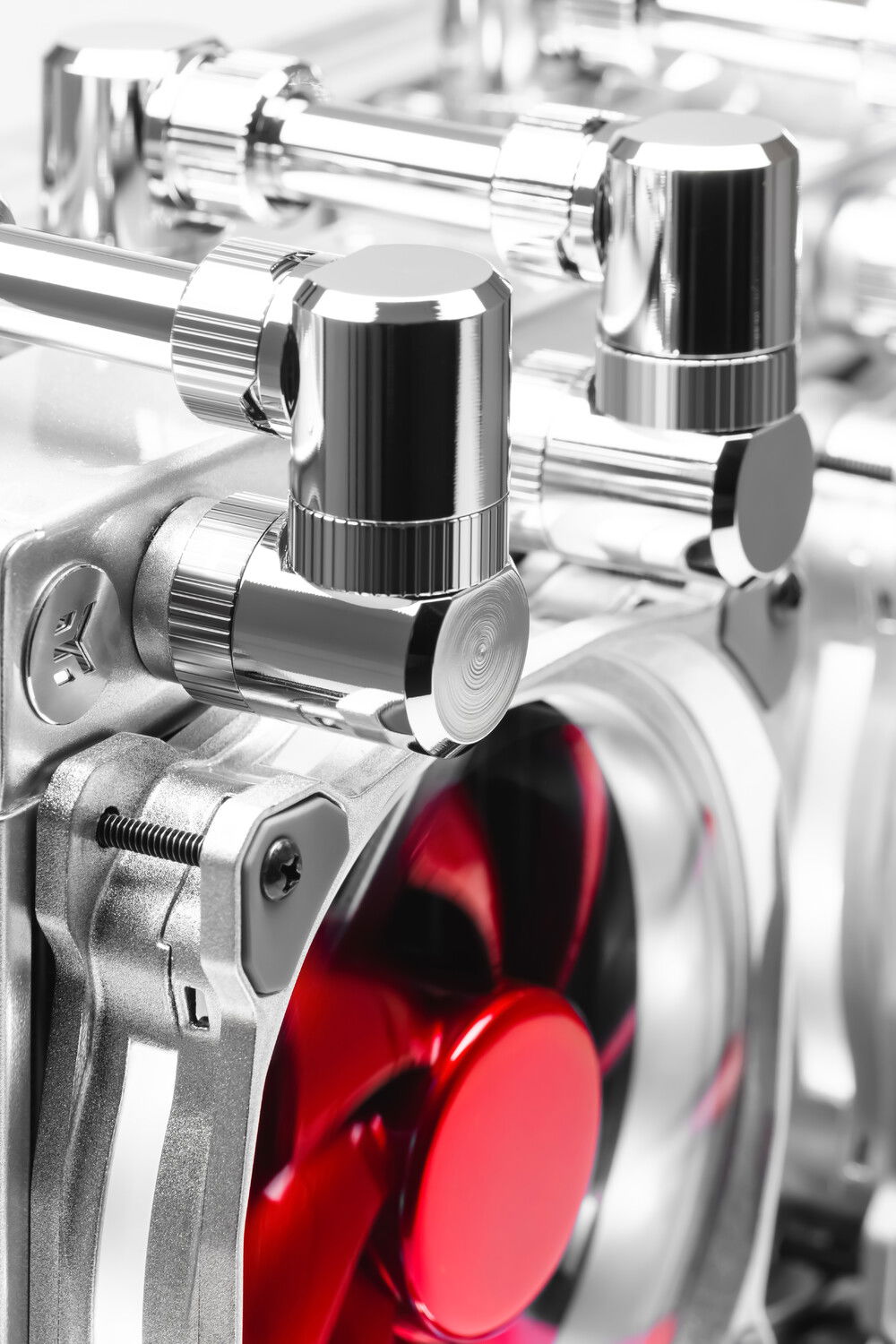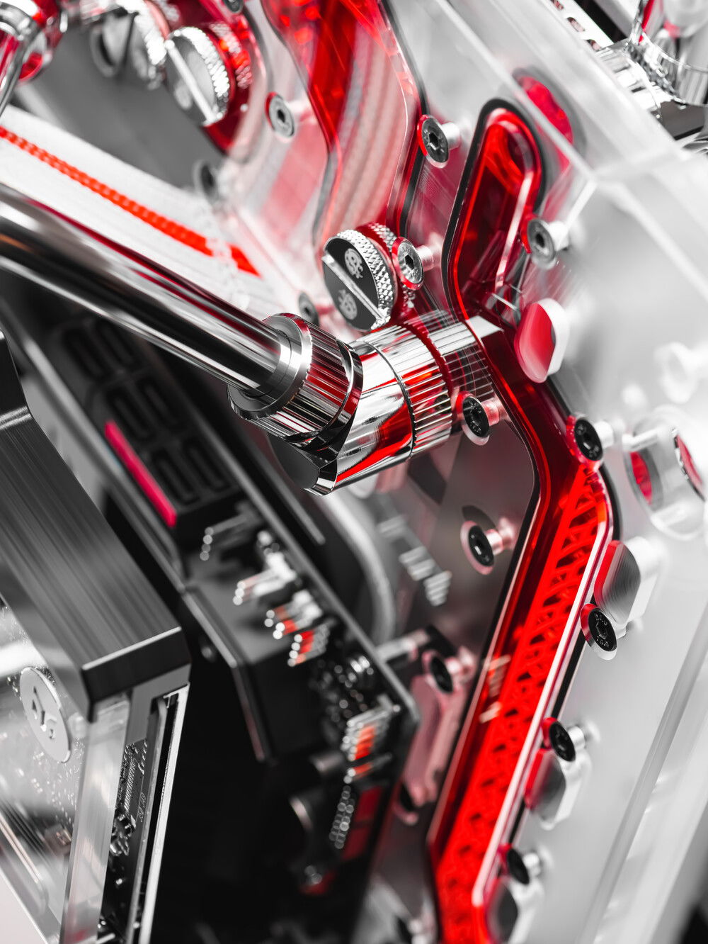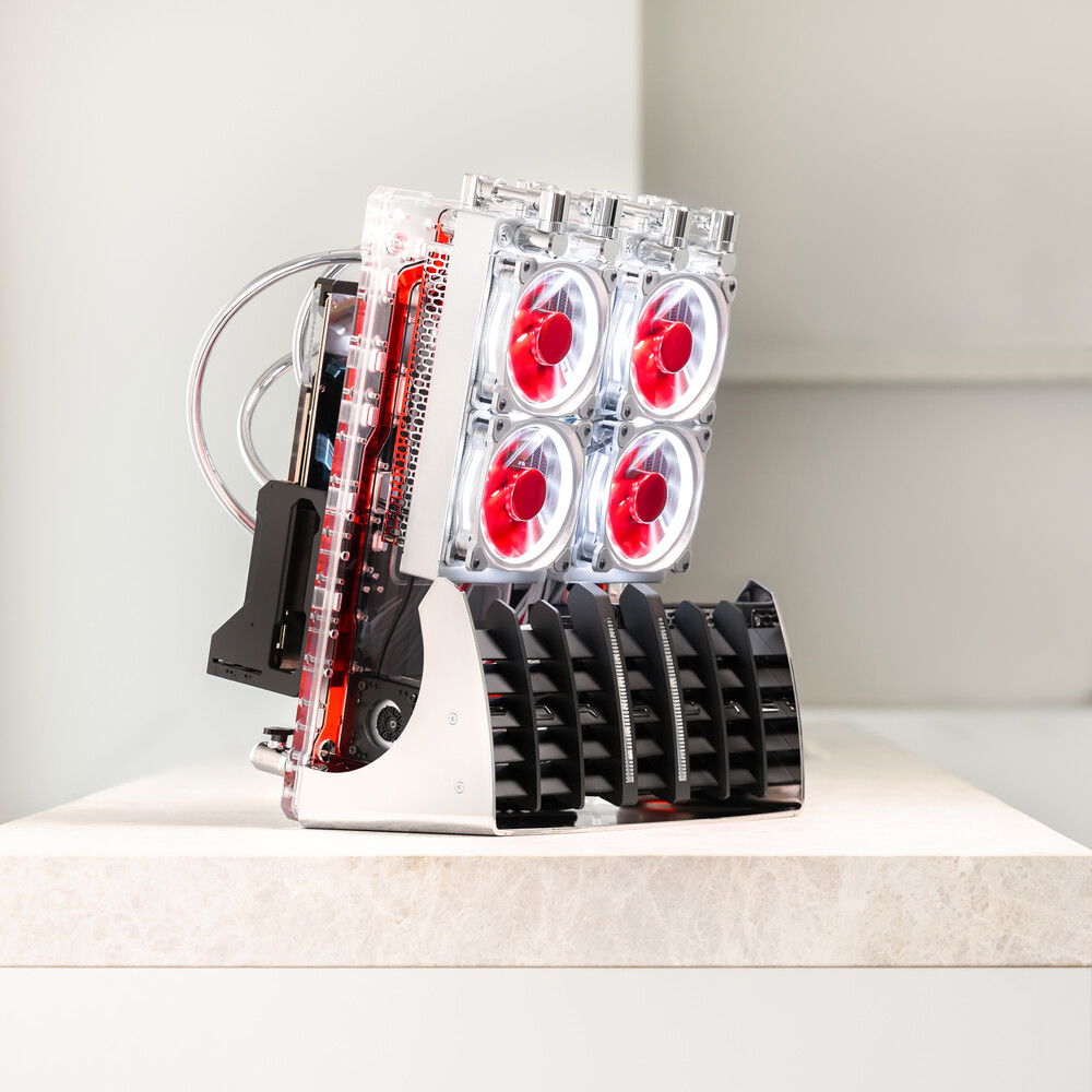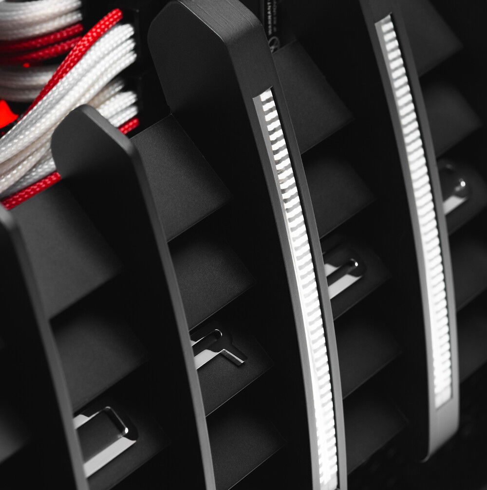I finally made a project for myself that will be used for 3D drawing, graphics, and independent activities. I am a huge Porsche enthusiast so I took inspiration from the grill of the Porsche 992 Carrera S. This idea was further developed into a custom chrome base with built-in grill and led strips. further, a silver/chrome/red color theme was fleshed out by a custom paintjob that subtly accents the fans, radiators, custom cable sleeves and grill. The tubing reflects abstraction and organic forms that look great in a clean and minimalistic office.