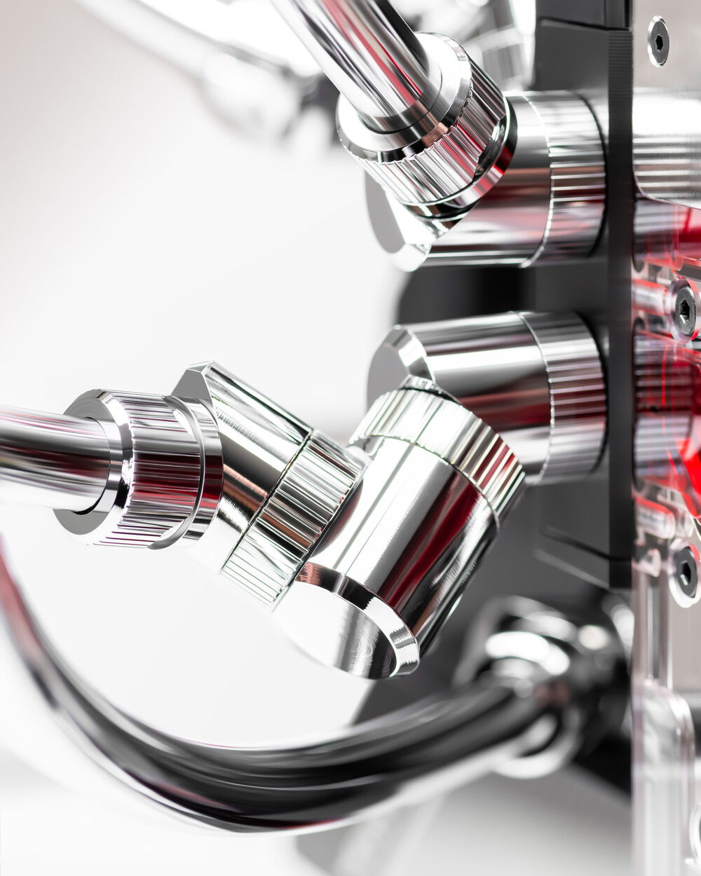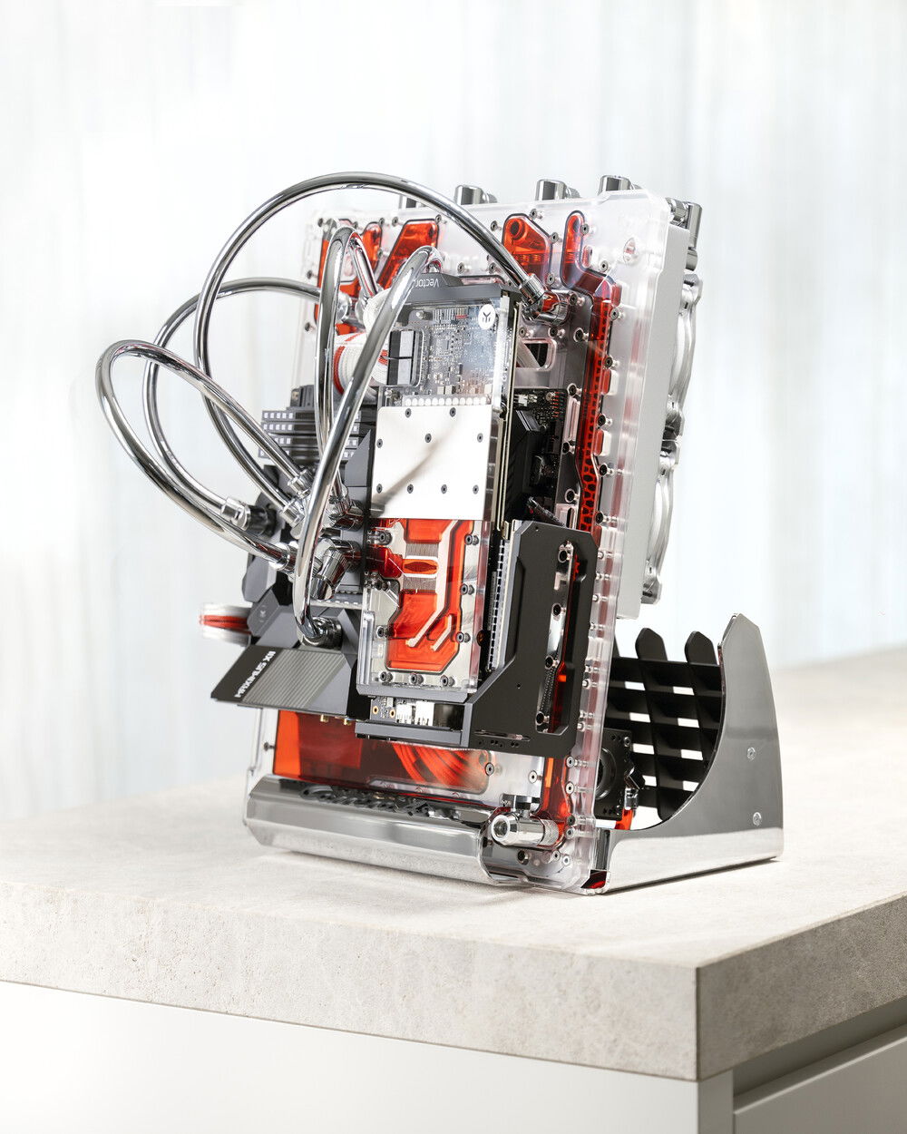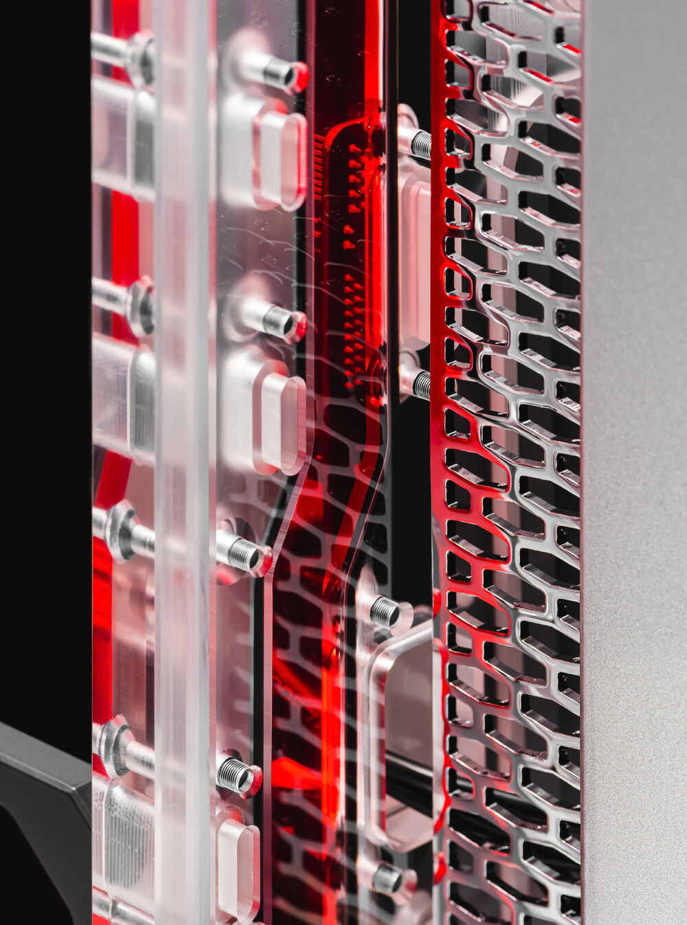 I finally made a project for myself that will be used for 3D drawing, graphics, and independent activities. I am a huge Porsche enthusiast so I took inspiration from the grill of the Porsche 992 Carrera S. This idea was further developed into a custom chrome base with built-in grill and led strips. further, a silver/chrome/red color theme was fleshed out by a custom paintjob that subtly accents the fans, radiators, custom cable sleeves and grill. The tubing reflects abstraction and organic forms that look great in a clean and minimalistic office.