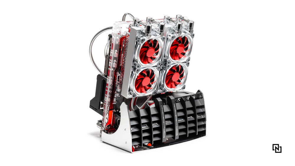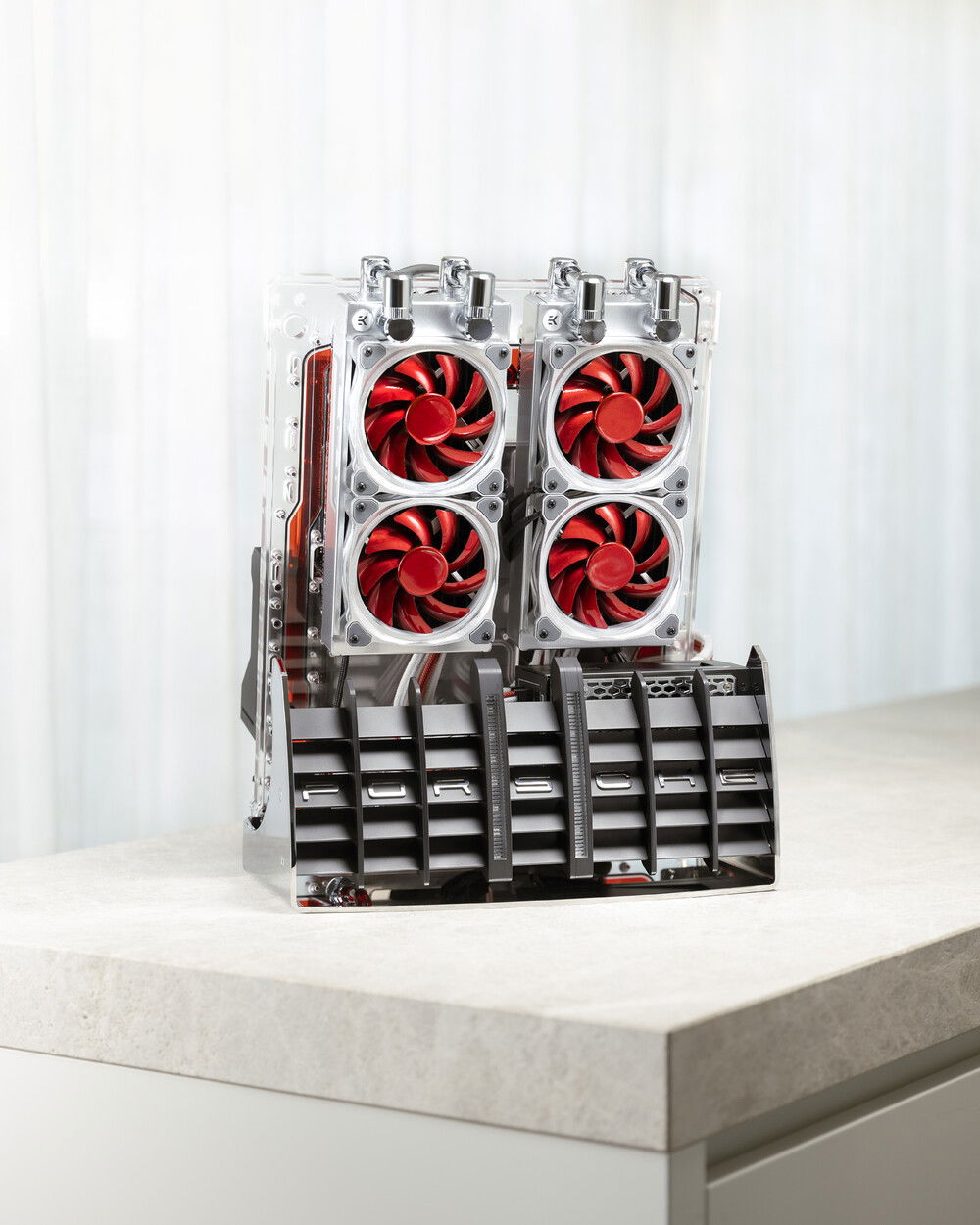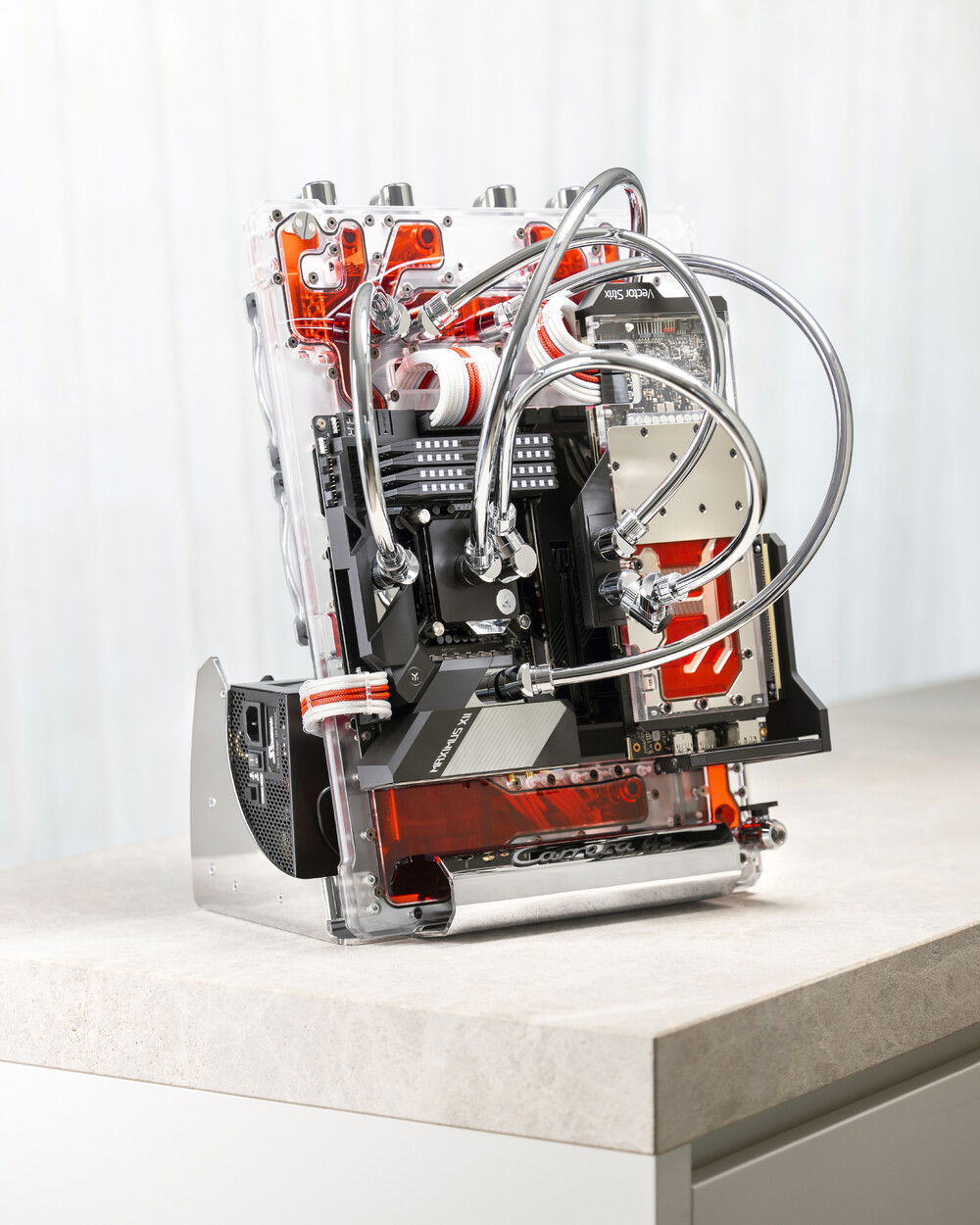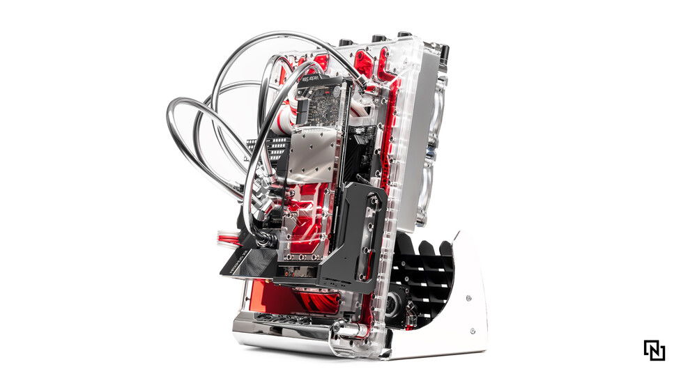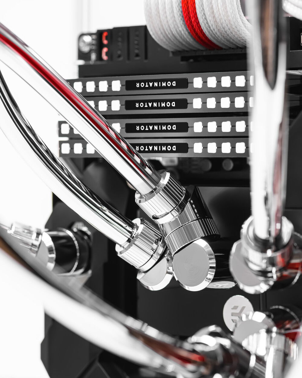 I finally made a project for myself that will be used for 3D drawing, graphics, and independent activities. I am a huge Porsche enthusiast so I took inspiration from the grill of the Porsche 992 Carrera S. This idea was further developed into a custom chrome base with built-in grill and led strips. further, a silver/chrome/red color theme was fleshed out by a custom paintjob that subtly accents the fans, radiators, custom cable sleeves and grill. The tubing reflects abstraction and organic forms that look great in a clean and minimalistic office.